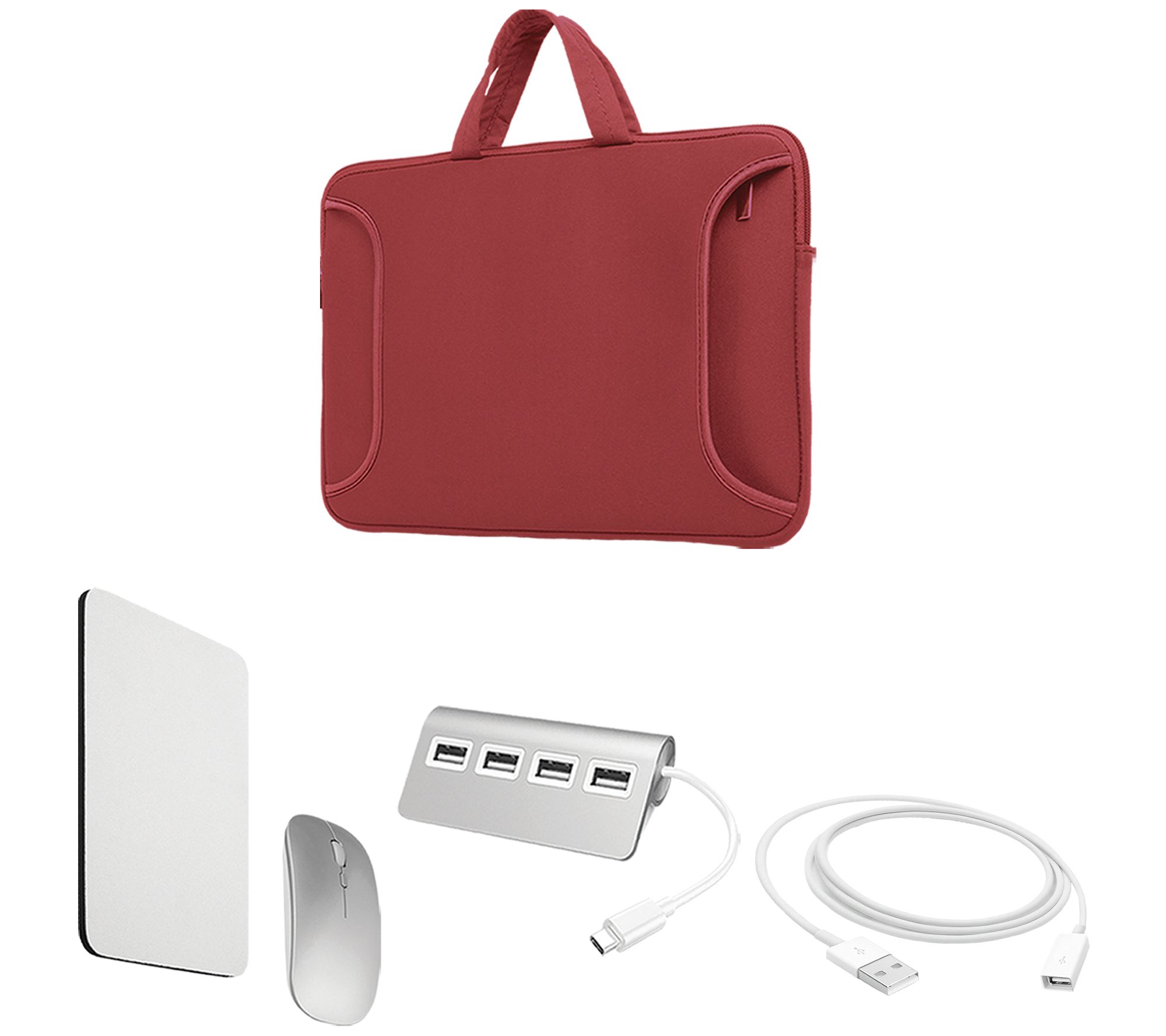Includes refurbished MacBook Pro with MagSafe 2 power adapter, power cord, and wall plug; carry case, wireless mouse, mousepad, 4-port USB hub, and extension cable
