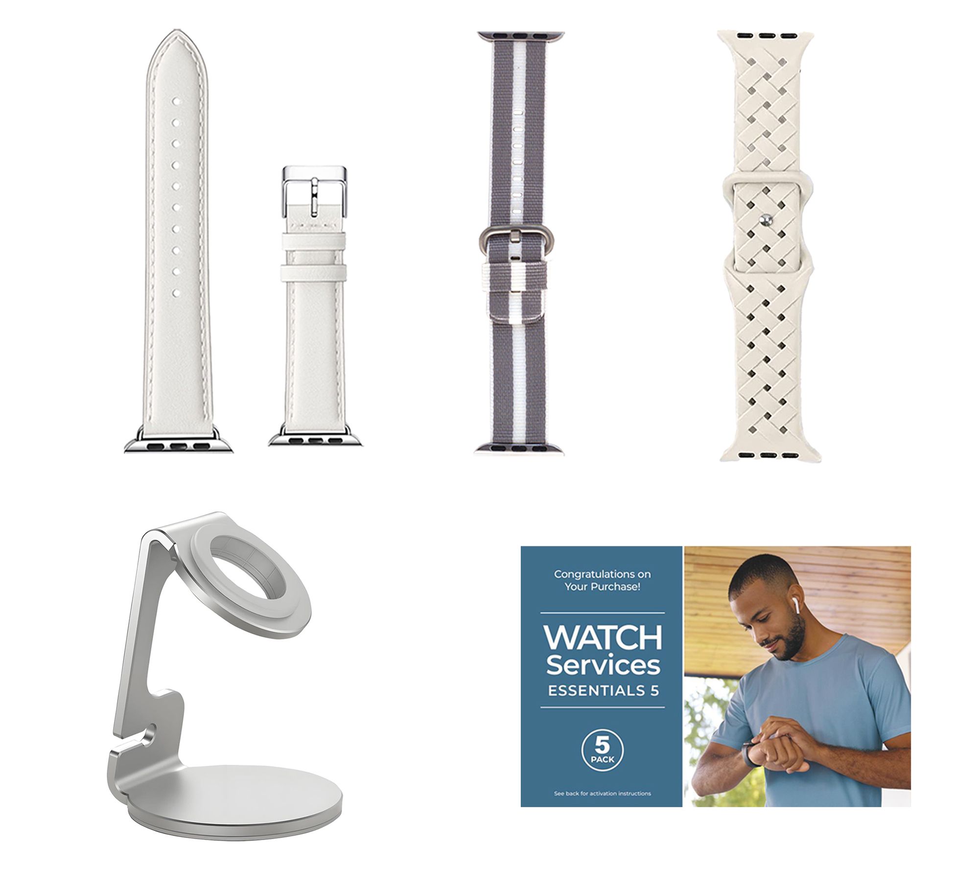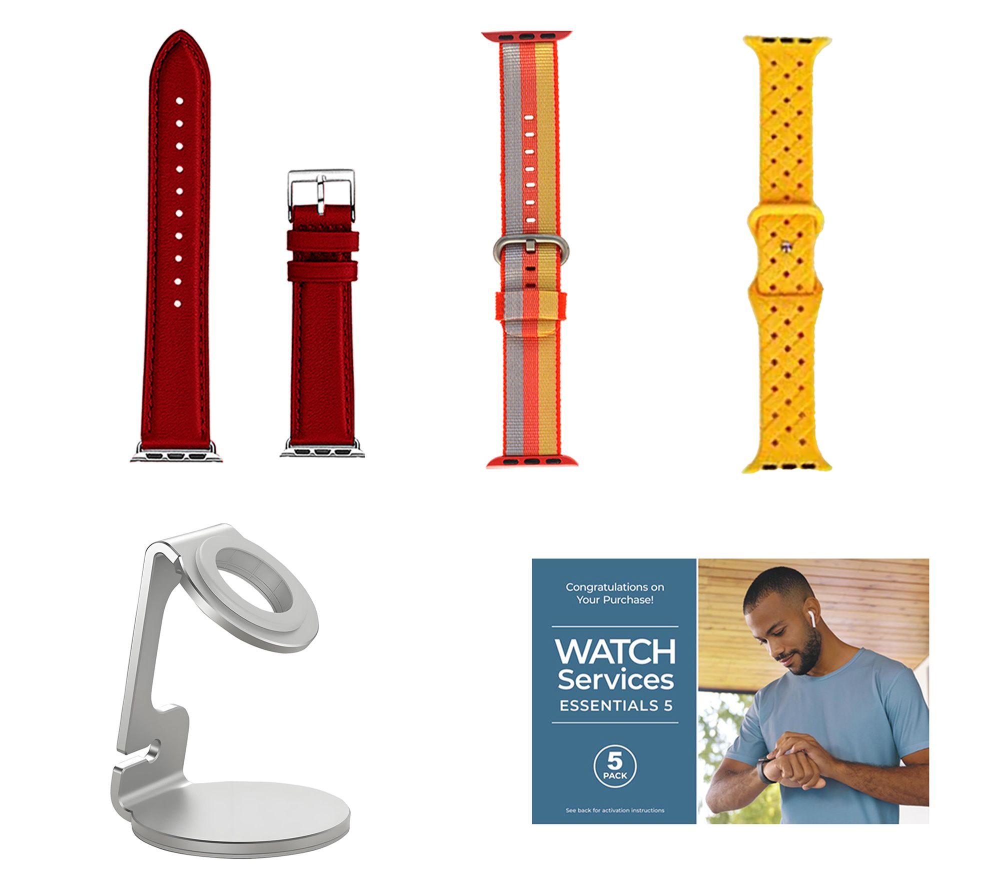 Includes Apple Watch Series 10 42mm with small/medium band and magnetic charging cable; charging stand, leather band, silicone woven band, nylon stripe band, and voucher