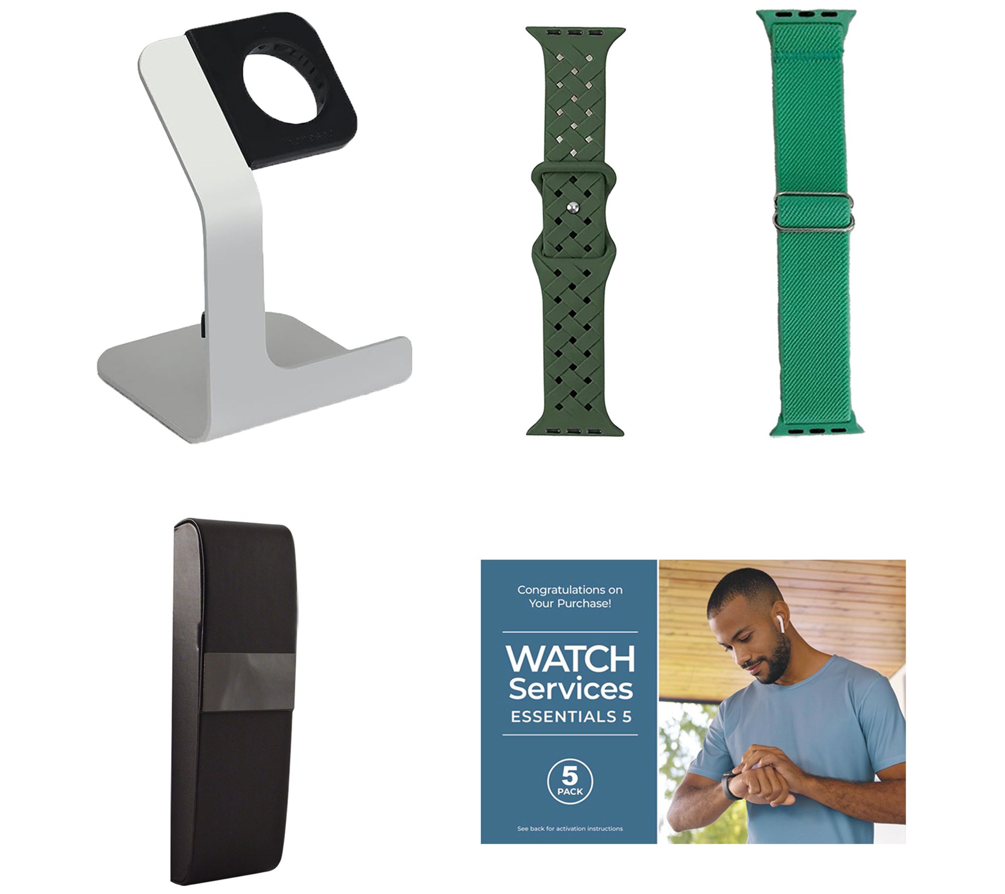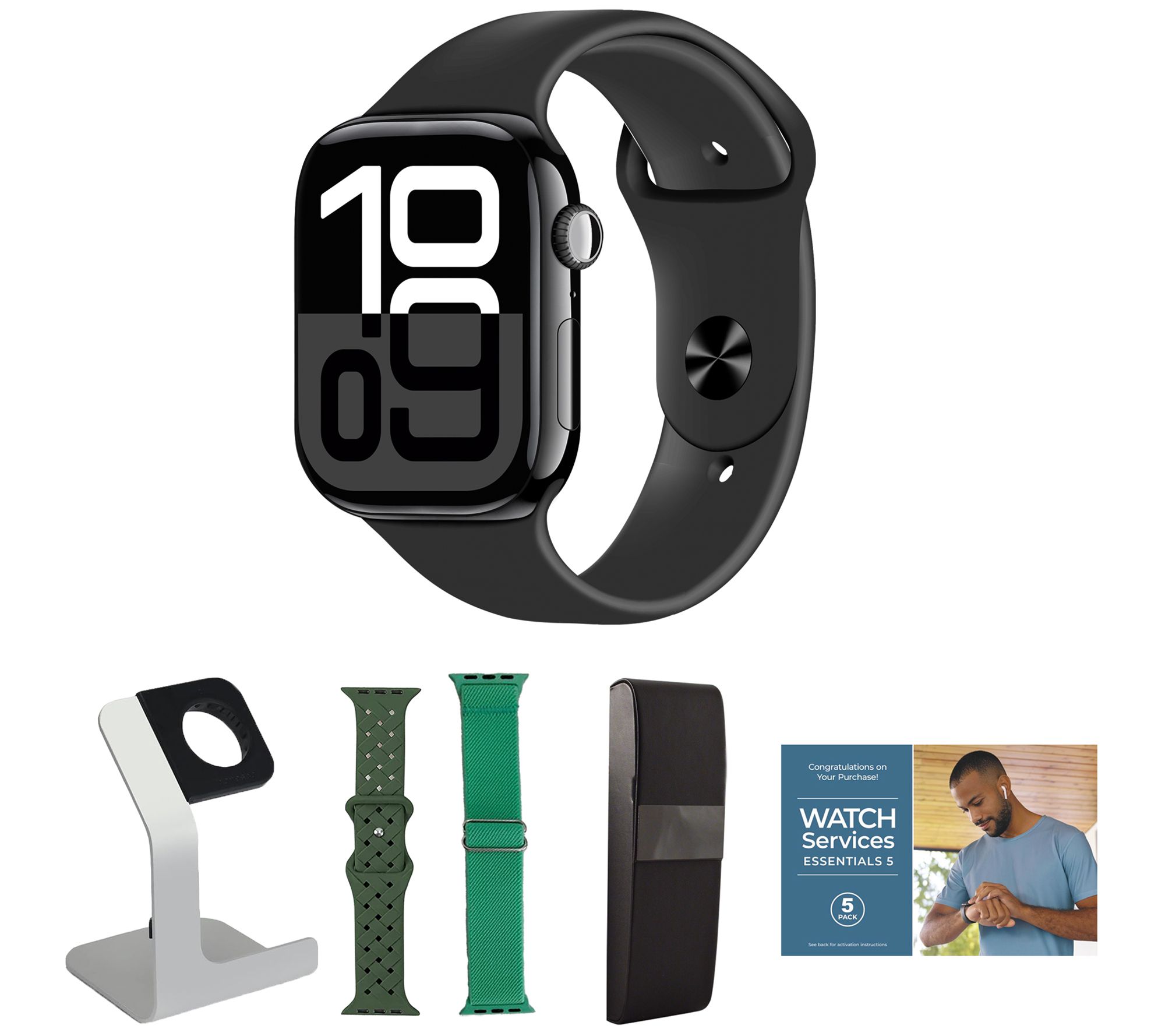 Includes Apple Watch Series 10 42mm with medium/large band and magnetic charging cable; stand, perforated silicone band, stretch nylon band, hard case, and voucher