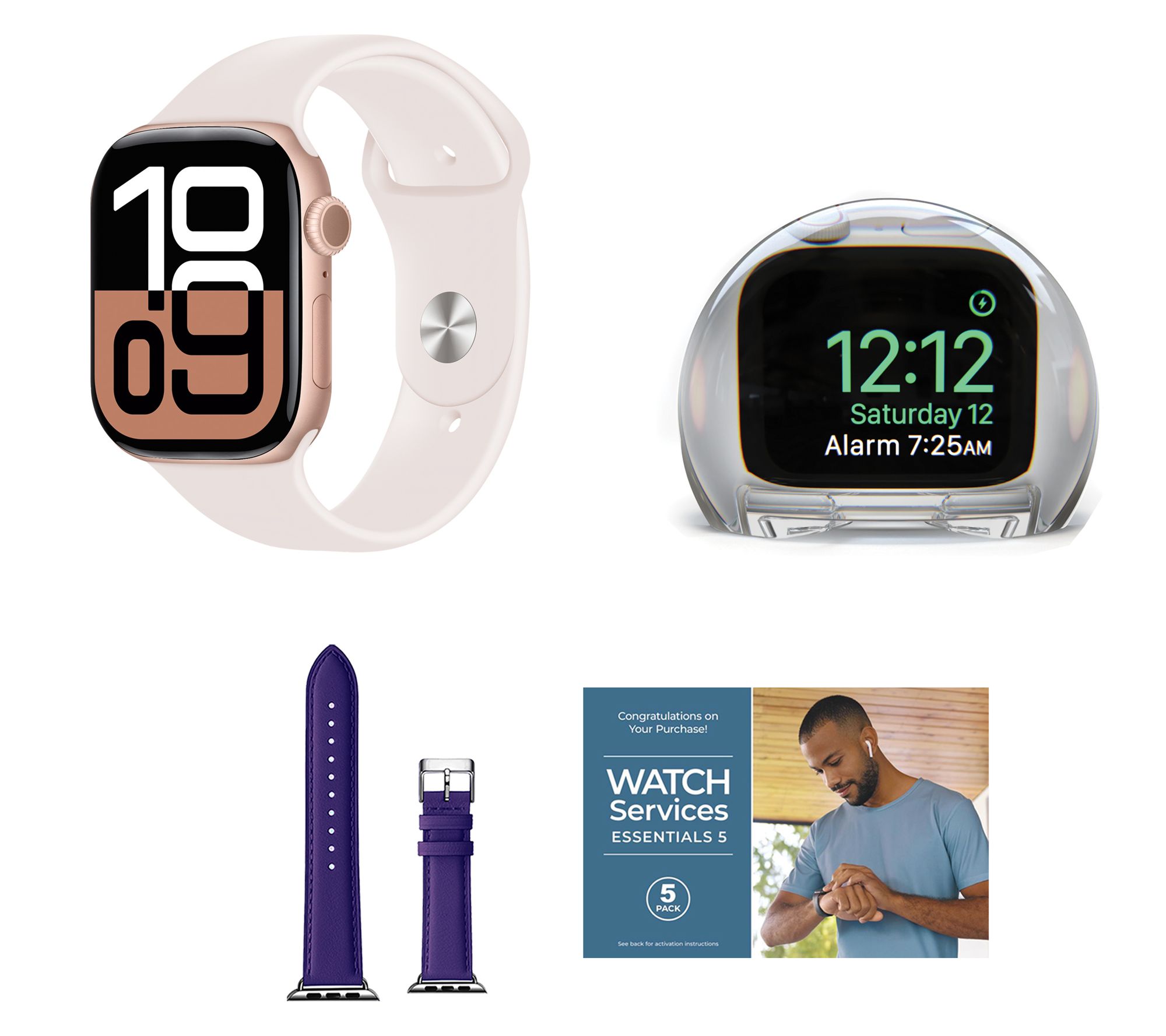 Includes Apple Watch Series 10 42mm with small/medium band and magnetic charging cable; leather band, Nightwatch dock amplifier, and voucher