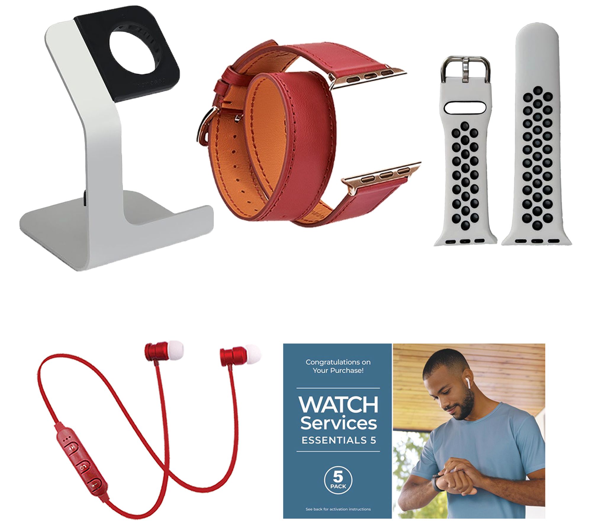 Includes Apple Watch Series 10 42mm with Sport Loop band and magnetic charging cable; stand, leather band, woven silicone sport band, Bluetooth earbuds, and voucher