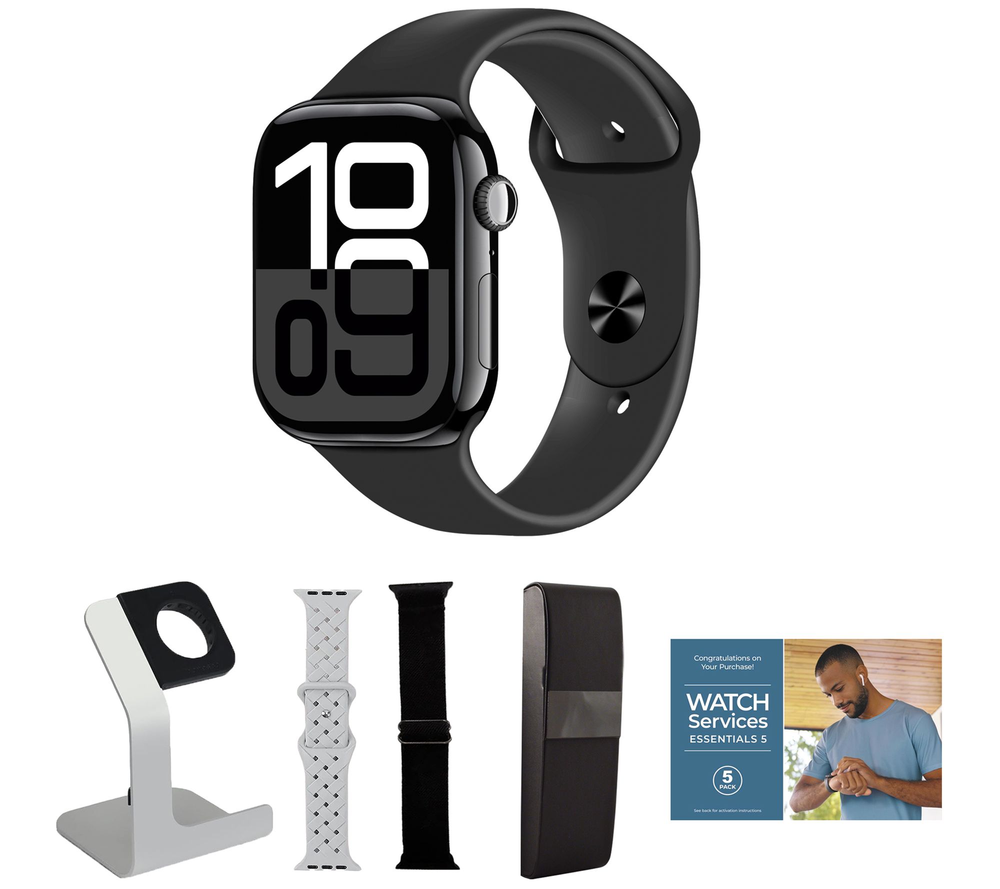 Includes Apple Watch Series 10 46mm with medium/large band and magnetic charging cable; stand, perforated silicone band, stretch nylon band, hard case, and voucher