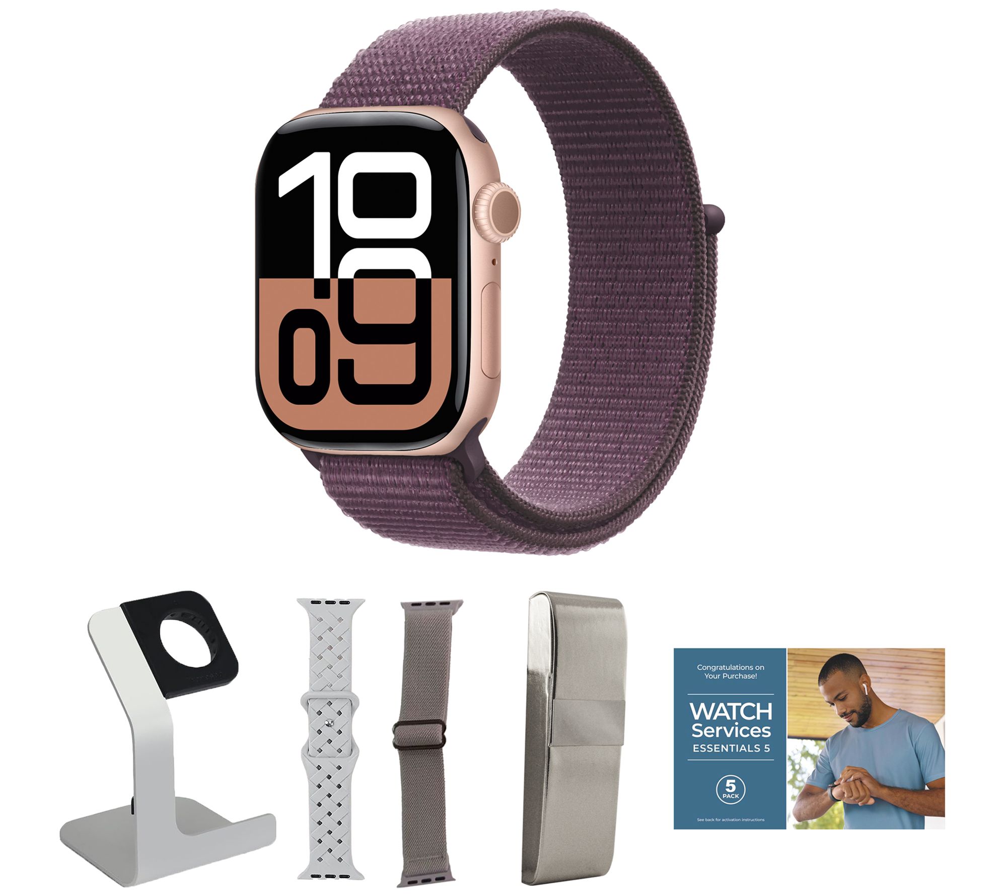 Includes Apple Watch Series 10 46mm with Sport Loop band and magnetic charging cable; stand, perforated silicone band, stretch nylon band, hard case, and voucher