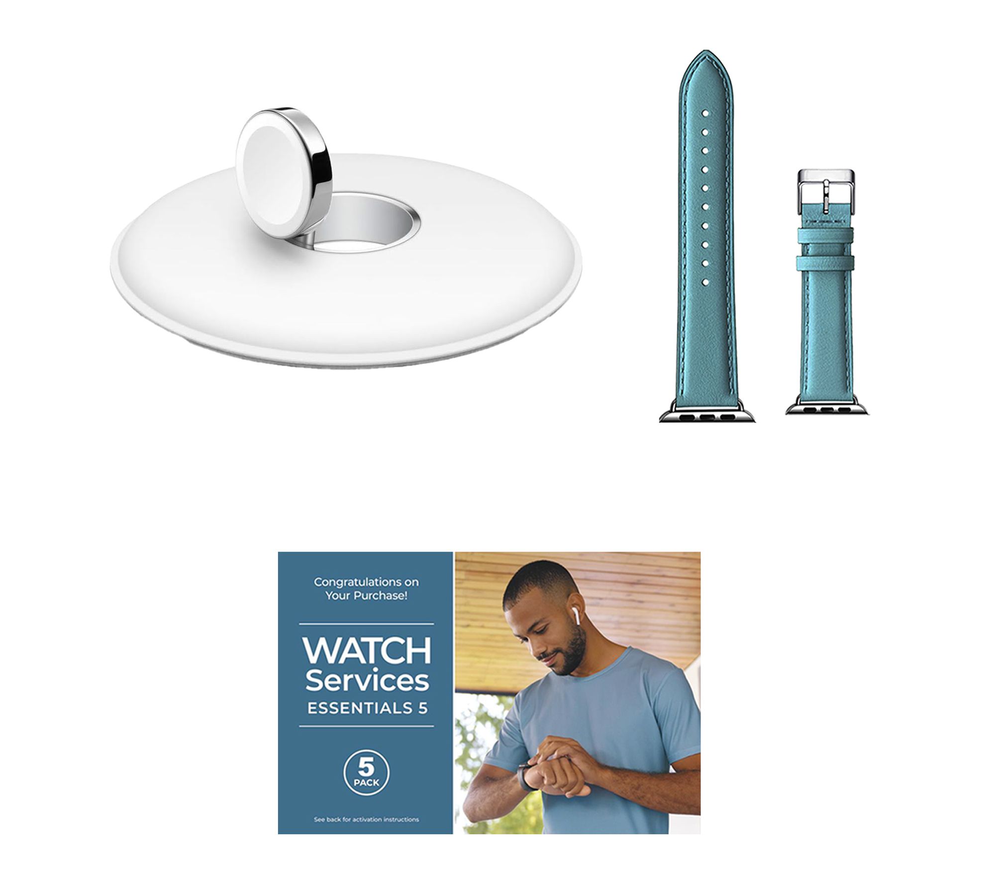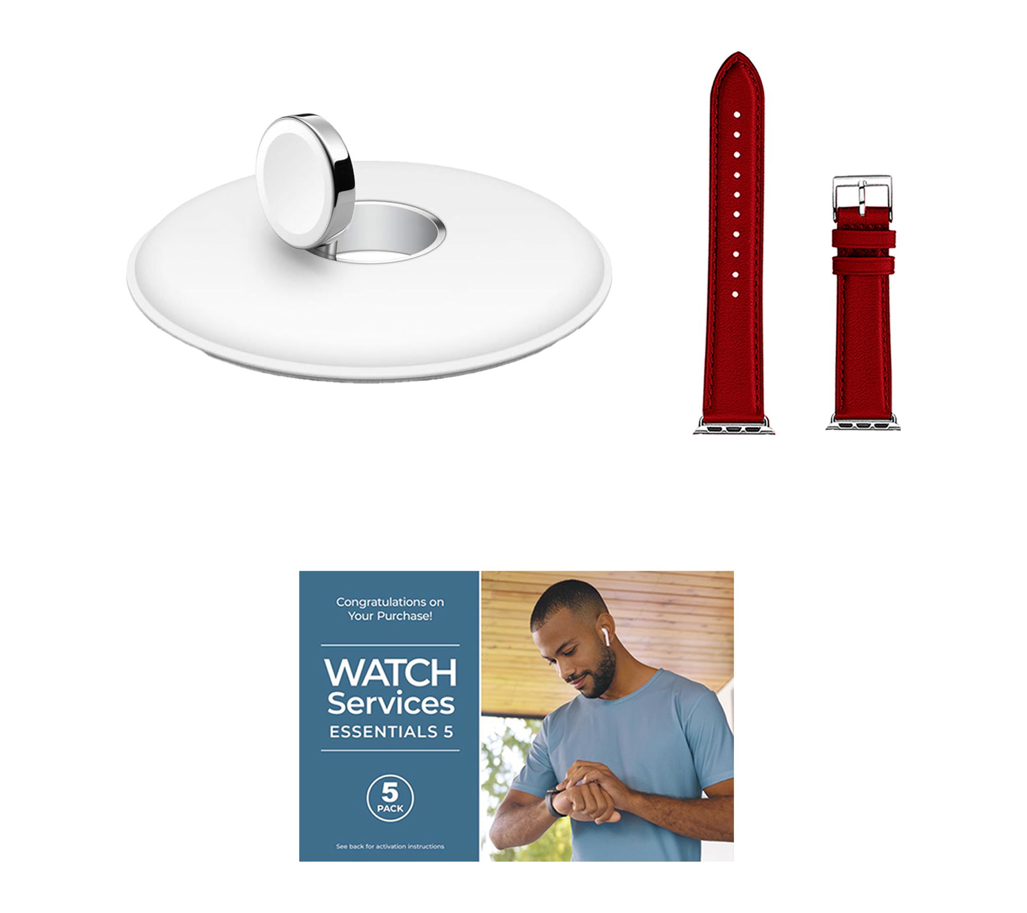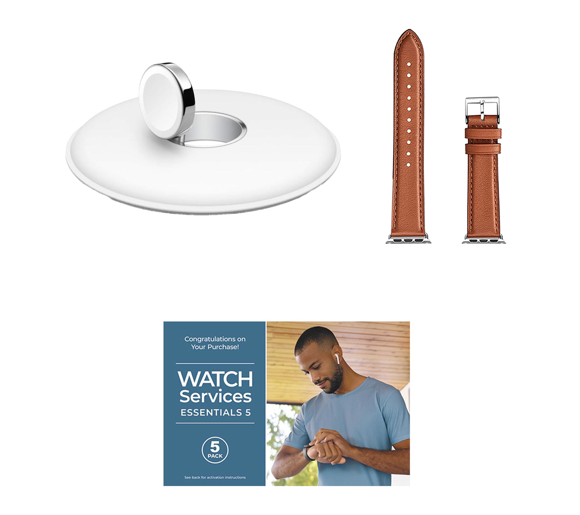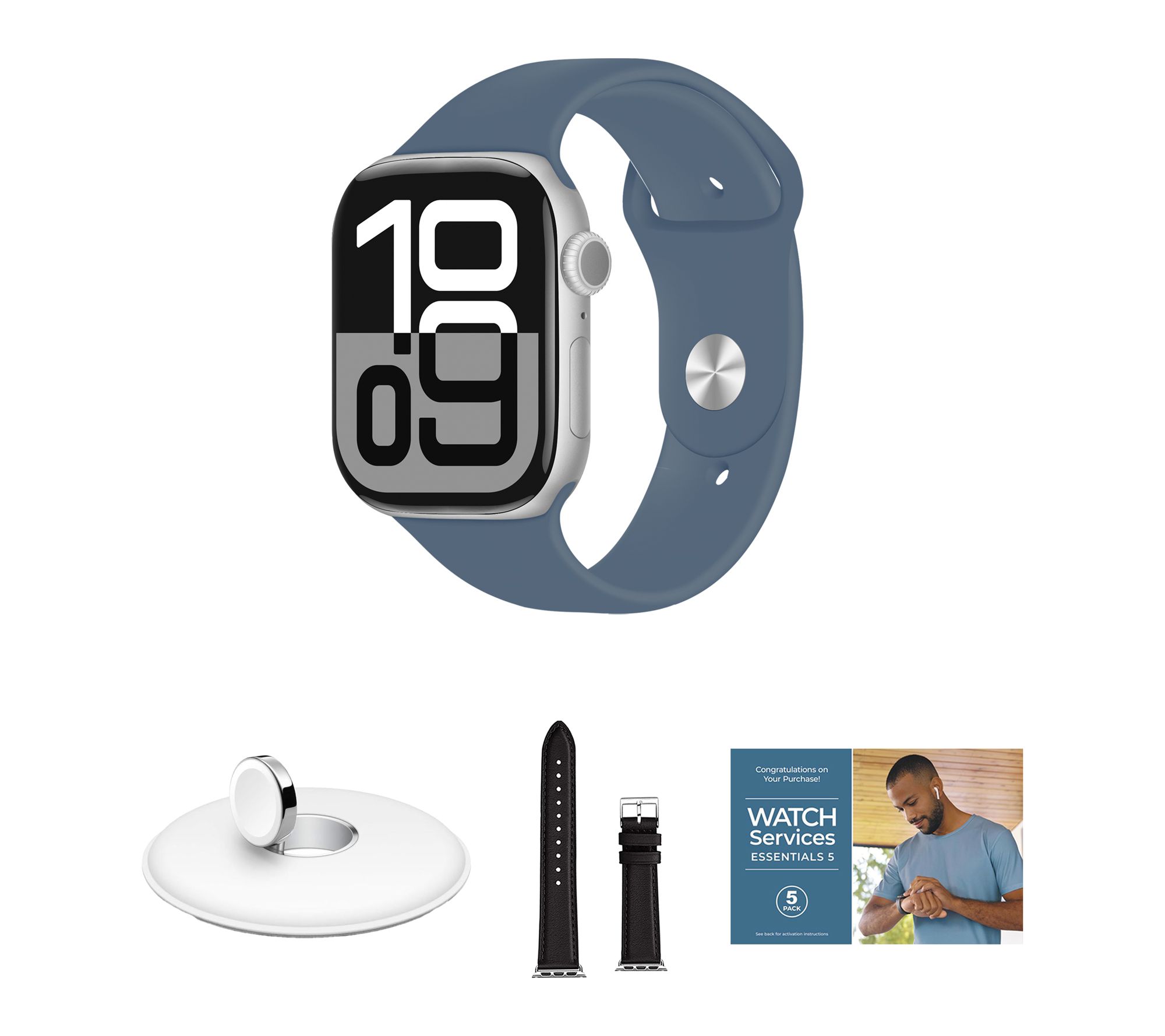 Includes Apple Watch Series 10 46mm with medium/large band and magnetic charging cable; charging dock, leather band, and voucher