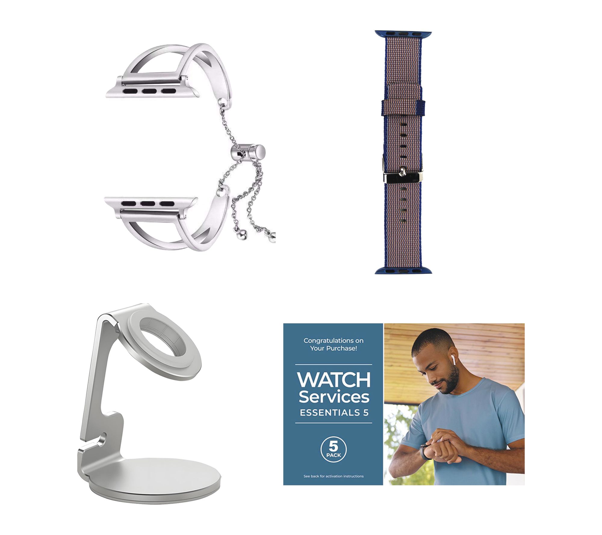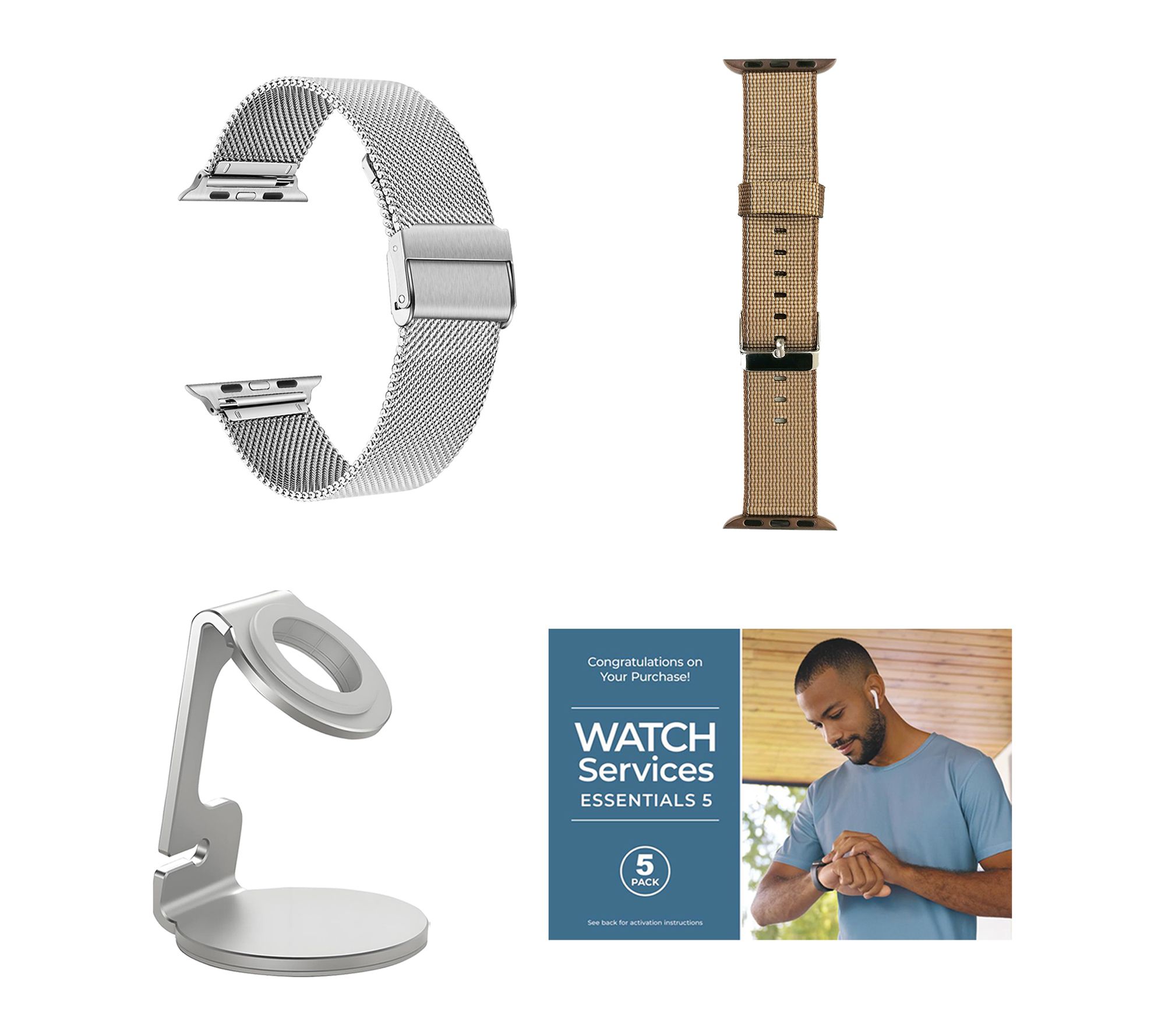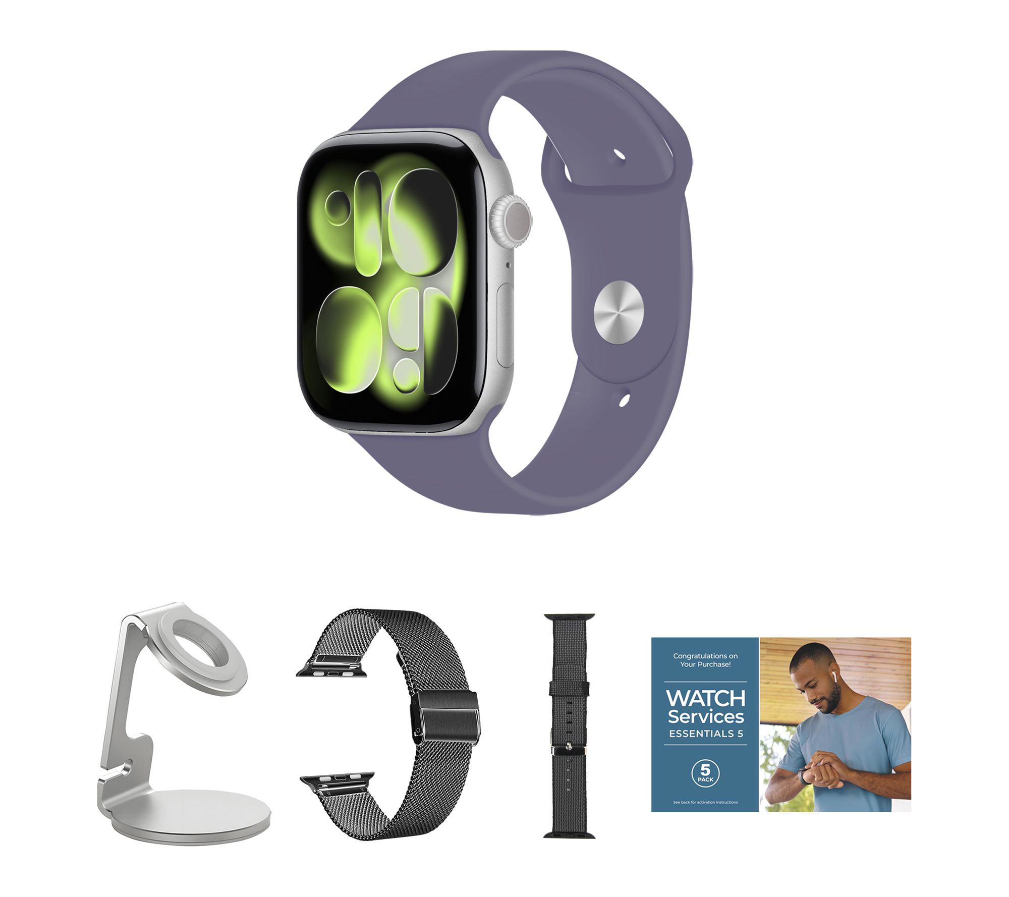 • Includes Apple Watch Series 11 46mm with small/medium band and magnetic charging cable; watch case, stand, stainless steel band, nylon band, voucher