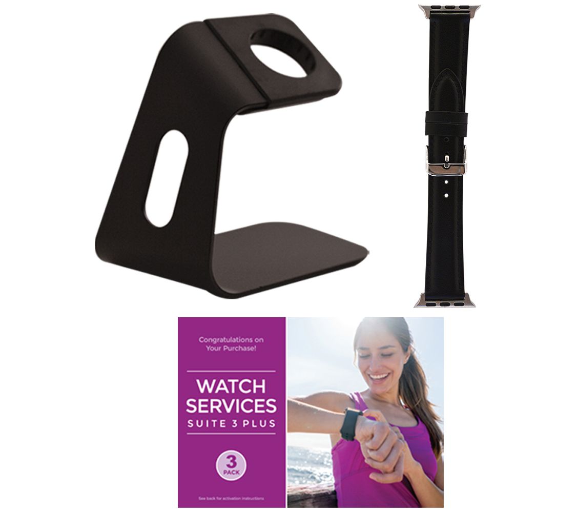 Includes Apple Watch Series 3 38mm with Sport band, magnetic charging cable, and USB power adapter; leather band, aluminum charging stand, and voucher