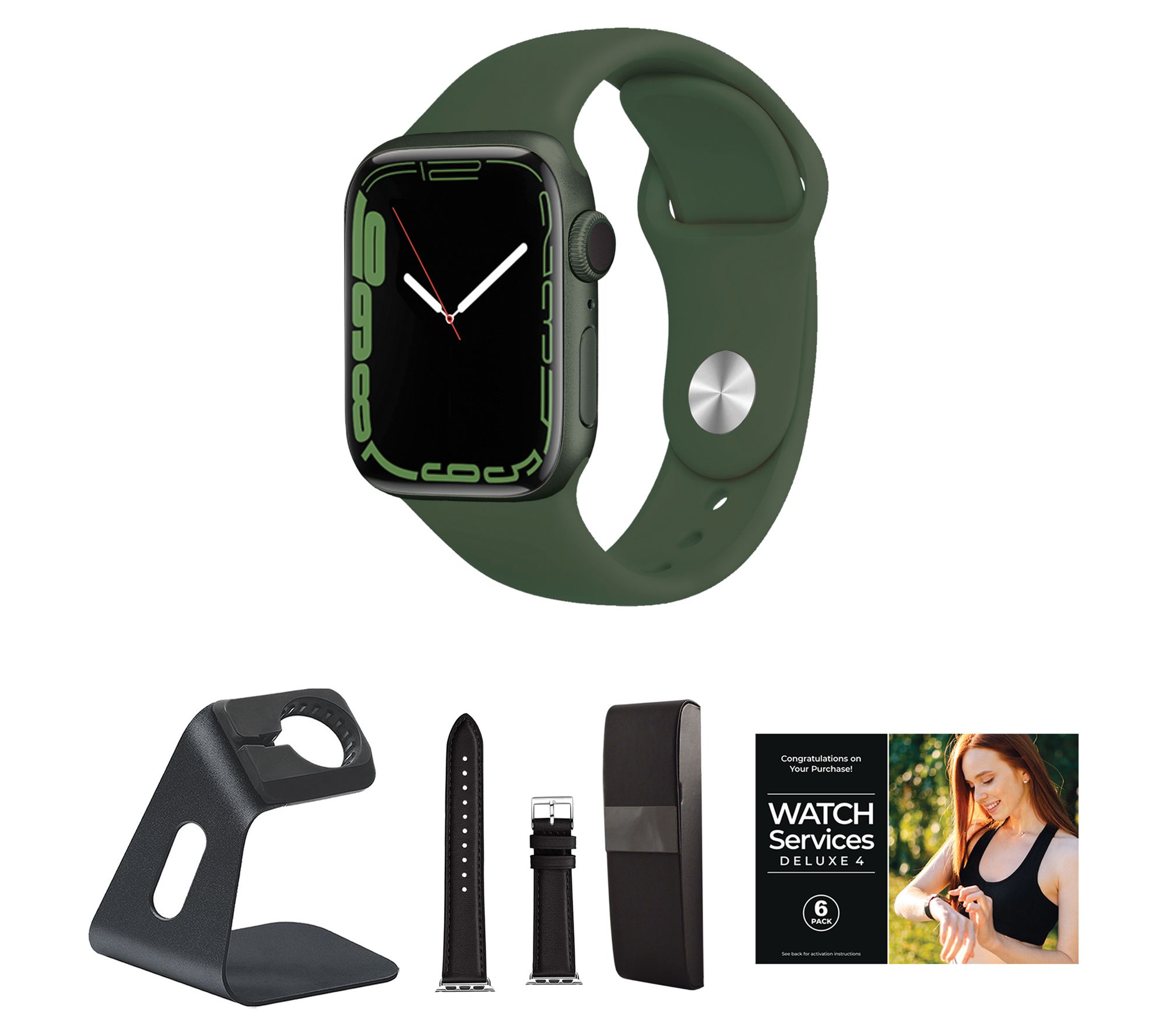 Includes Apple® Watch Series 7 41mm smartwatch with band and magnetic charging cable; charging stand, leather band, carry case, and voucher