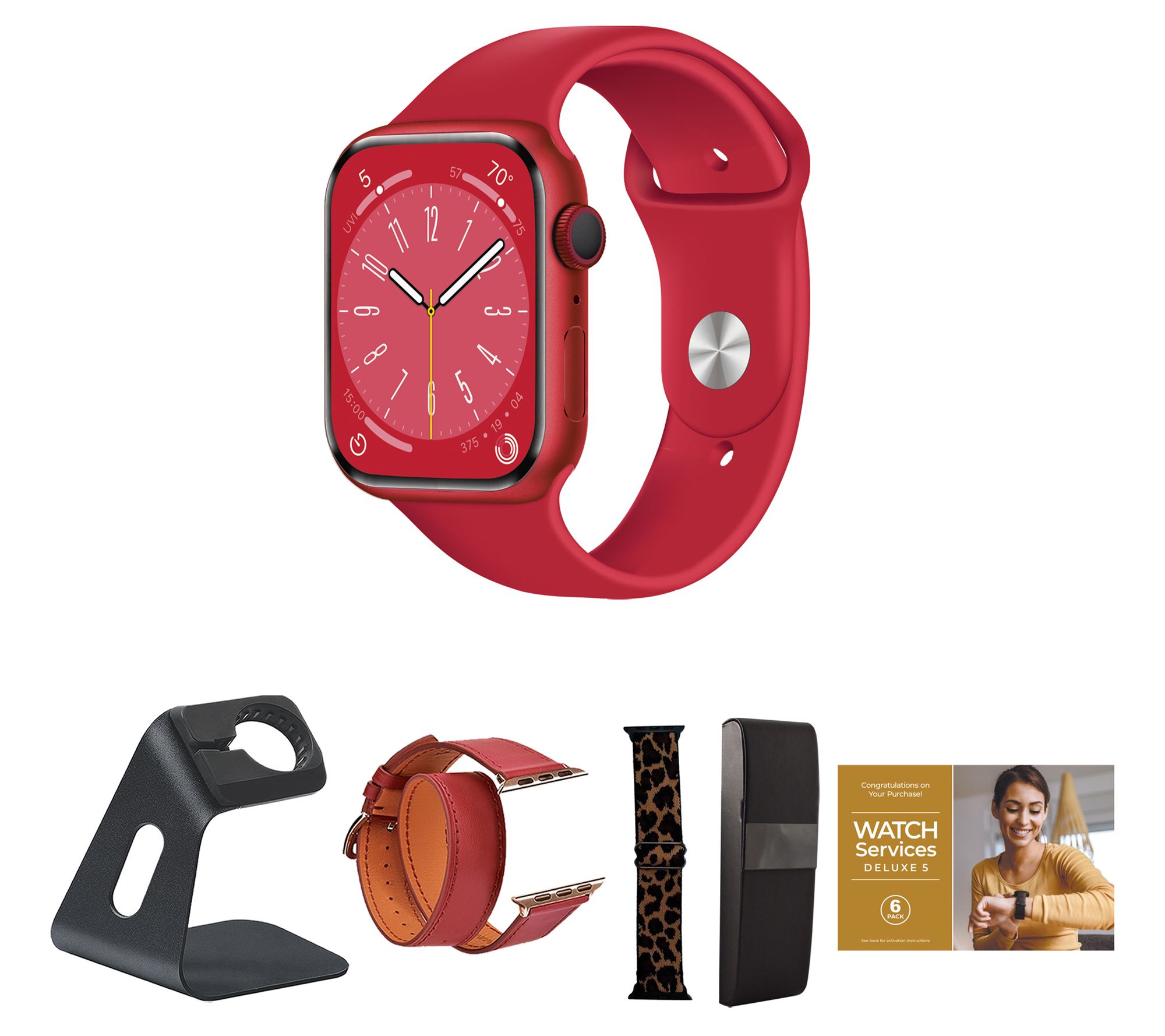 Includes Apple Watch Series 8 41mm with medium/large band and magnetic charging cable; double wrap leather band, nylon stretch band, hard carry case, charging stand, and voucher