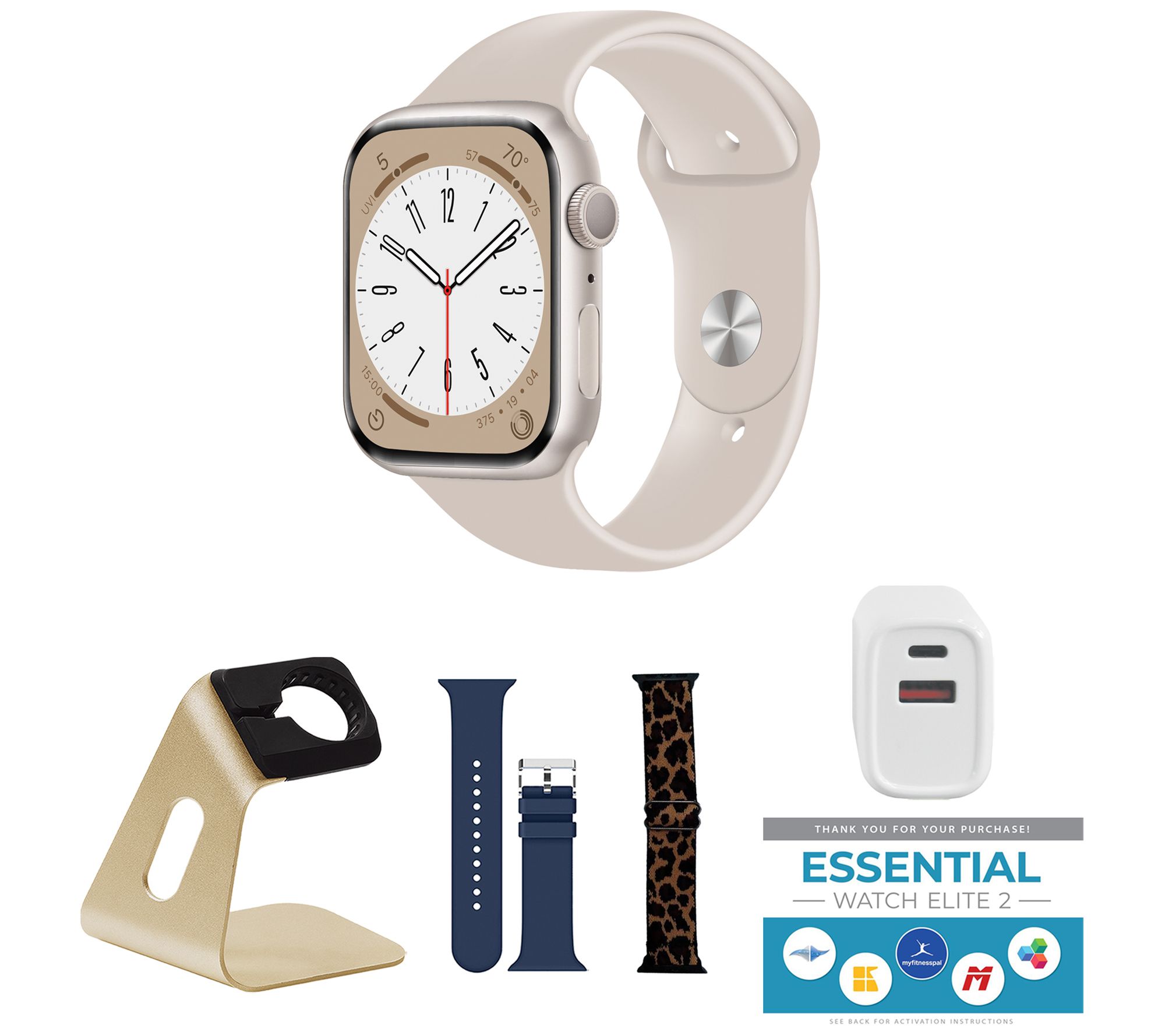 Includes Apple Watch Series 8 45mm with medium/large band and magnetic charging cable; charging stand, silicone sport band, nylon band, two-port wall charger, and voucher