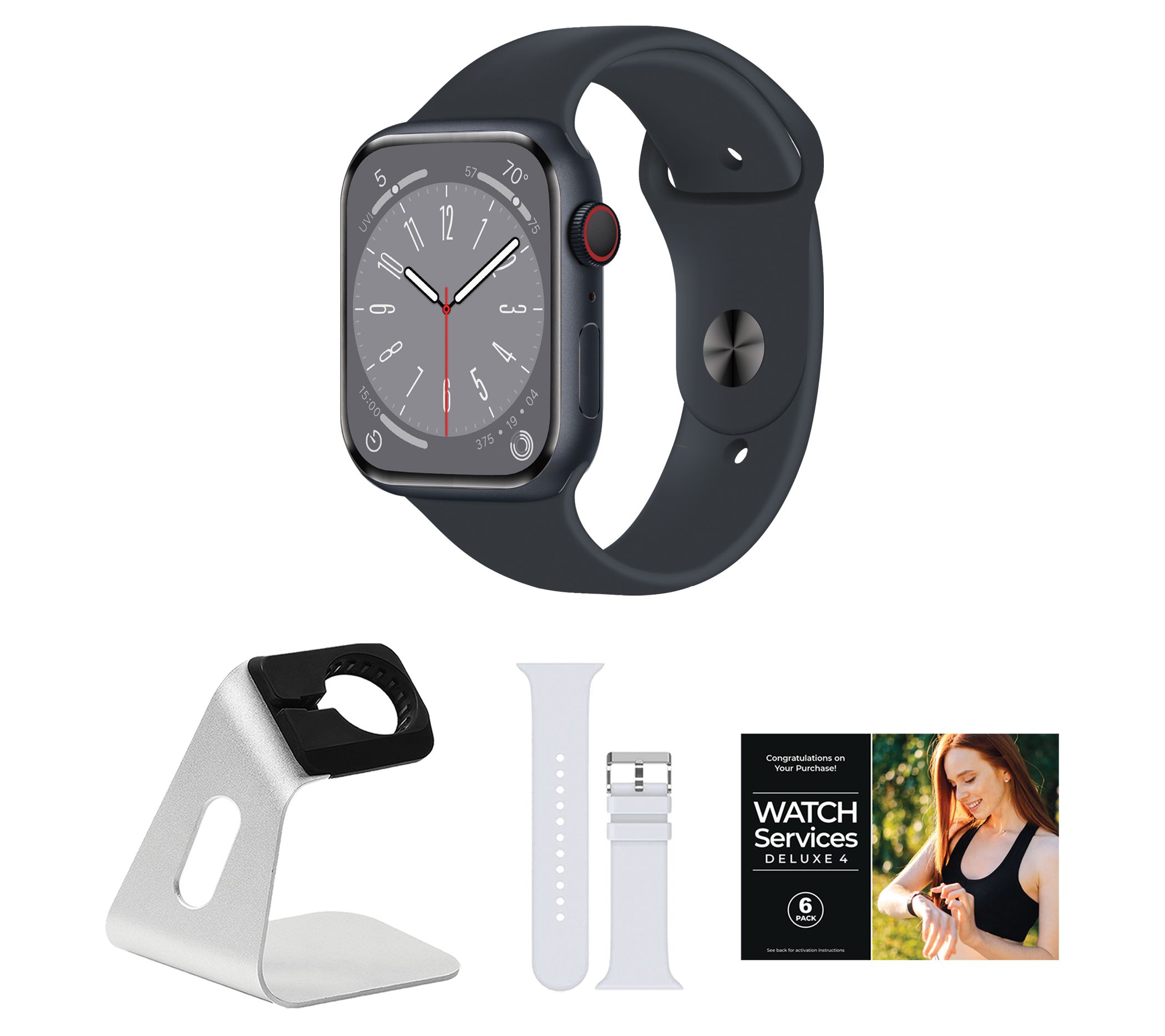 Includes Apple Watch Series 8 45mm with medium/large band and magnetic charging cable; charging stand, additional band, and voucher