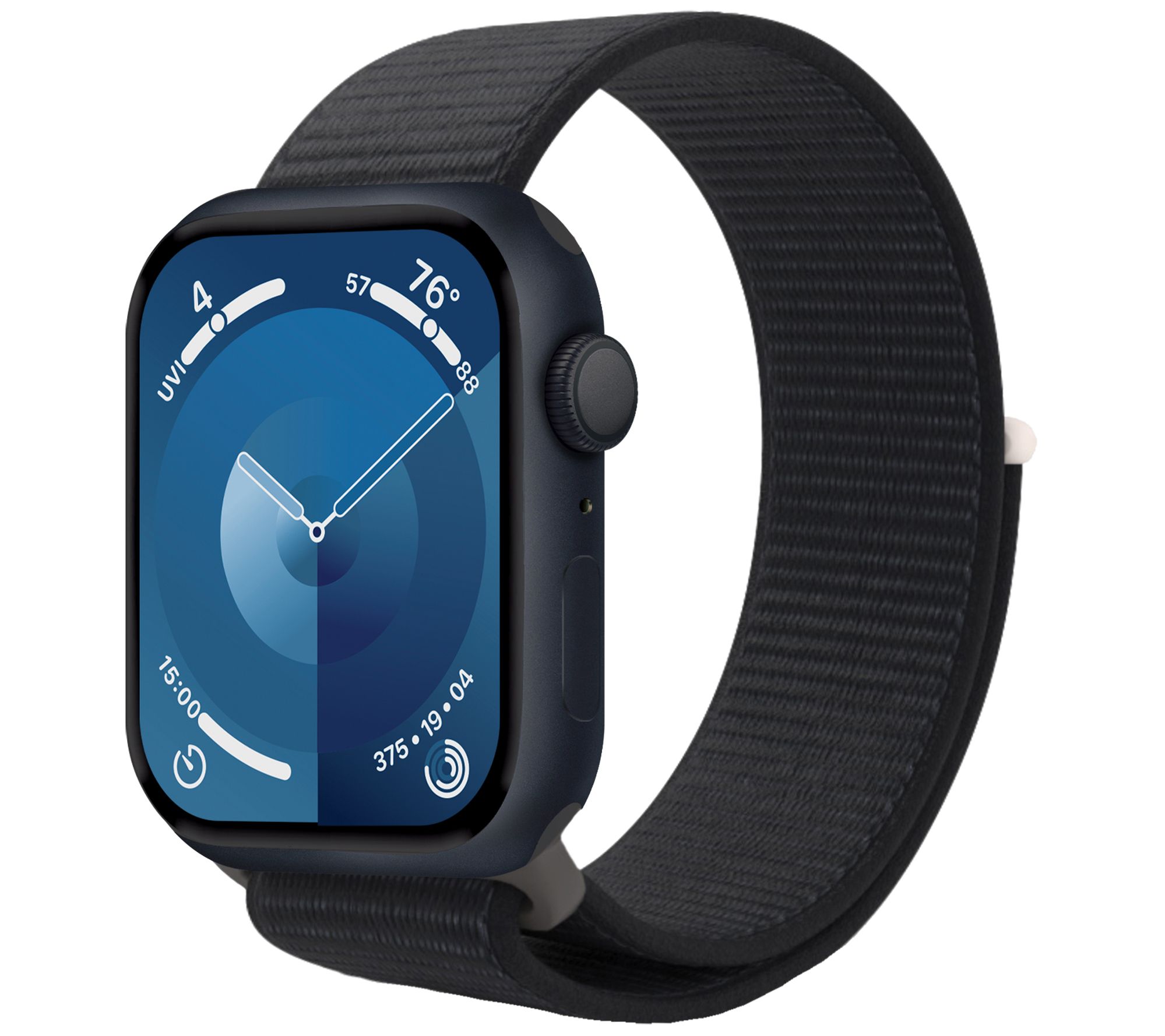 Includes Apple Watch Series 9 41mm smartwatch with sport loop band and magnetic charging cable; charging stand, nylon sport band, stainess steel band, hard carry case, and voucher