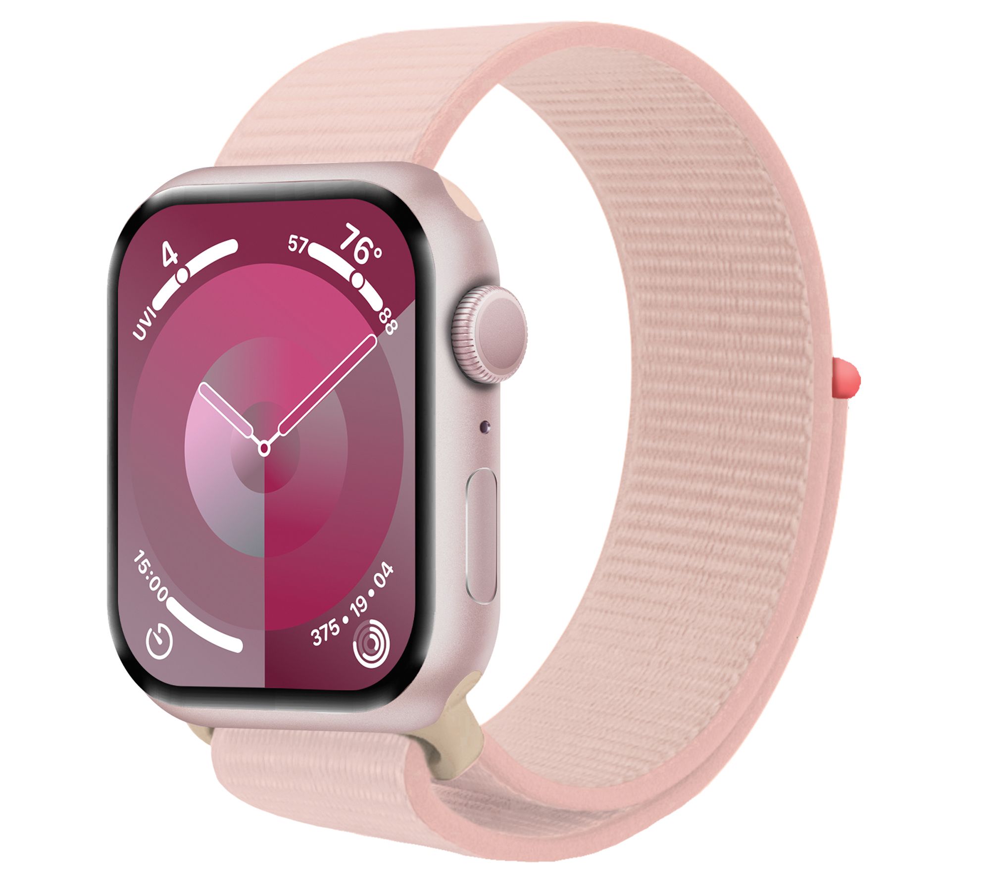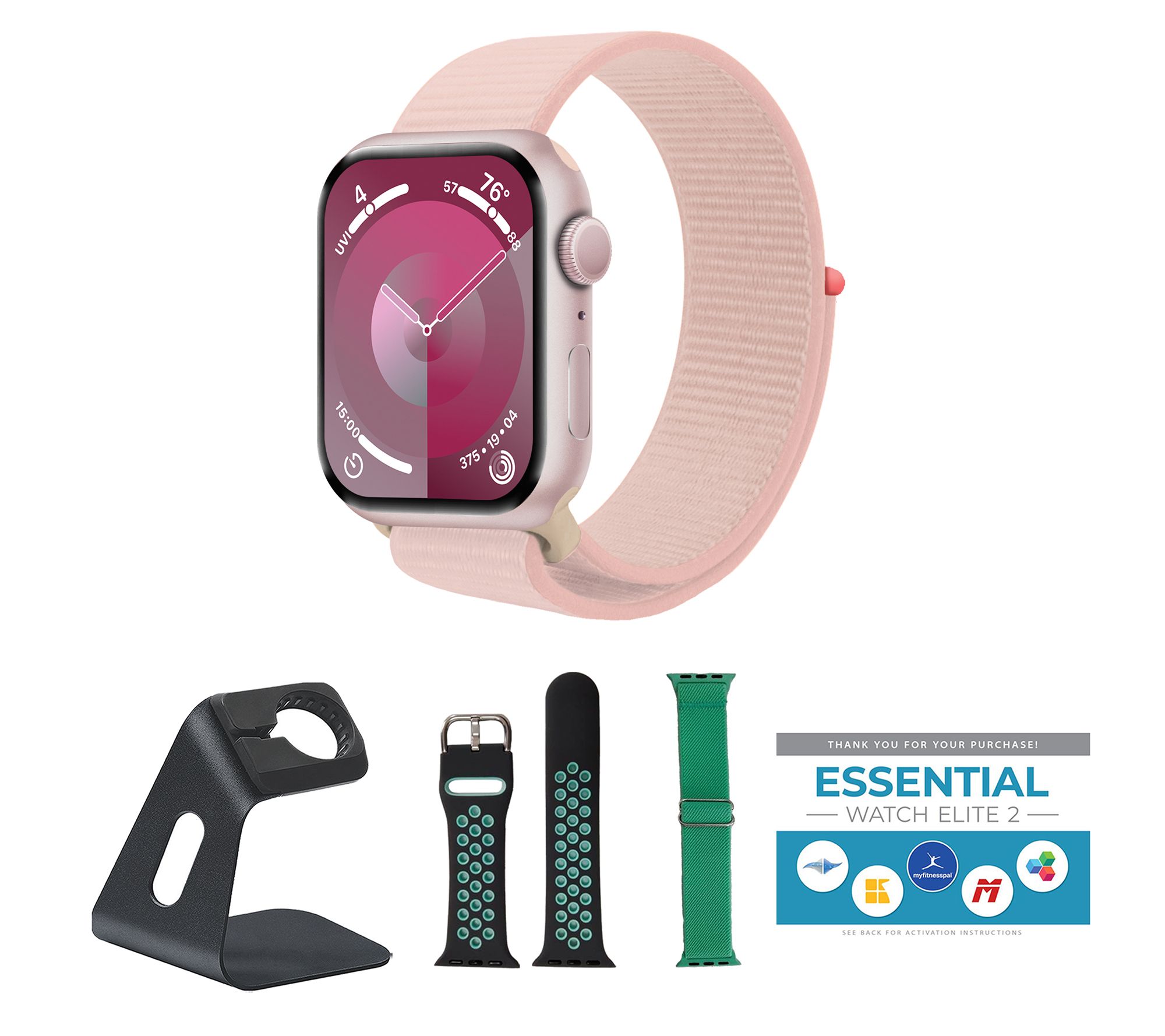 Includes Apple Watch Series 9 45mm with Sport Loop band and magnetic charging cable; charging stand, stretch nylon band, perforated silicone sport band, and voucher