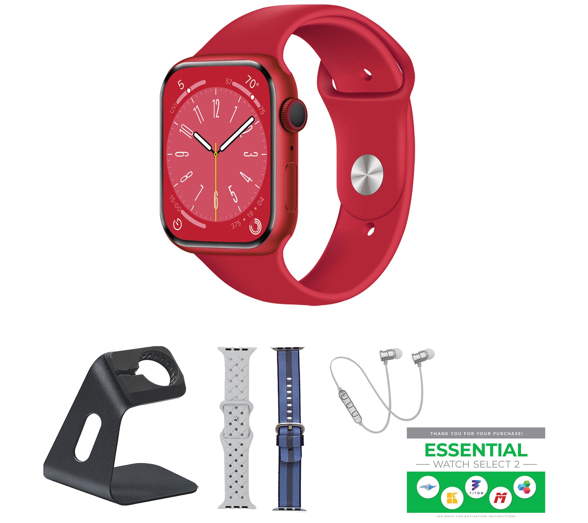 Includes Apple Watch Series 9 45mm with medium/large band and magnetic charging cable; stand, stretch nylon band, woven silicone sport band, Bluetooth earbuds, and voucher