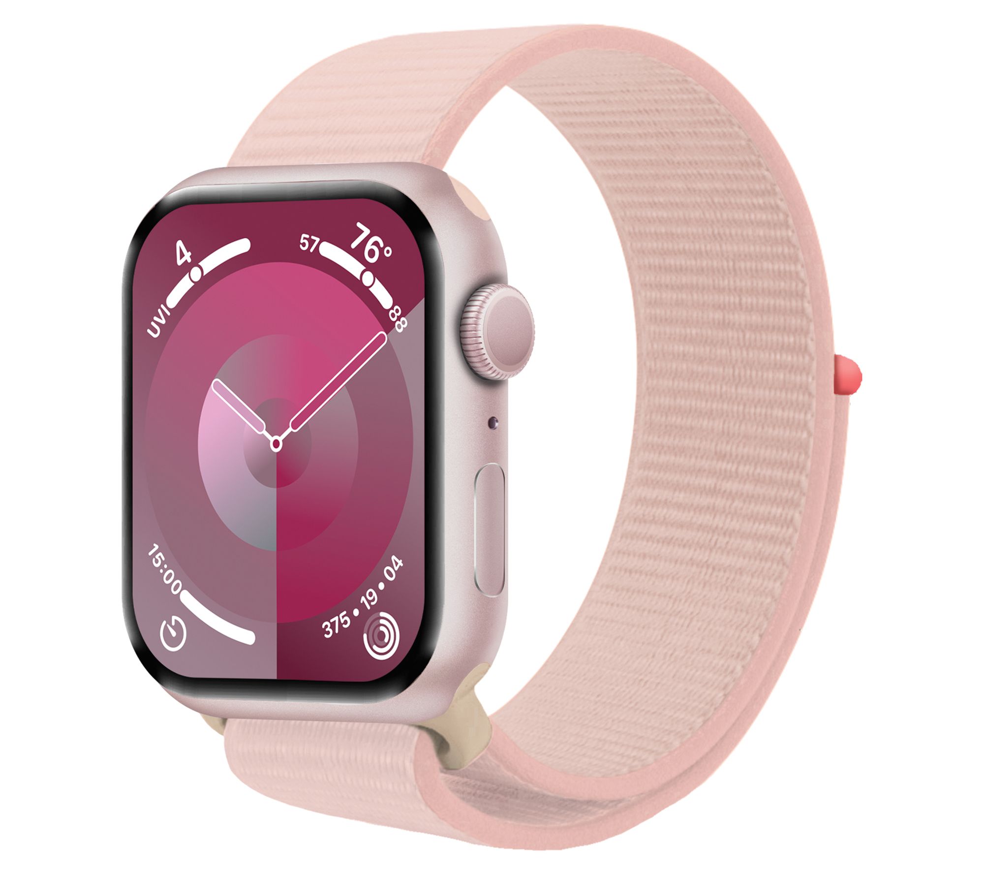 Includes Apple Watch Series 9 45mm with Sport Loop band and magnetic charging cable; stand, carry case, stretch nylon band, silicone sport band, and voucher