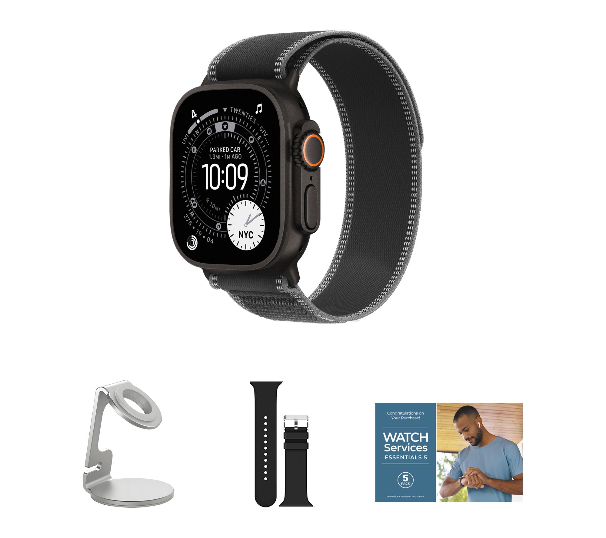 Includes Apple Watch Ultra 3 49mm with M/L Trail Loop band and magnetic charging cable; silicone band, watch stand, voucher