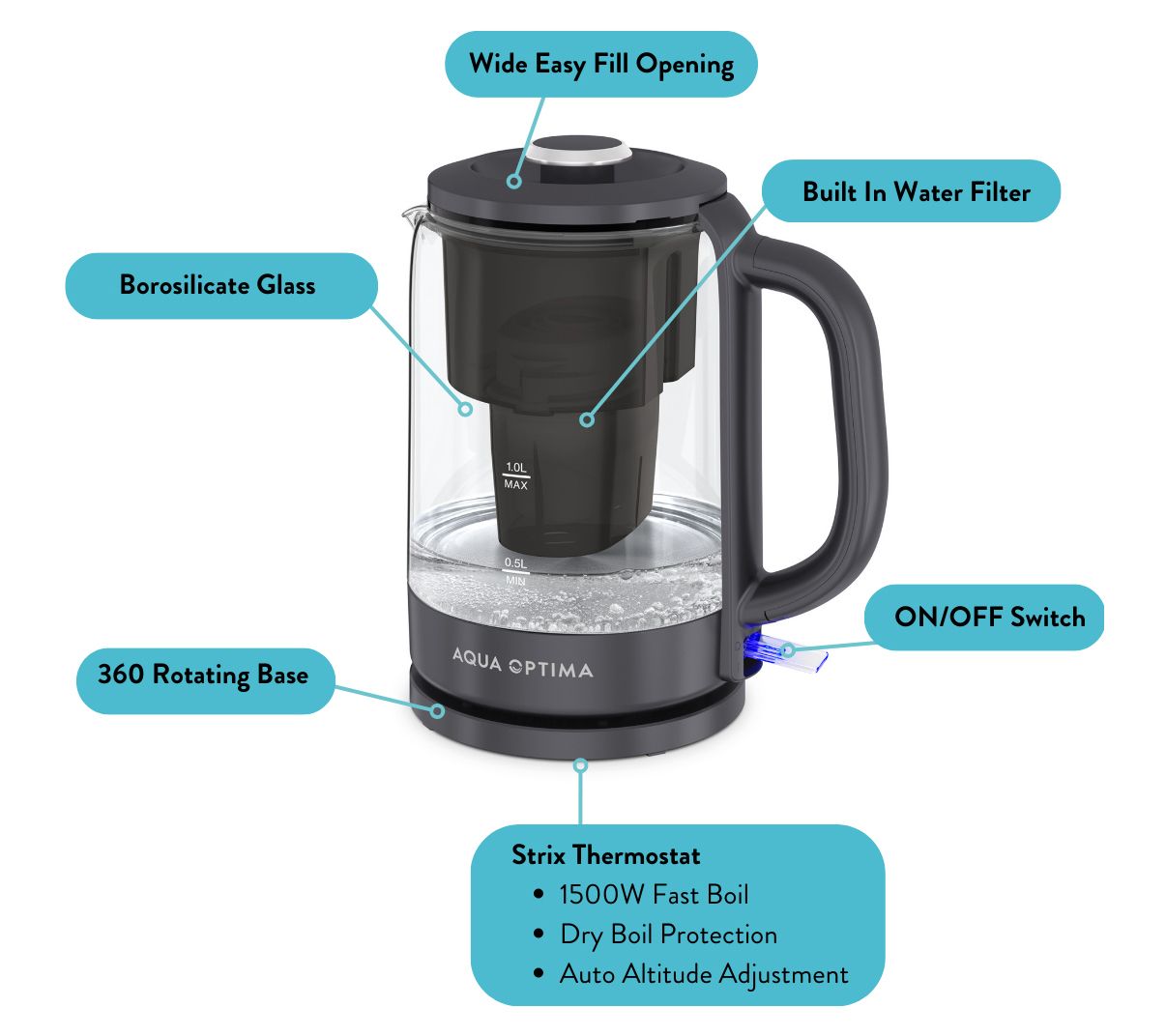 Aqua Optima Glass Electric Kettle w/ Water Filter, 1500W 1.7L