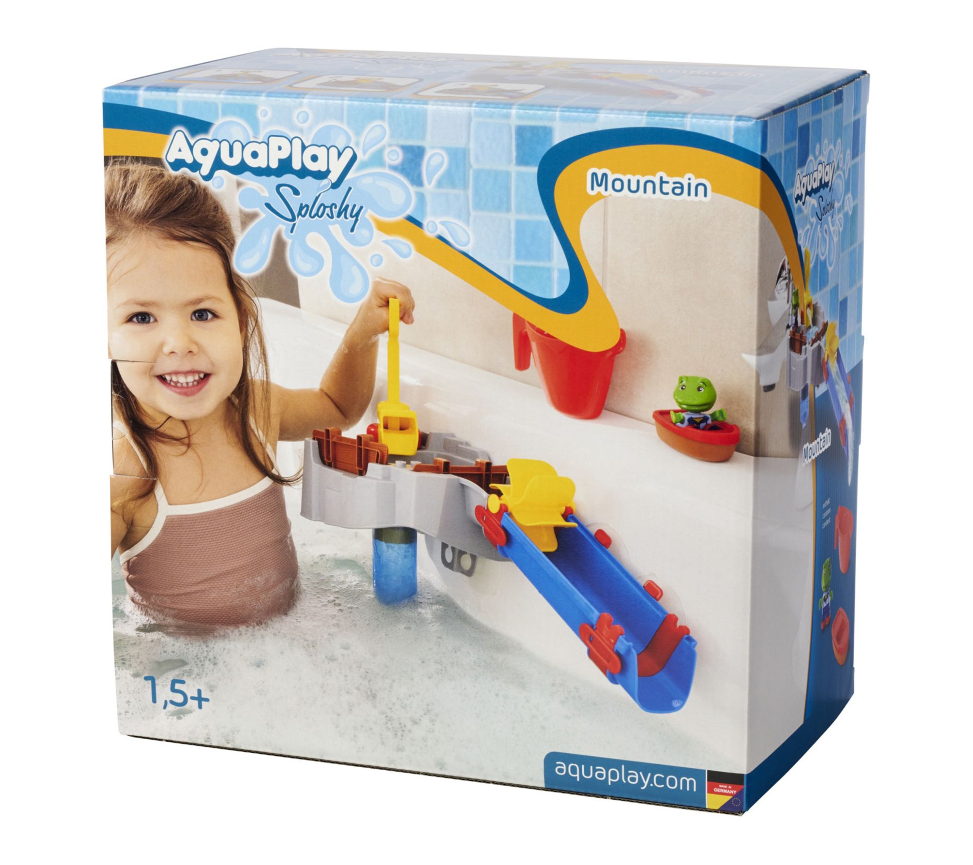 From backyard to bathtub, the Sploshy Mountain Bath Toy Set sparks curiosity with its imaginative water landscape -- complete with a reservoir, sluices, waterfall, water wheel, and slide. Kids can create endless aquatic adventures while building motor skills and exploring the wonders of water. From AquaPlay.