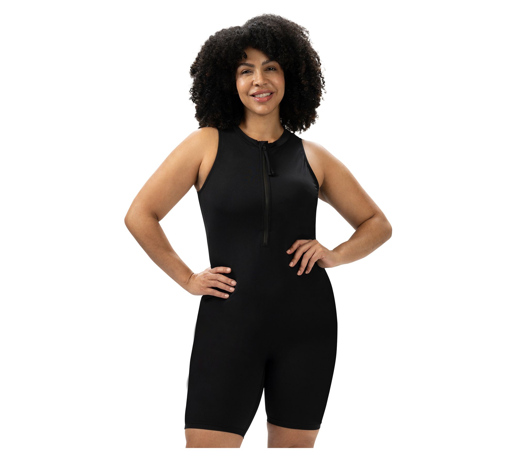 Features: UPF 50+, full-coverage design, mid-thigh leg, mock neck, adjustable zip-front closure, bust support with removable cups, mastectomy friendly with built-in prothesis pockets, resistant to chlorine and pilling