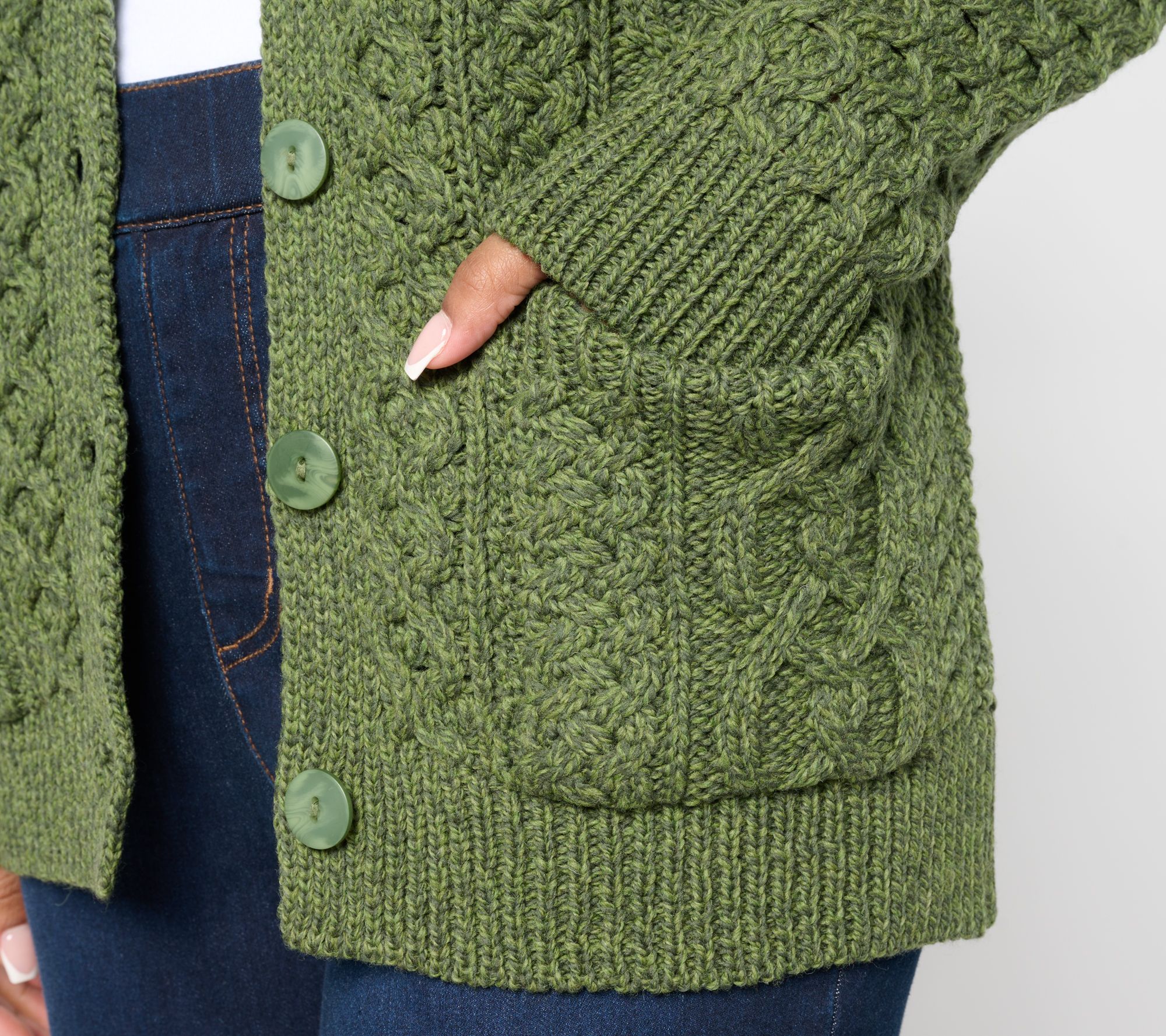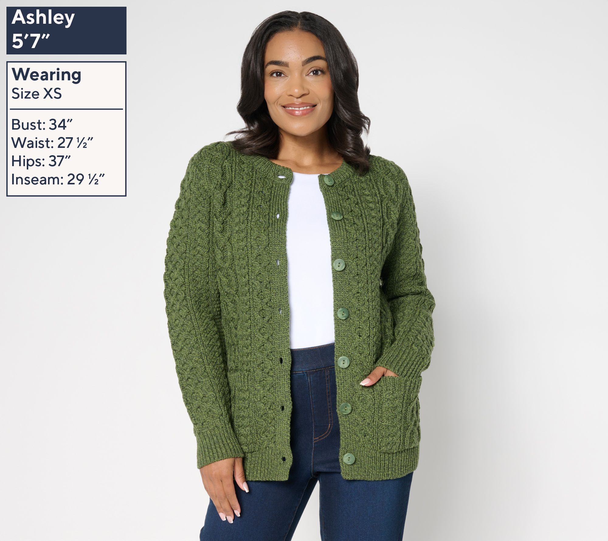 Features: button front closure; dyed-to-match buttons; crew neckline; ribbed knit trim at collar, cuffs, pocket opening, and bottom hem; front patch pockets; long sleeves; Aran cables