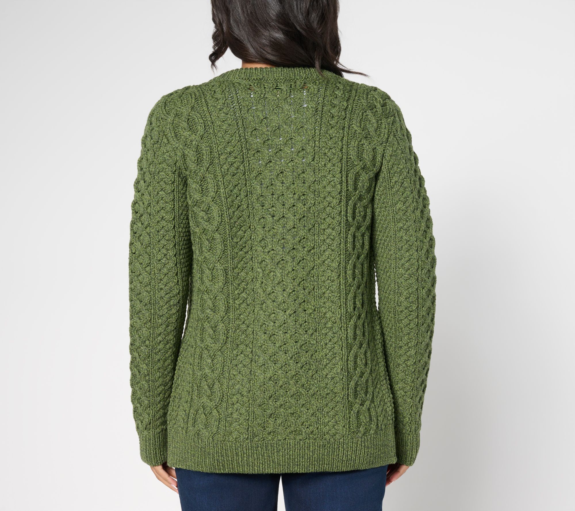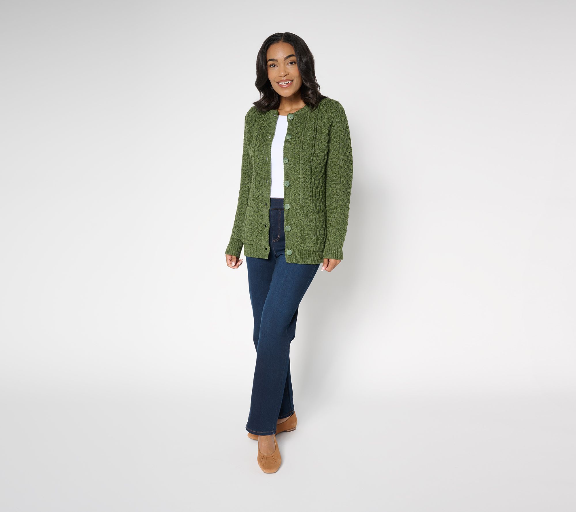 Enjoy a topper that pairs with anything from blouses to tees. The merino wool fabrication is warm and cozy, making it an ideal choice for those chillier months. From Aran Crafts.