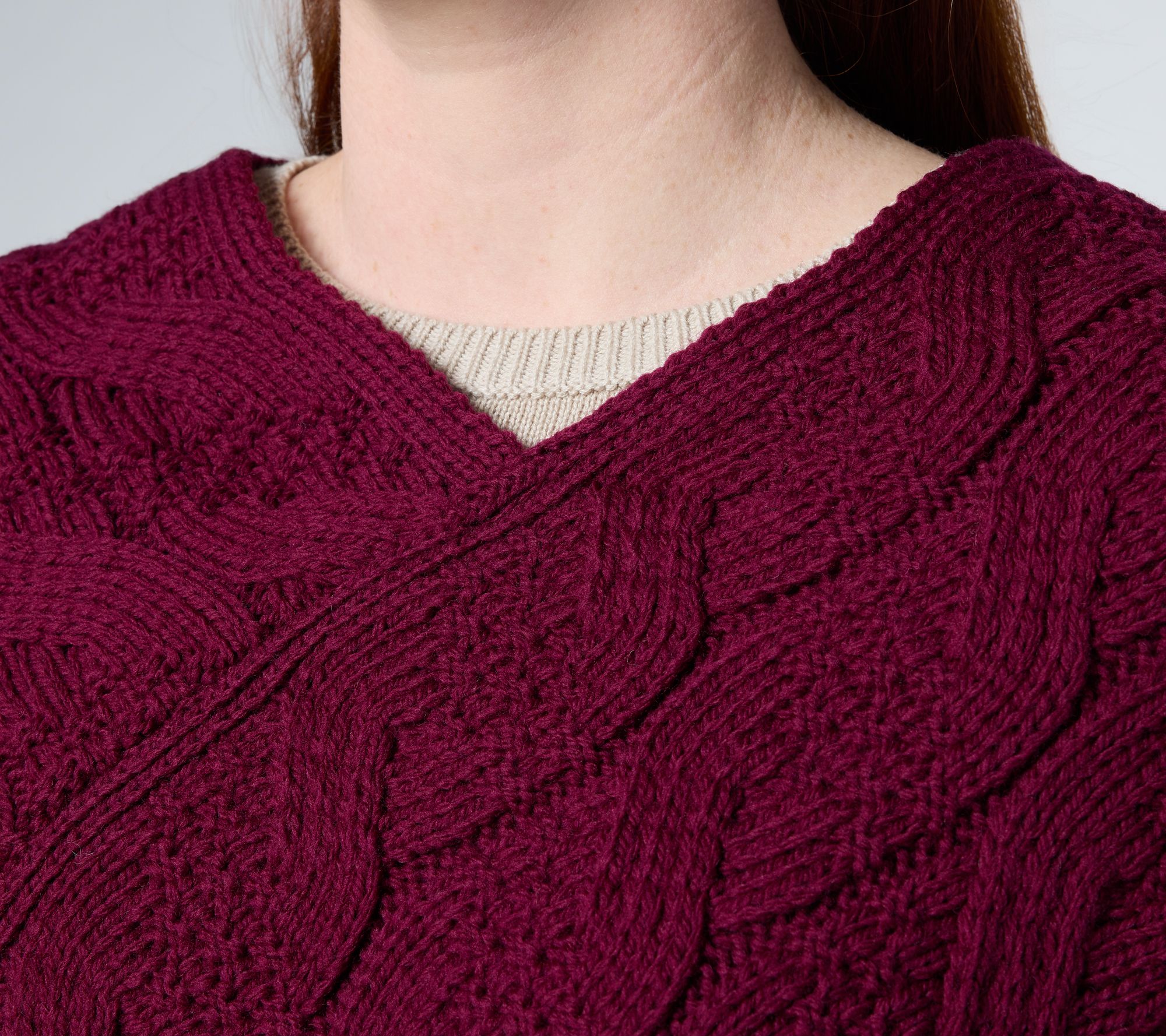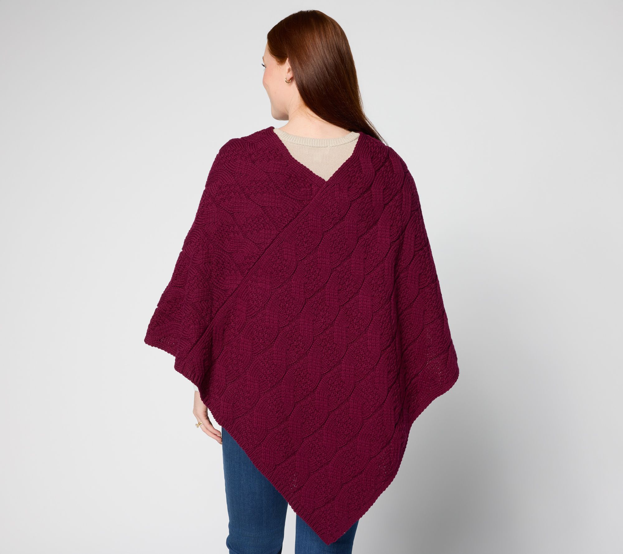 Features: pullover poncho style, V-neckline, no sleeve openings or formal closures, Aran cables throughout