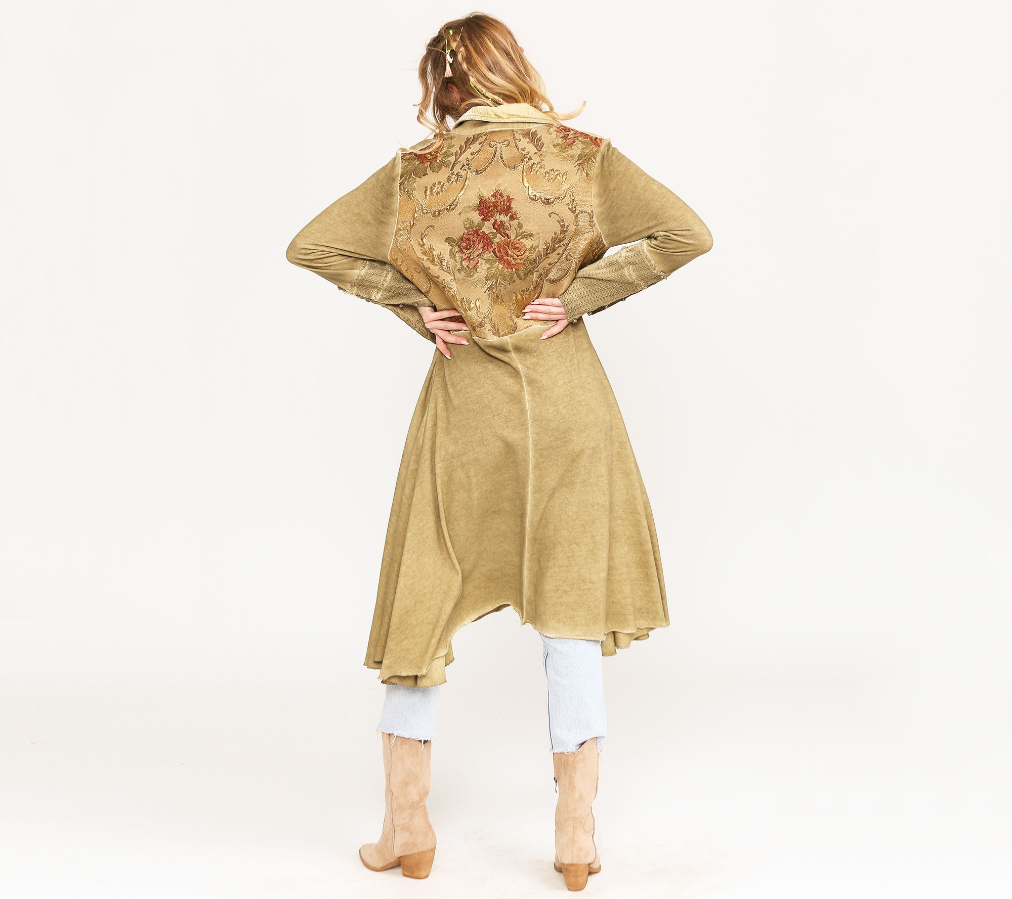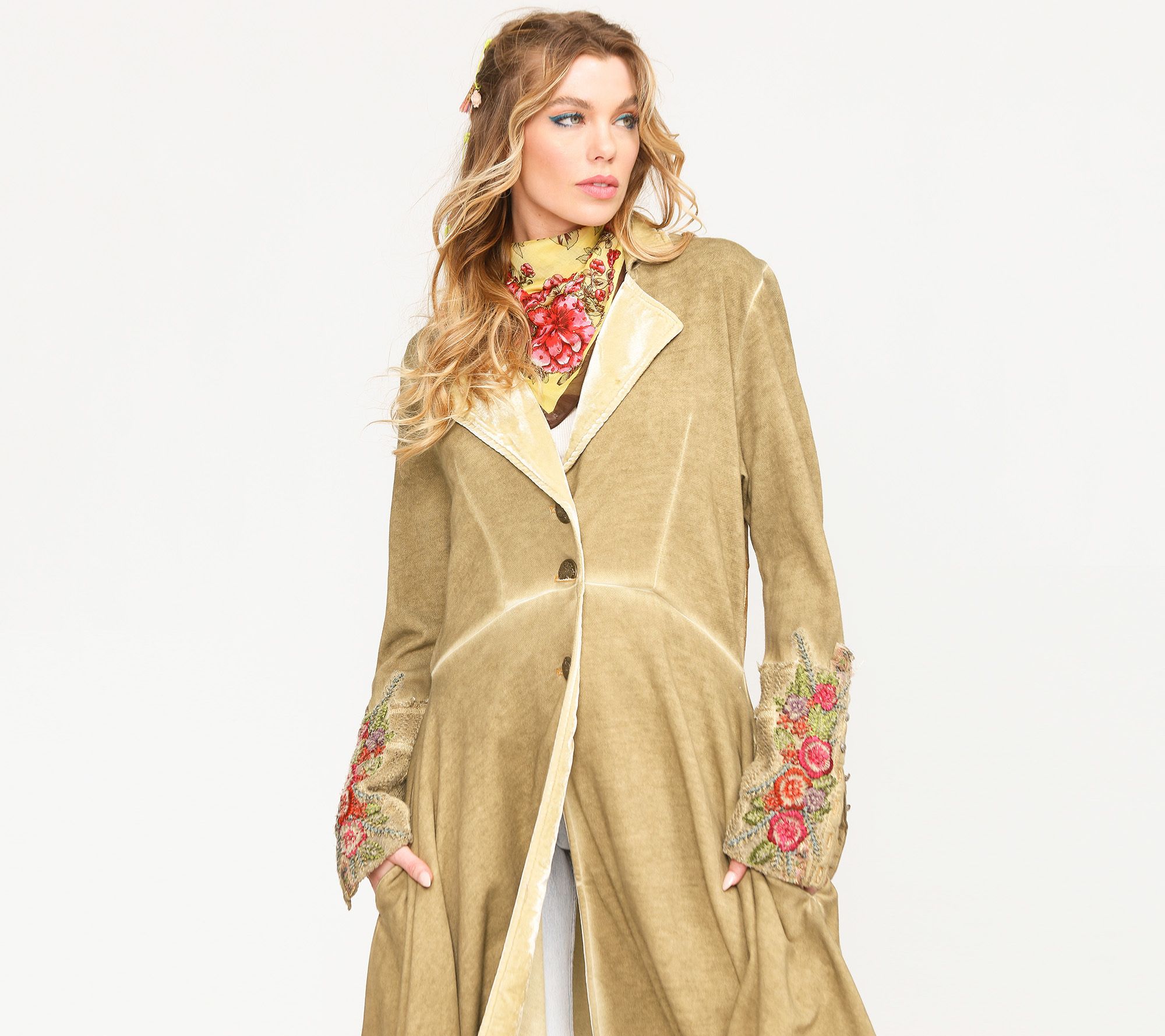 Greet transitional weather with comfort and style wearing this iconic trench coat adorned with floral details. From Aratta.