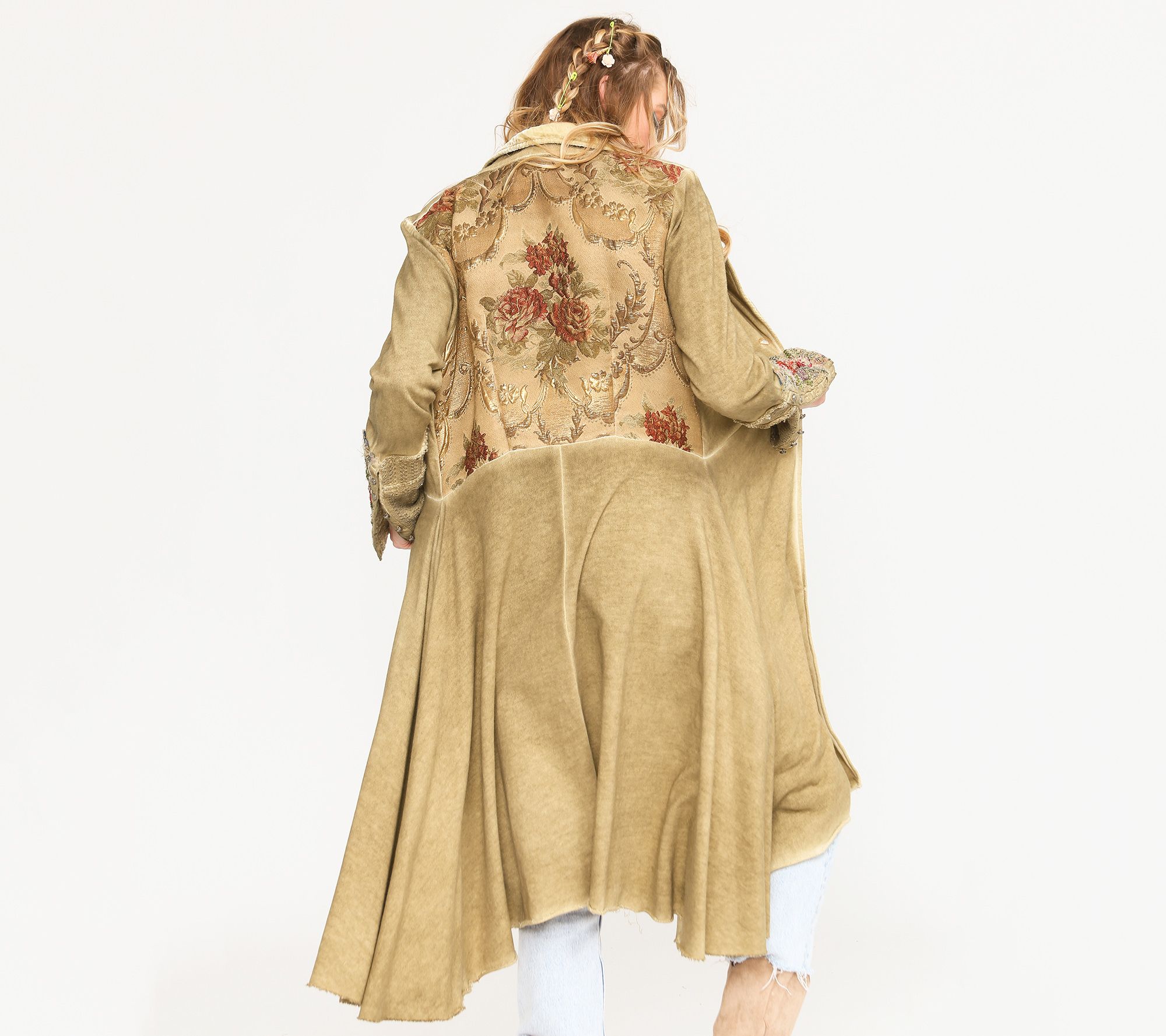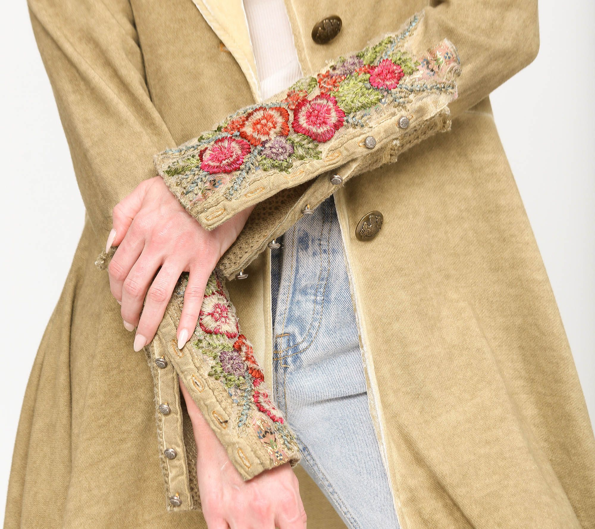 - Features: two side pockets, button closure, velvet lapel collar, long sleeves, embellished floral trim sweater-knit cuffs, floral jacquard upper back, knee length