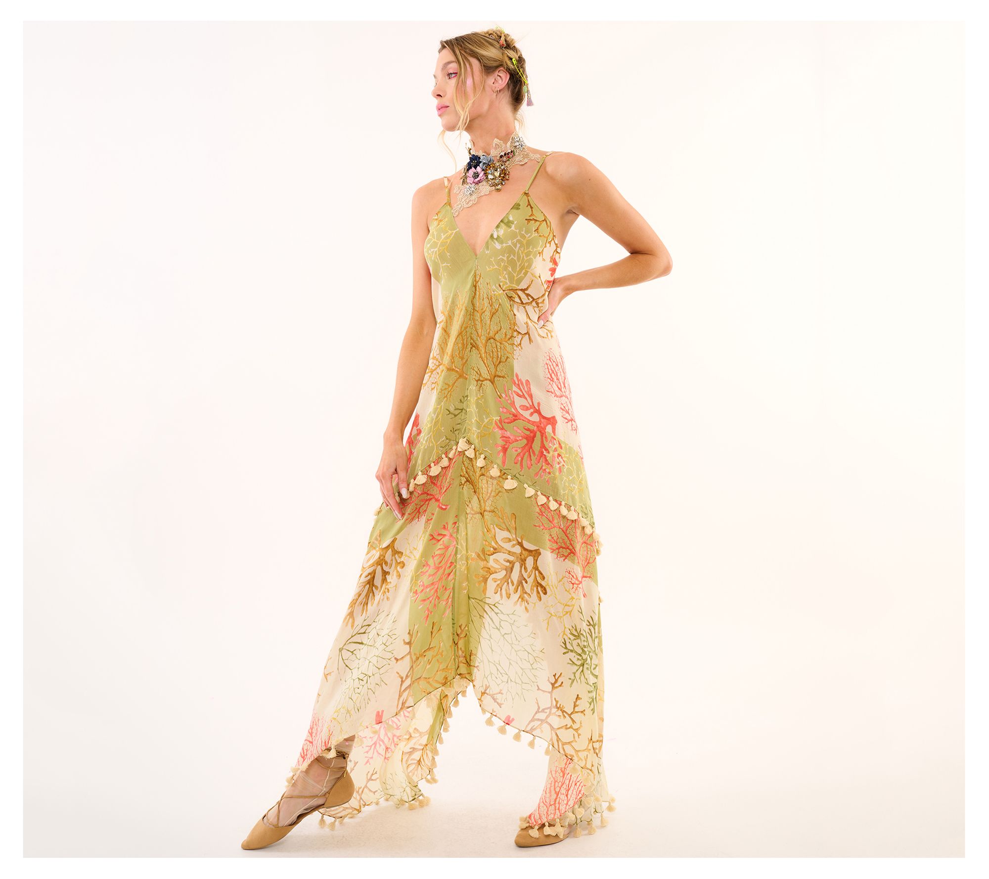 • Features: coral print, adjustable strap, tasseled dress, hi-low hem, maxi length, V-neck, sleeveless, tie closure