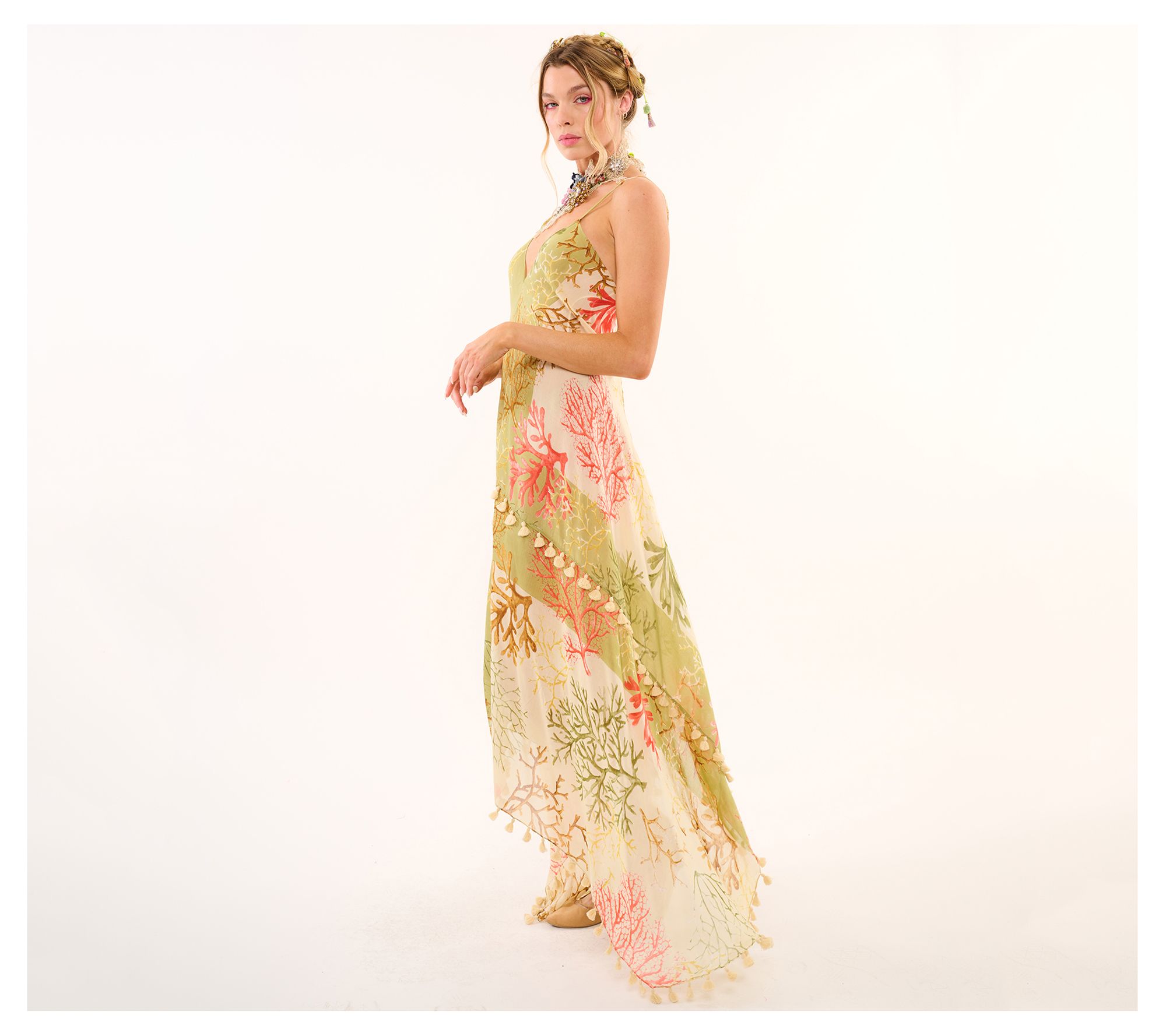 Elevate your spring and summer wardrobe with this striking piece that combines the elegance of a maxi dress with the playful charm of tassel accents and an adjustable strap design. Its coral print exudes a vibrant, carefree vibe, perfect for sun-drenched days and balmy evenings. From Aratta.