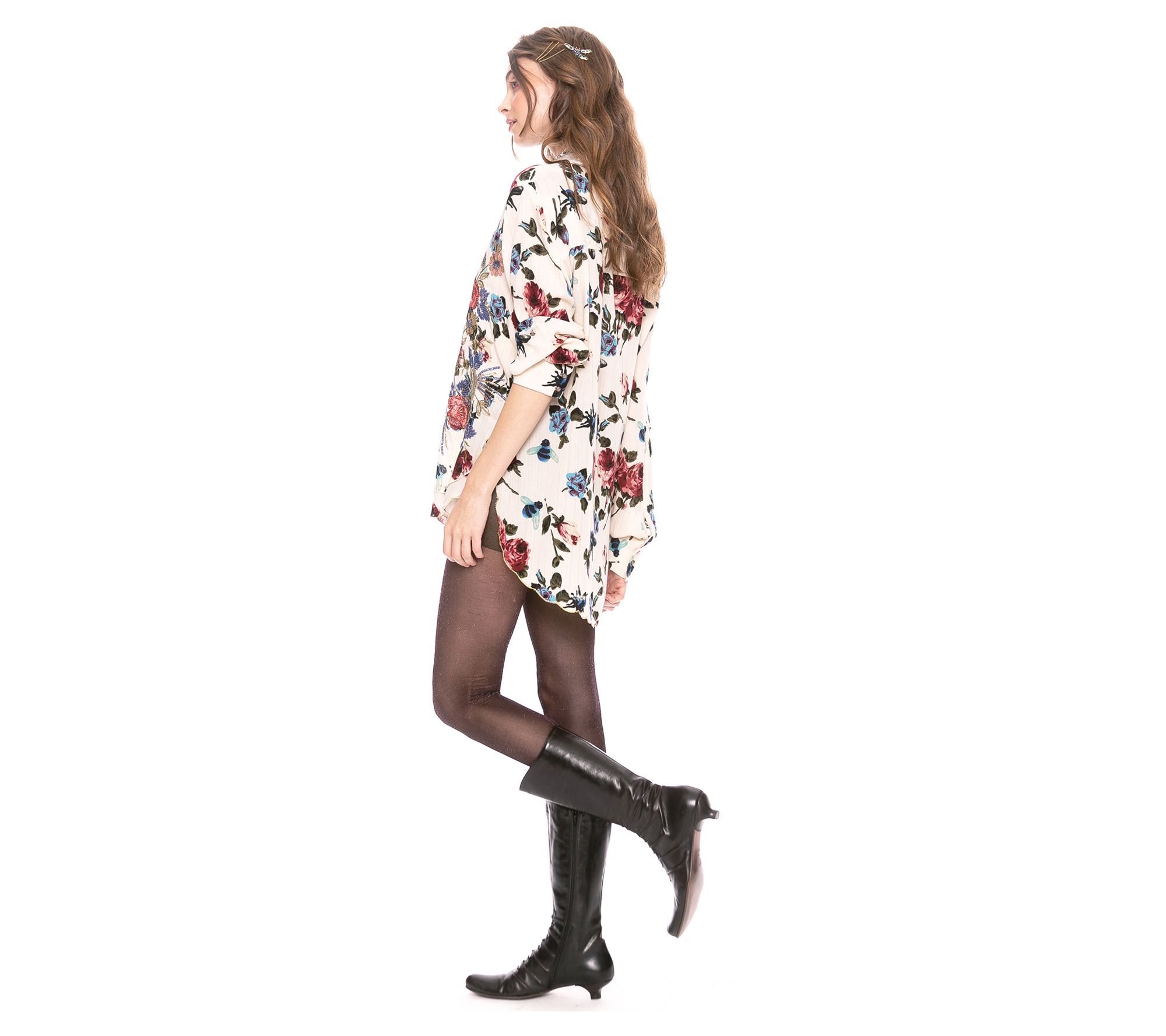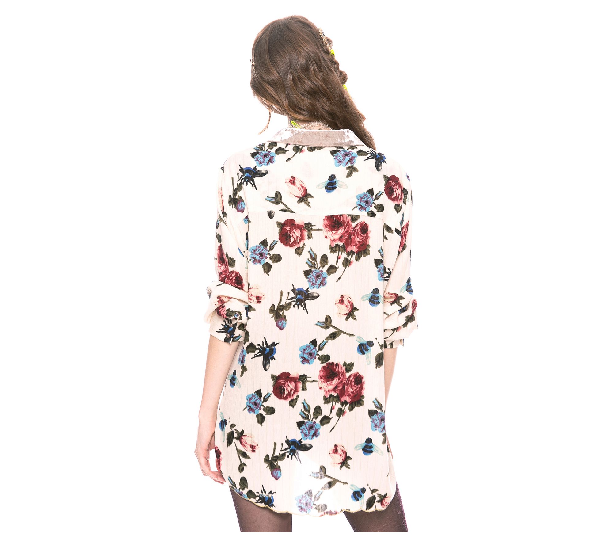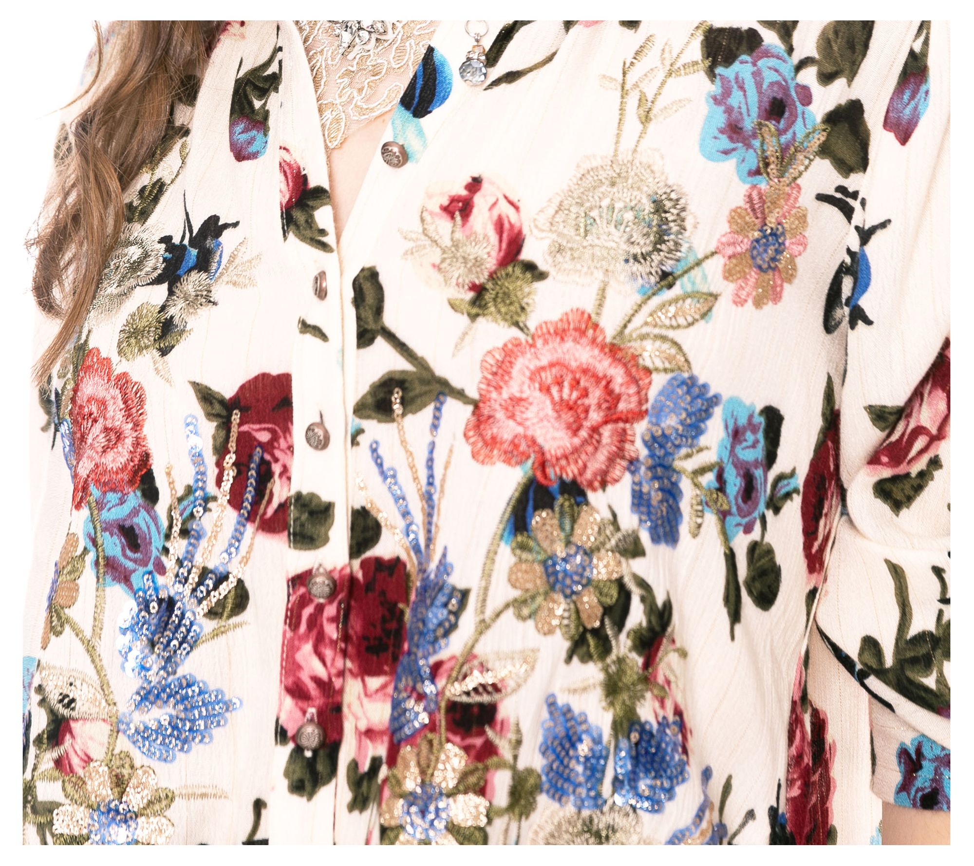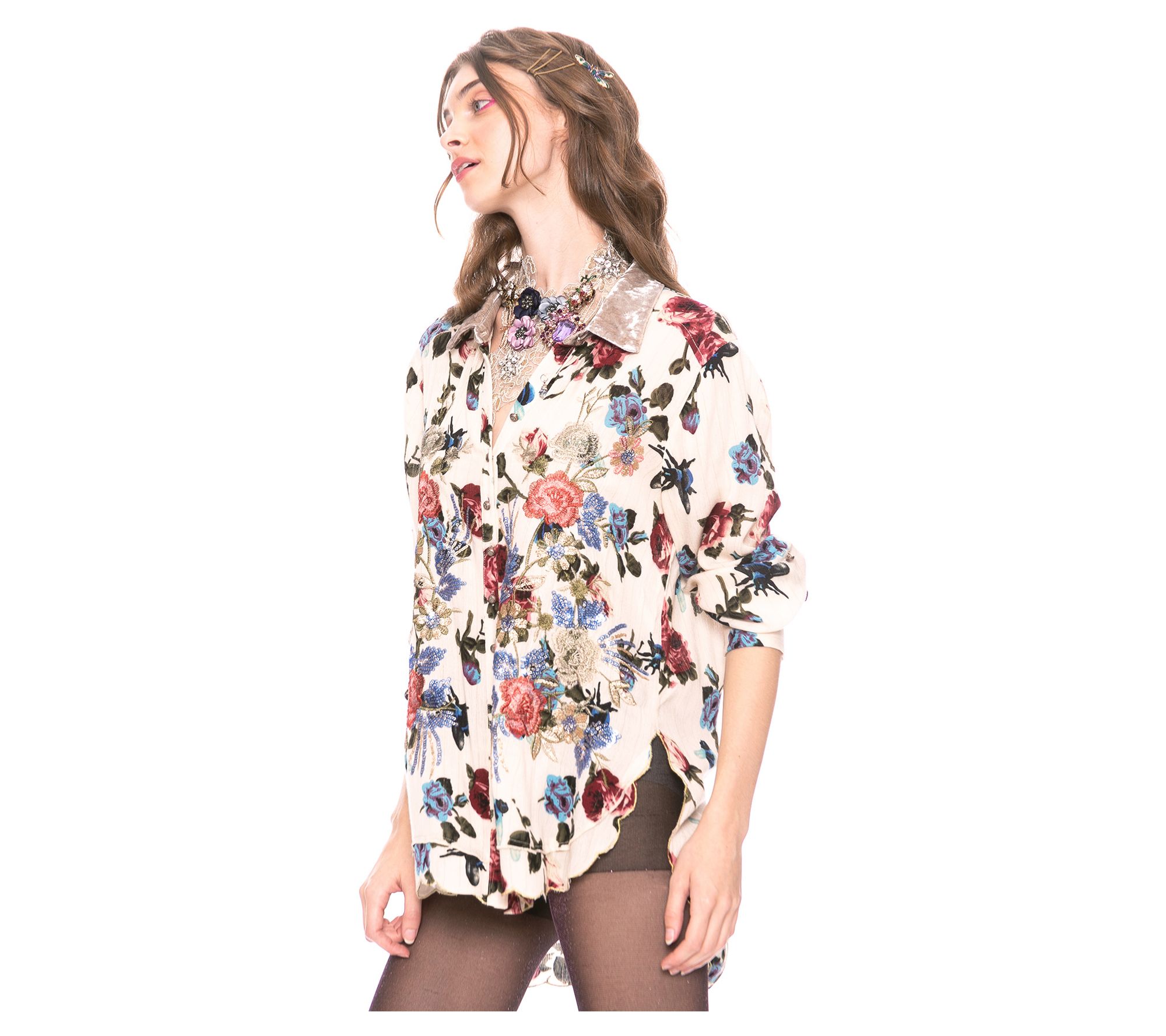 Sequin embroidered button-down floral print shirt with velvet collar/collar stand, metallic thread scallop hem;Shirt