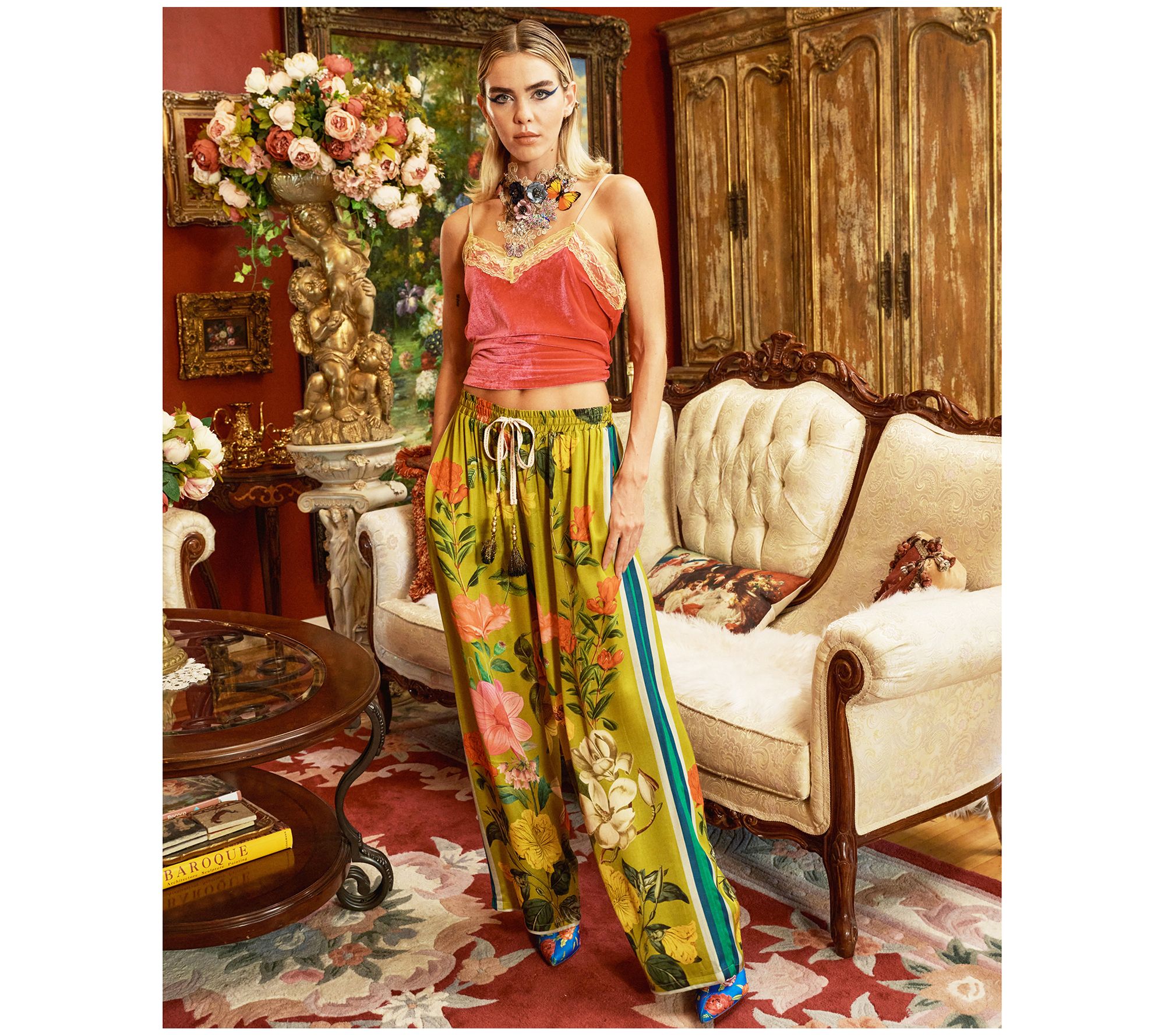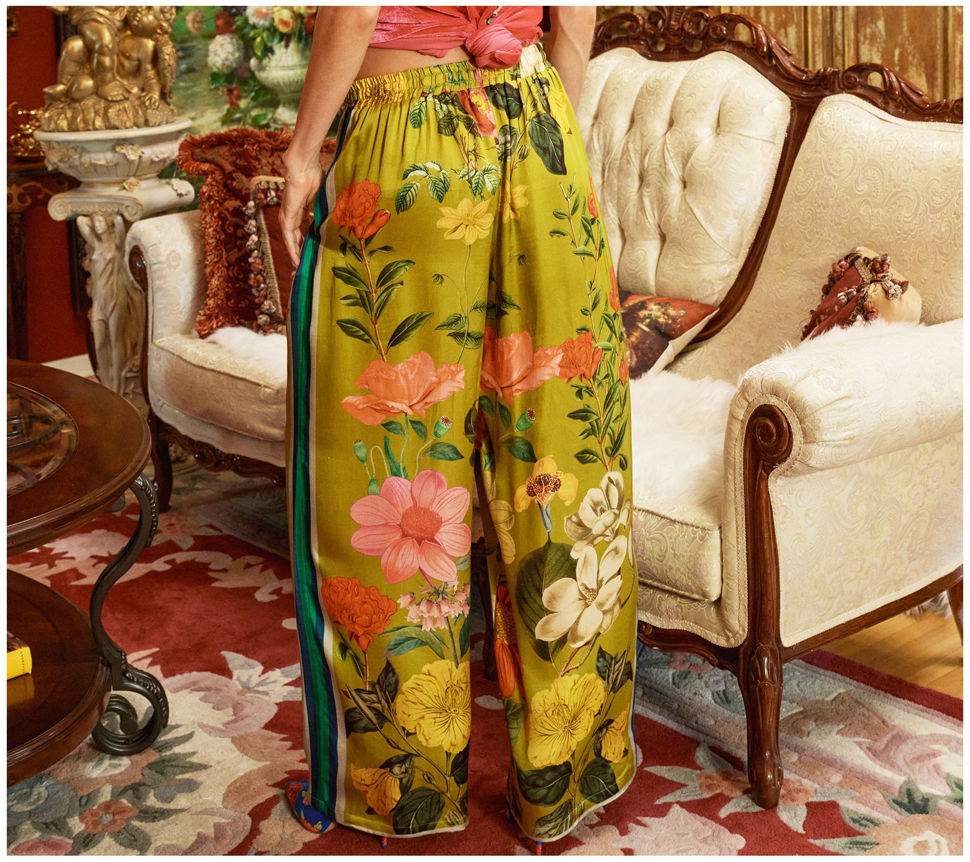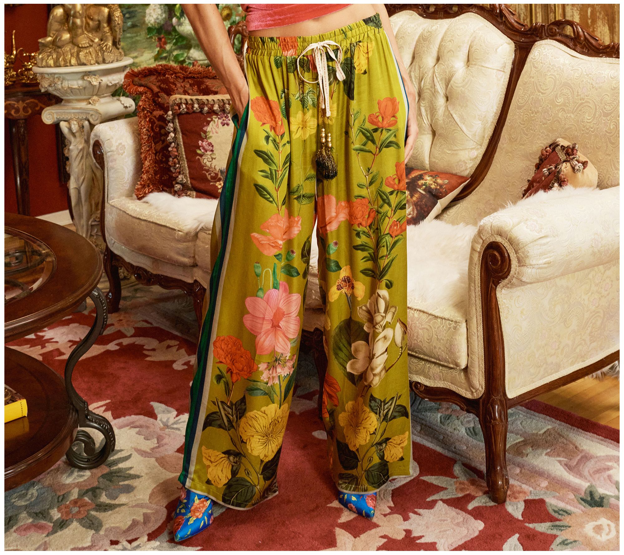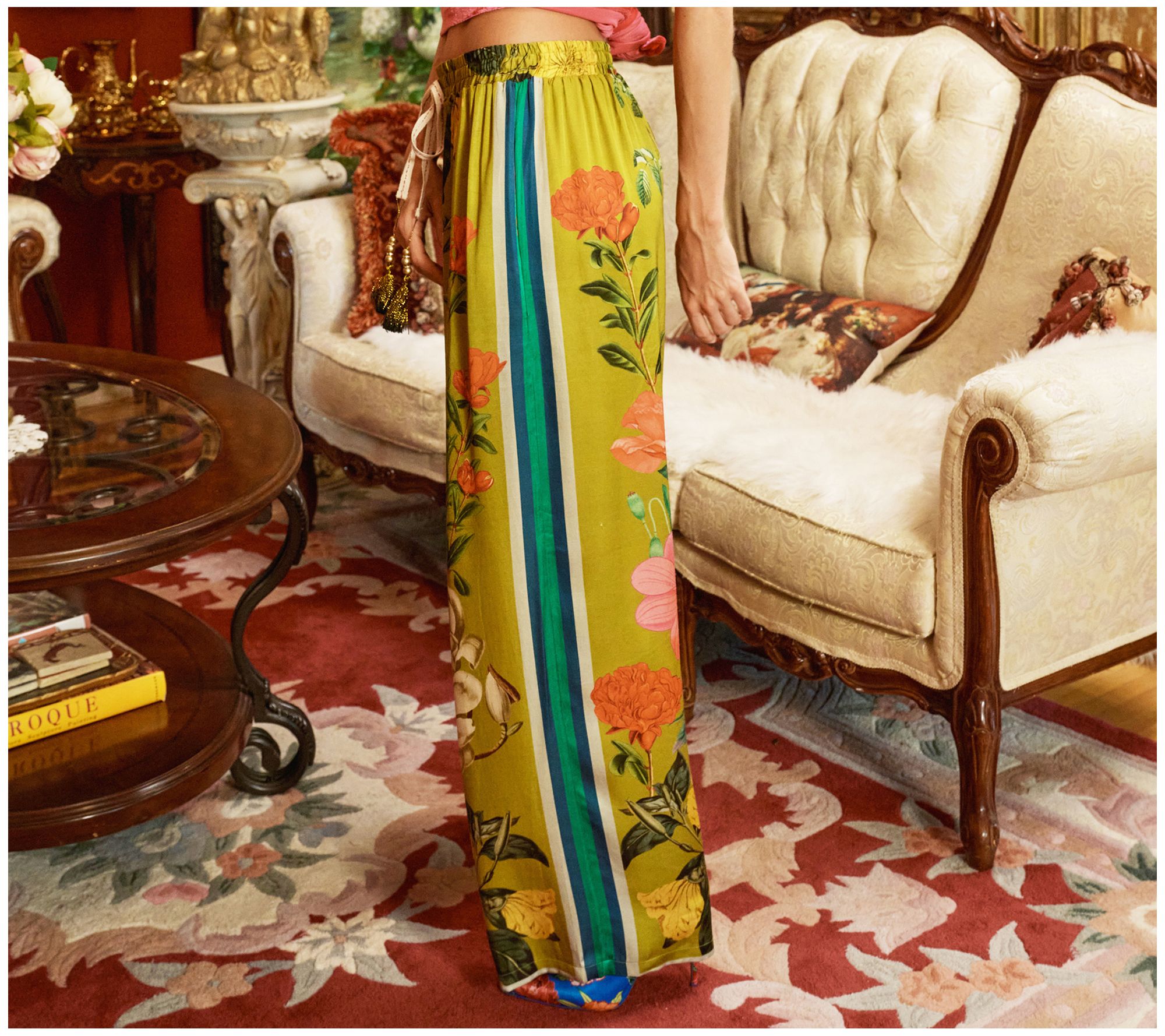 Embrace the charm of the French Riviera with these laidback pants featuring a captivating floral and stripes border print. The beaded tassel drawstring adds a touch of whimsy, making them a go-to for effortless style. From Aratta.