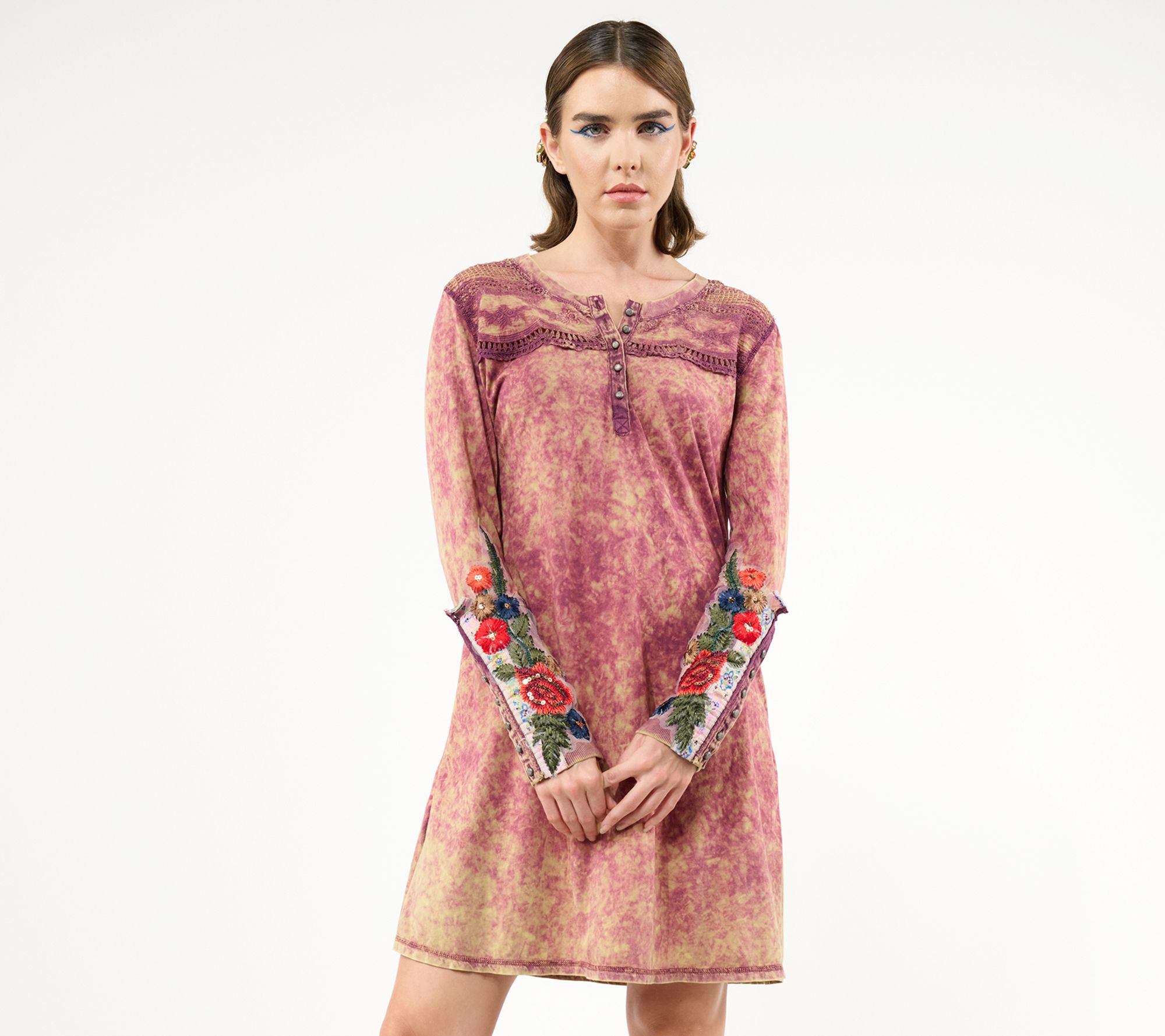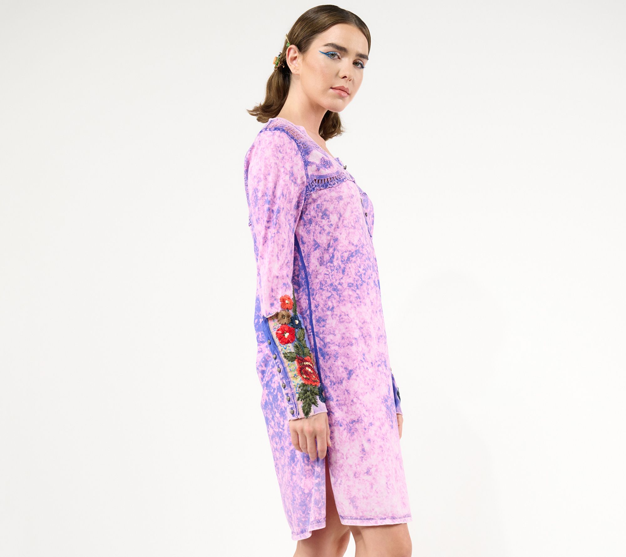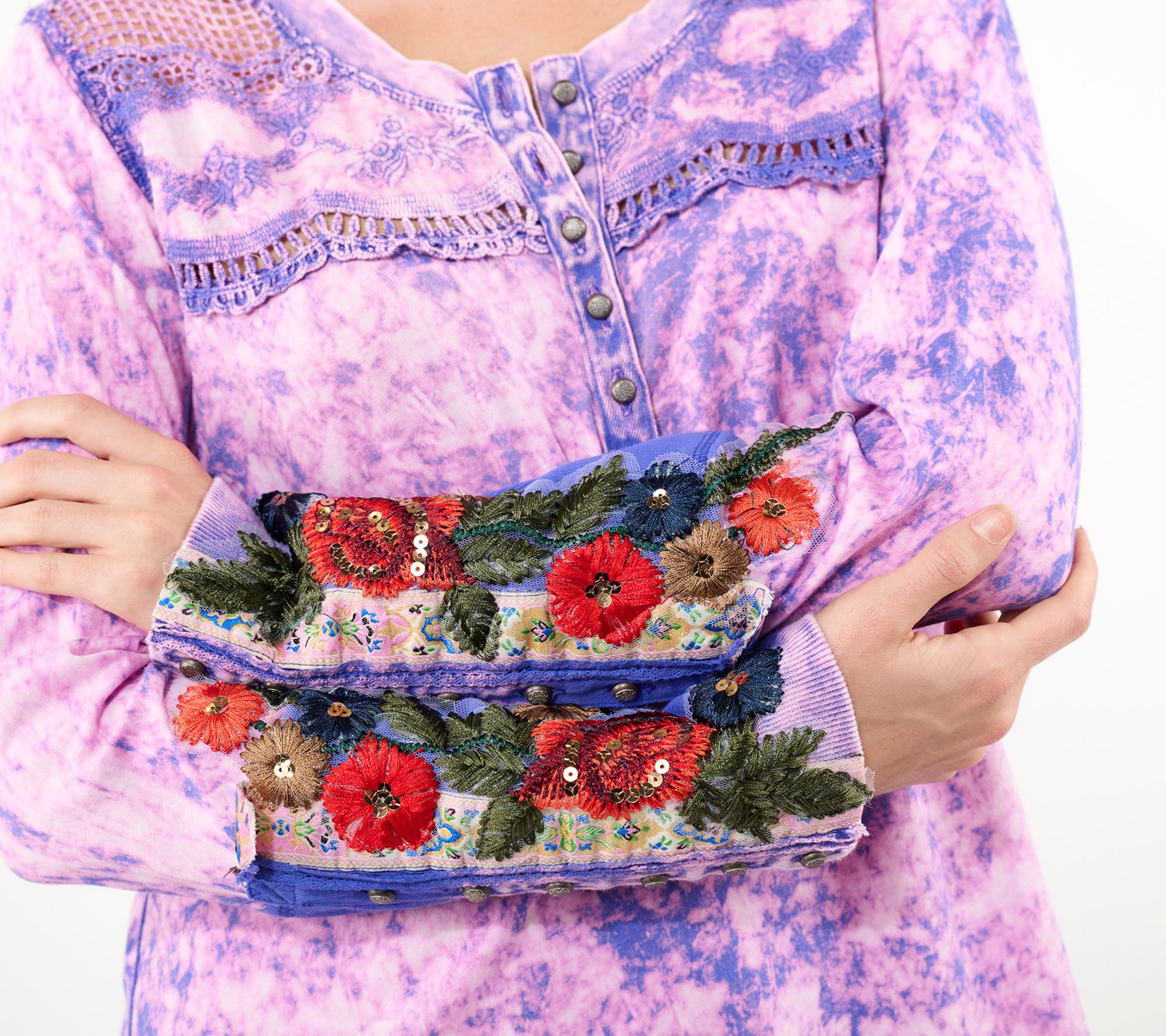 Come to life in this whimsical embroidered tunic. The delicate embroidery and scallop hem mesh trim on both front and back yokes shine effortlessly while the sequined cuffs add just the right amount of sparkle. From Aratta.