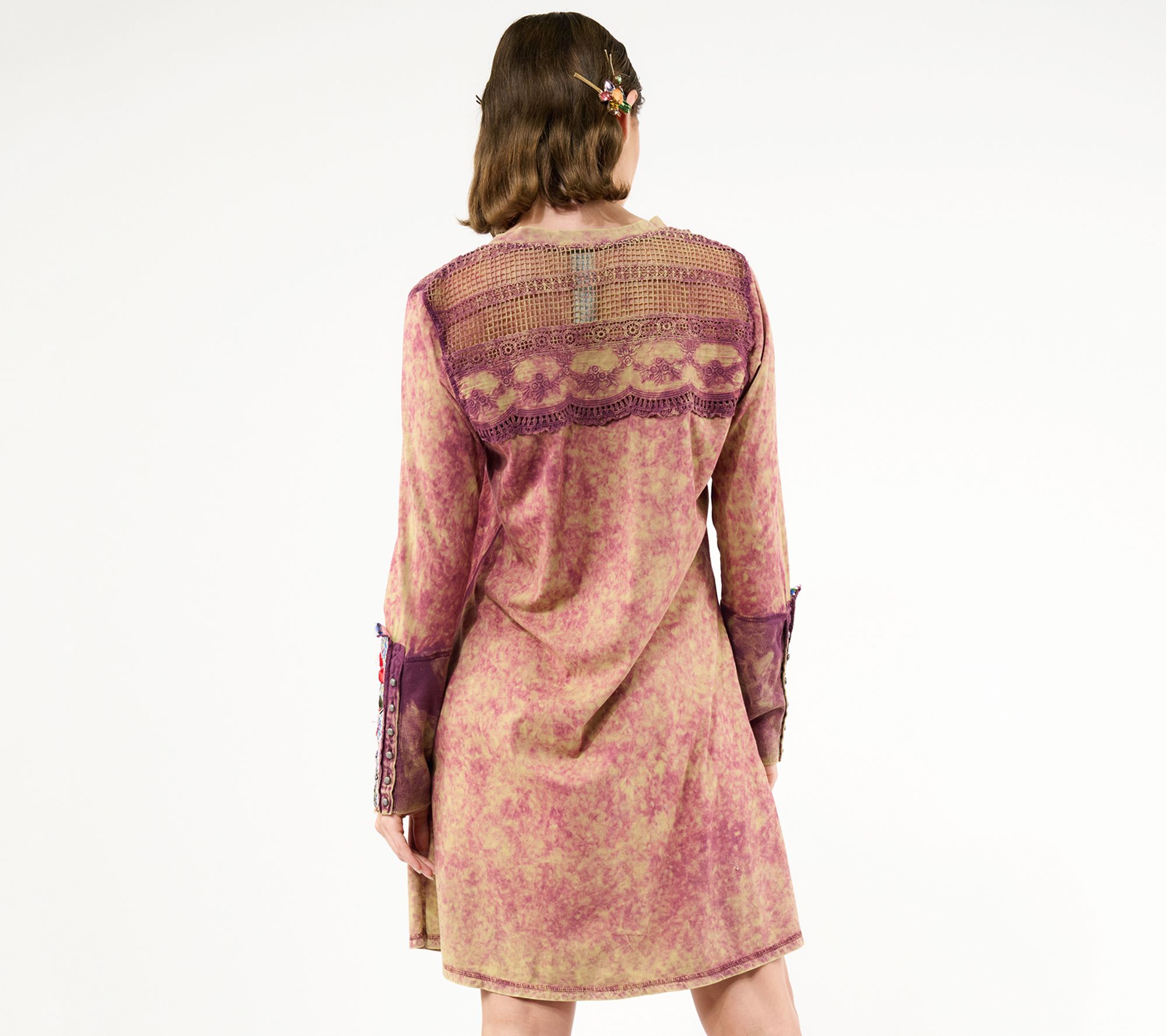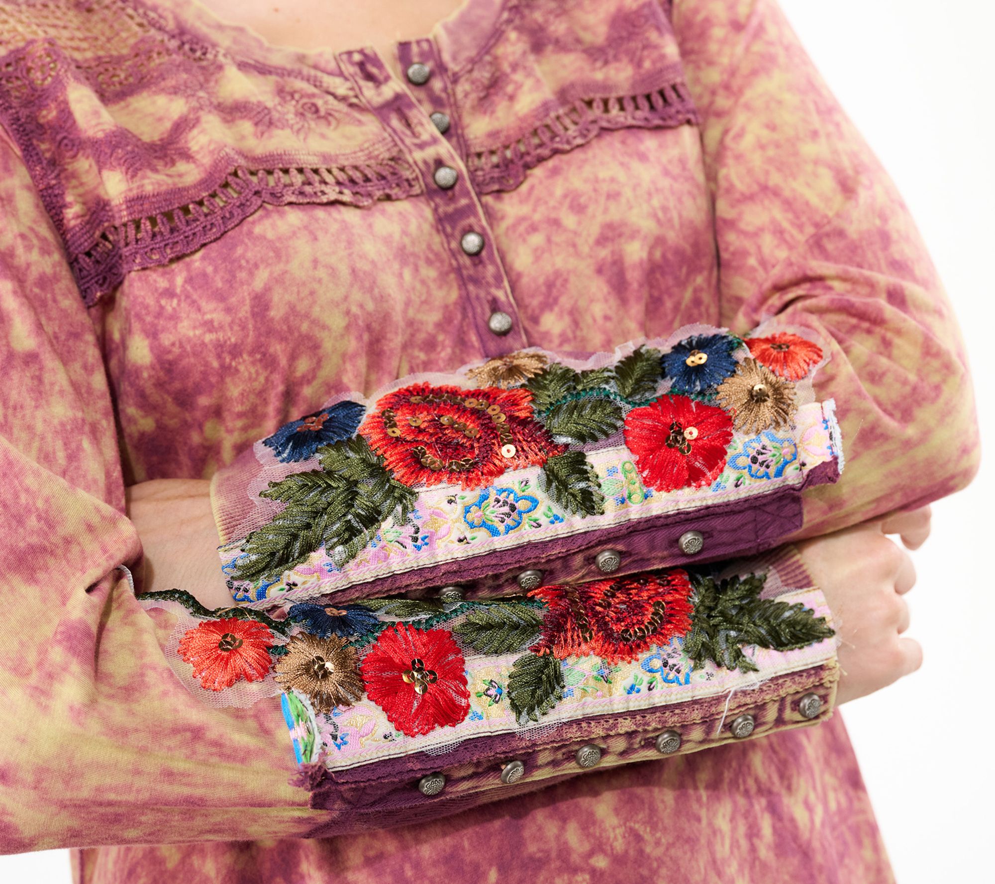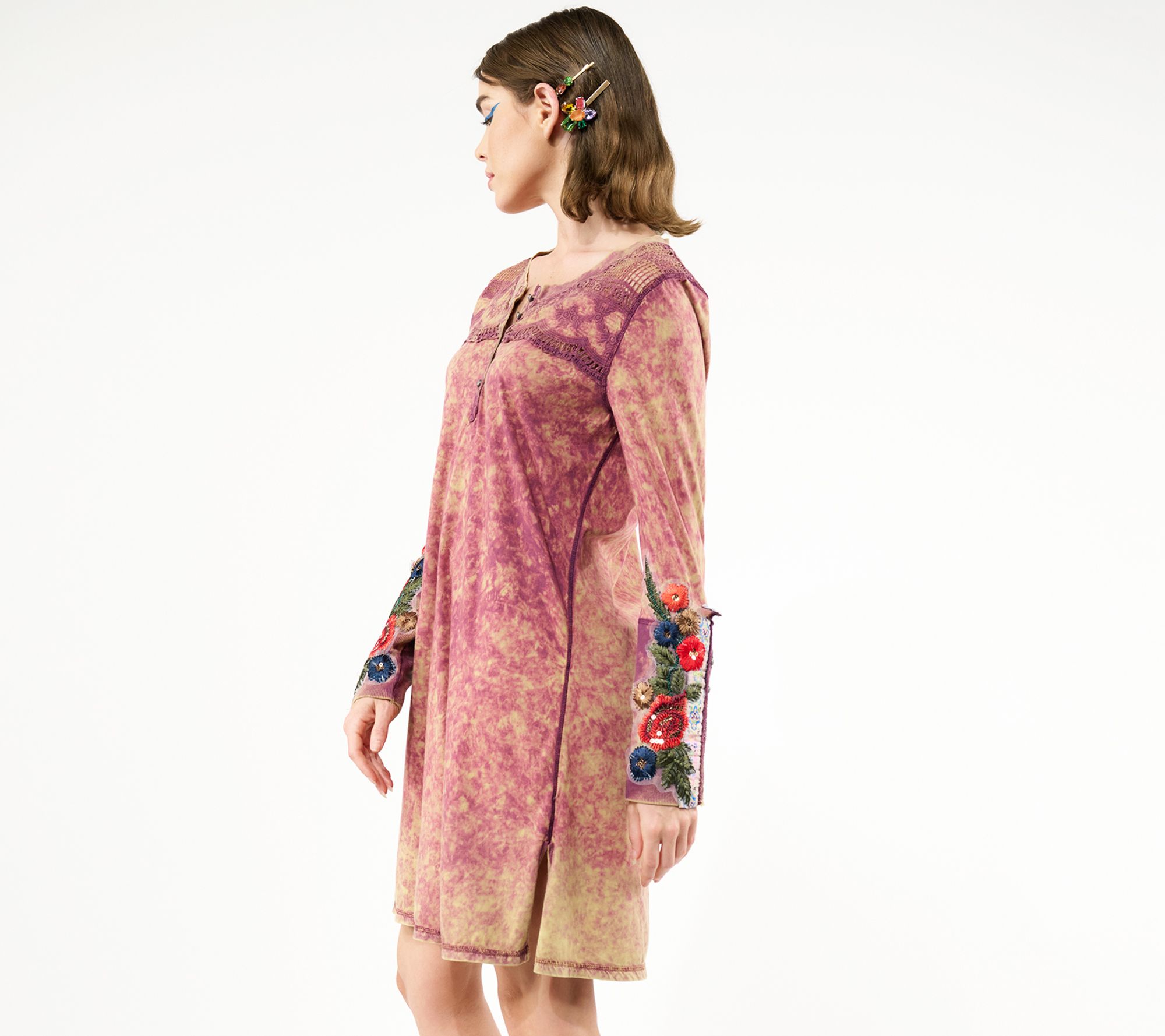 Come to life in this whimsical embroidered tunic. The delicate embroidery and scallop hem mesh trim on both front and back yokes shine effortlessly while the sequined cuffs add just the right amount of sparkle. From Aratta.