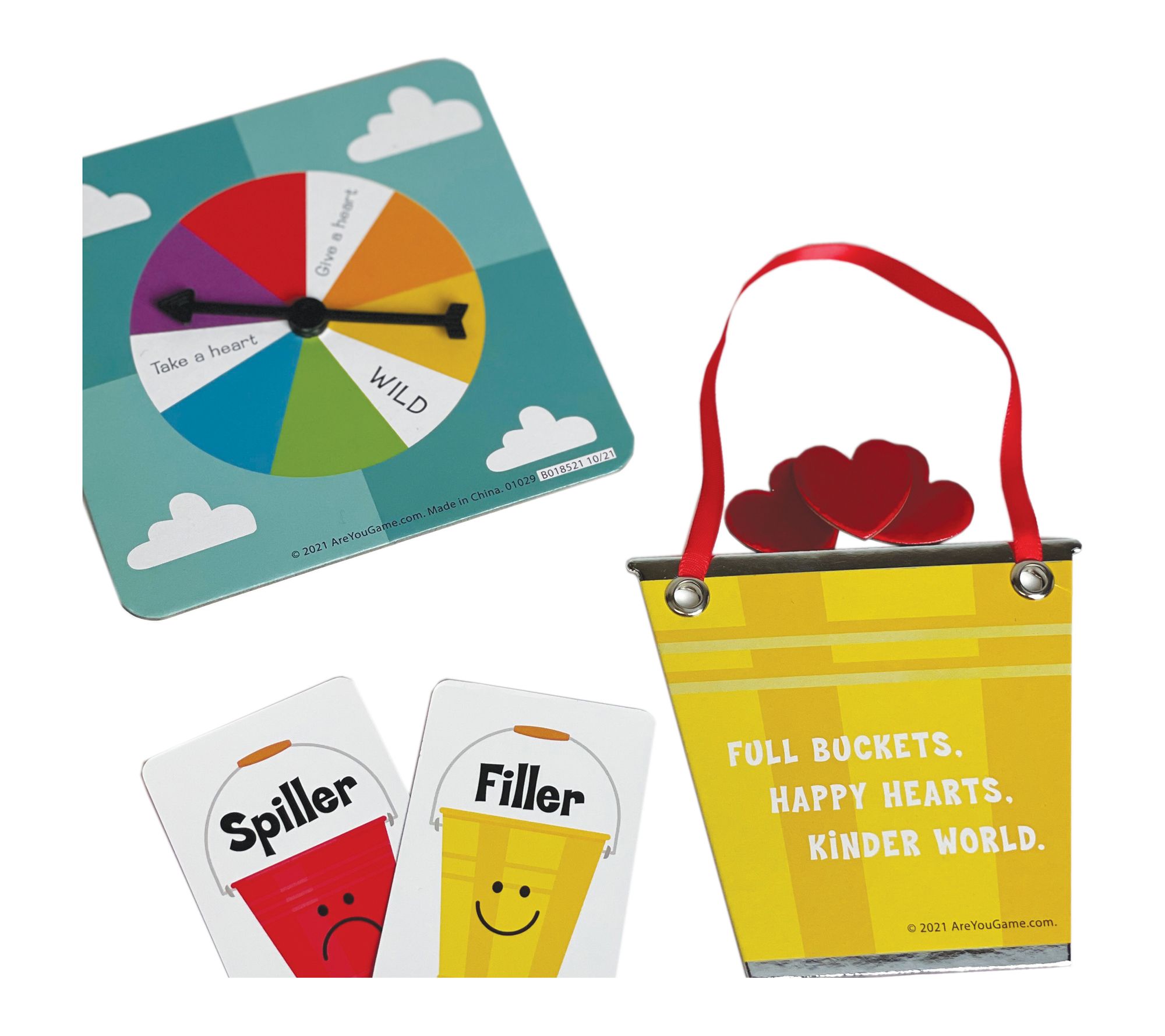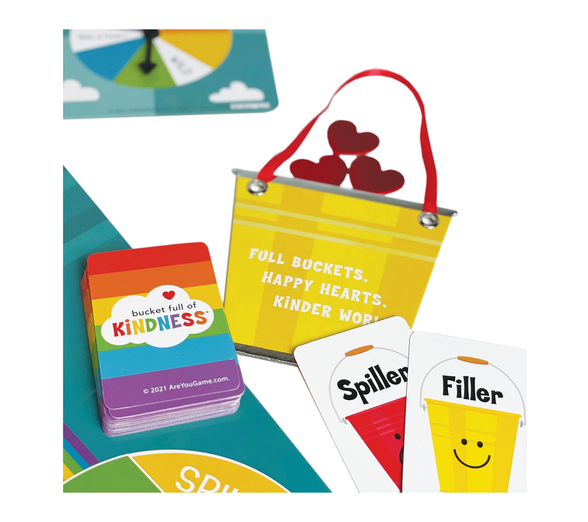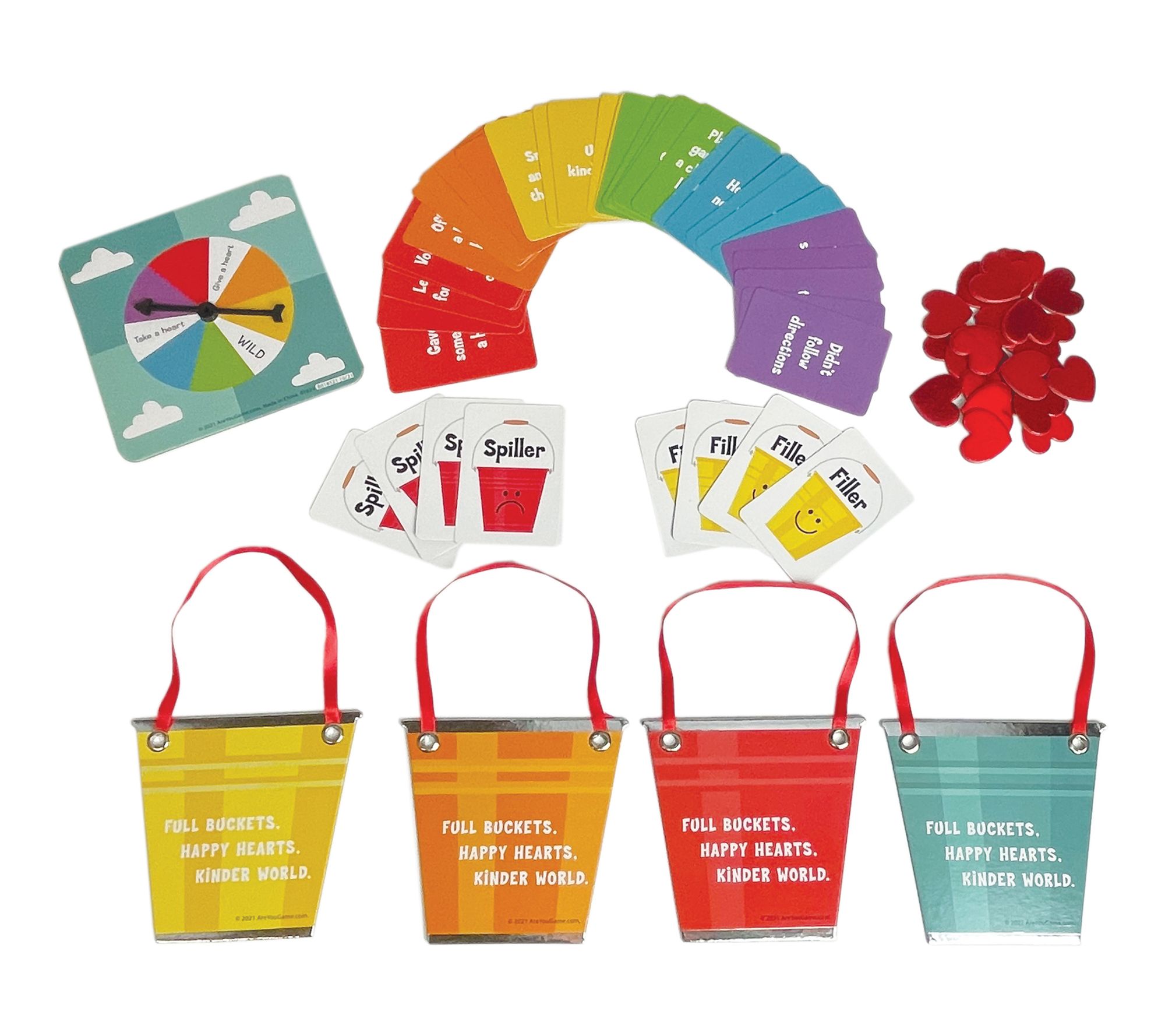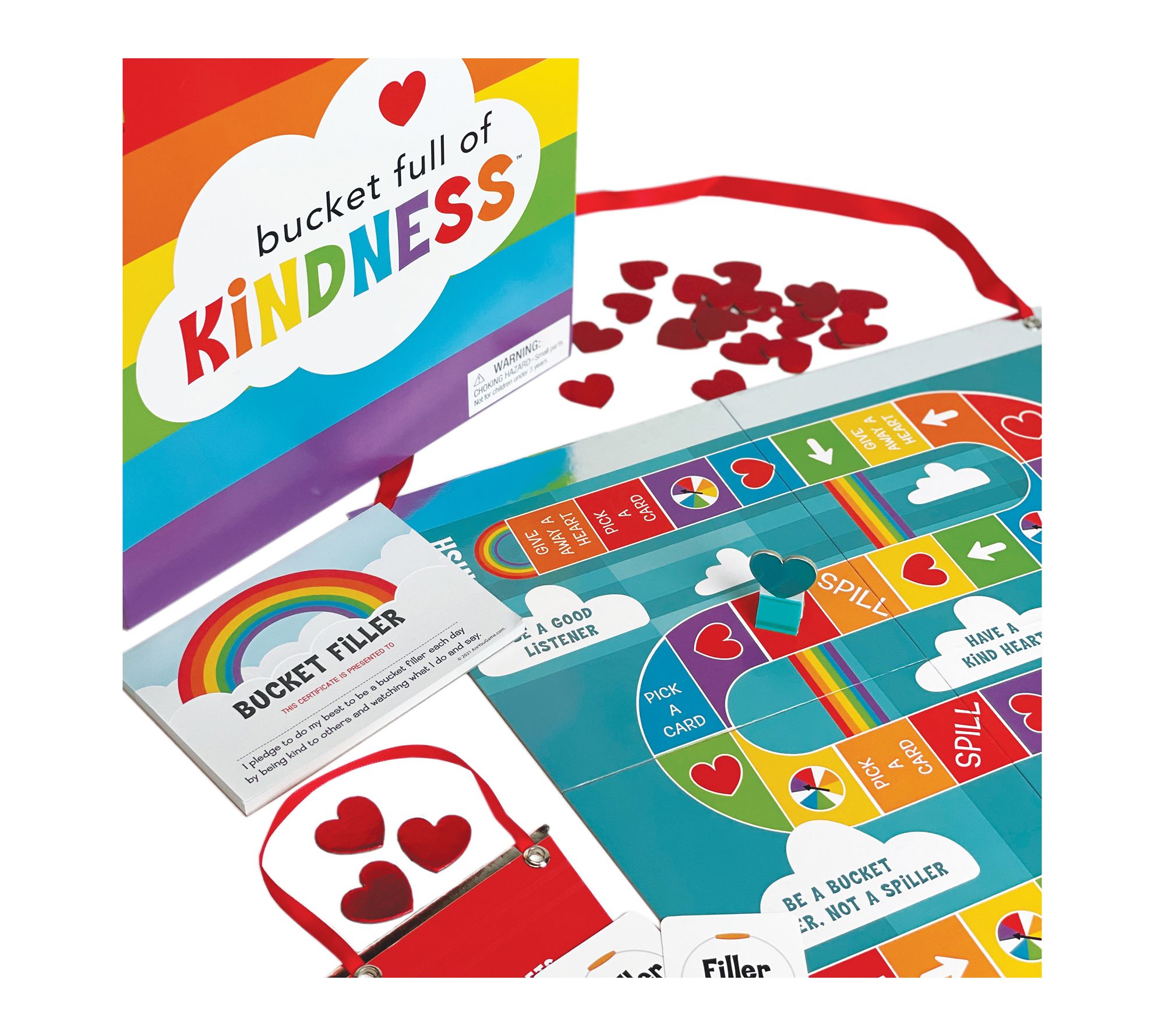 • Includes game board, 4 game pieces, 8 voting cards, 4 kindness buckets, 30 action cards, 50 kindness certificates, 48 foil kindness hearts, spinner