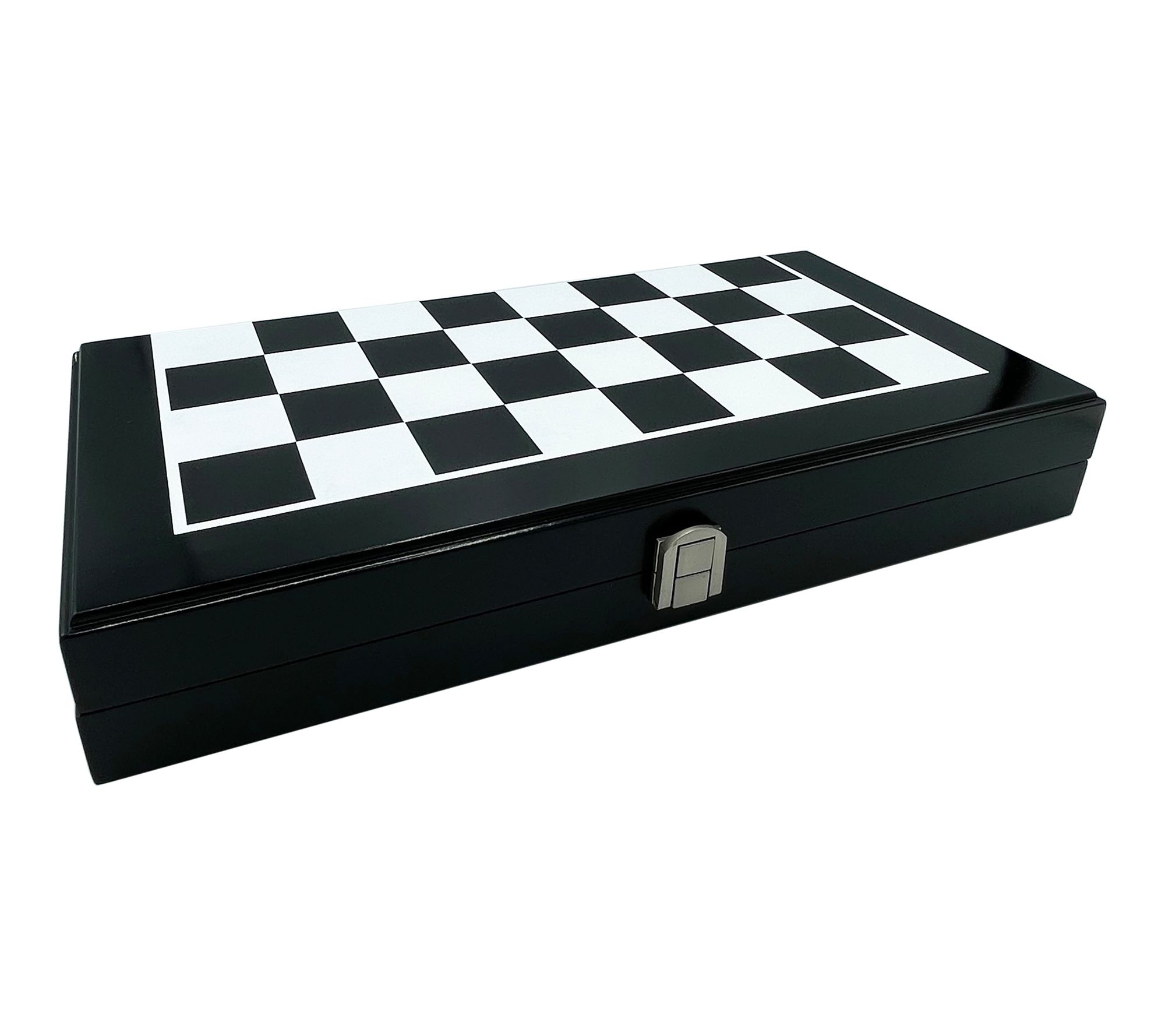 • Solid wood board with magnetic closure, metal latch, and hinges; hard plastic chess pieces