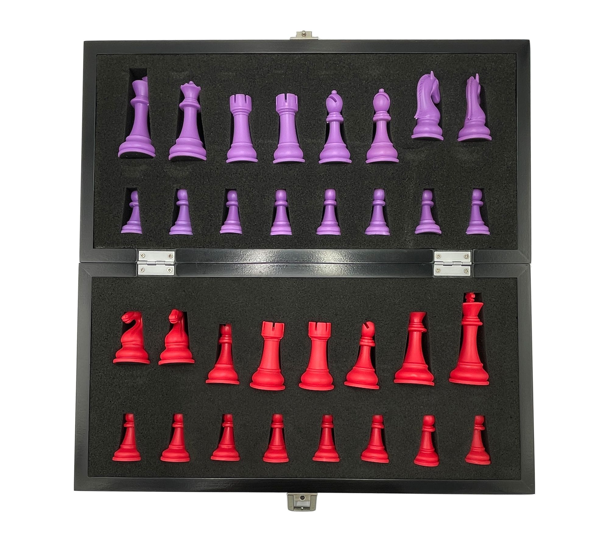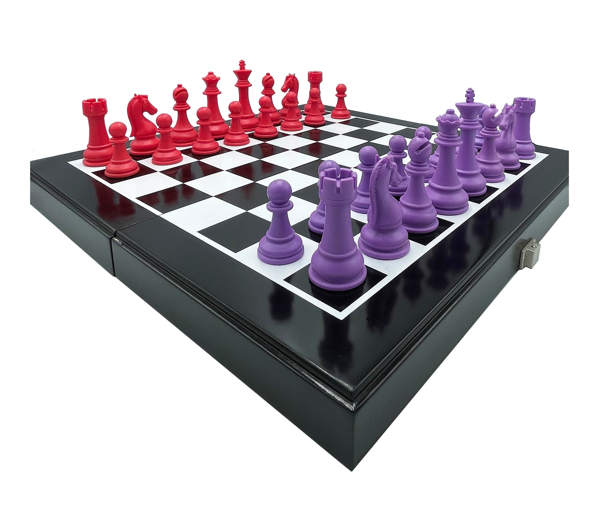Whether you're gearing up for a family game night or adding a stylish touch to your living room, this bold and colorful chess set offers both entertainment and eye-catching decor. The solid wood folding board, outfitted with Staunton-style pieces and convenient interior storage, makes it easy to take along for chess matches at home or on the go. From AreYouGame.