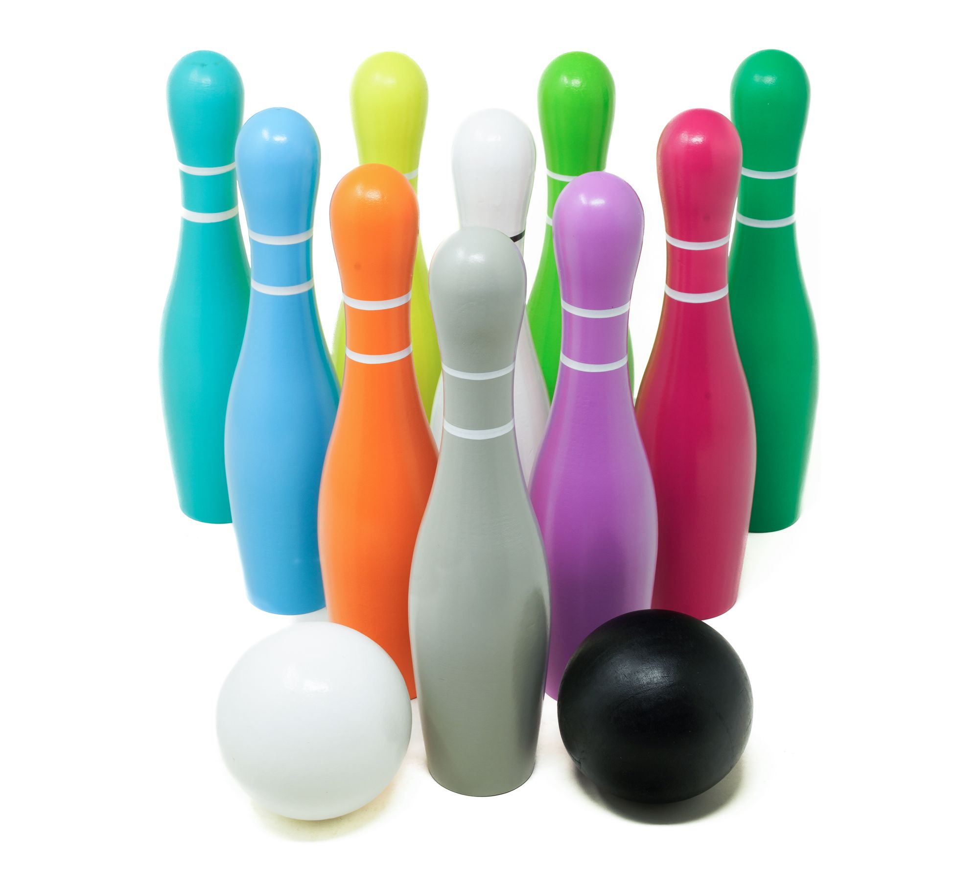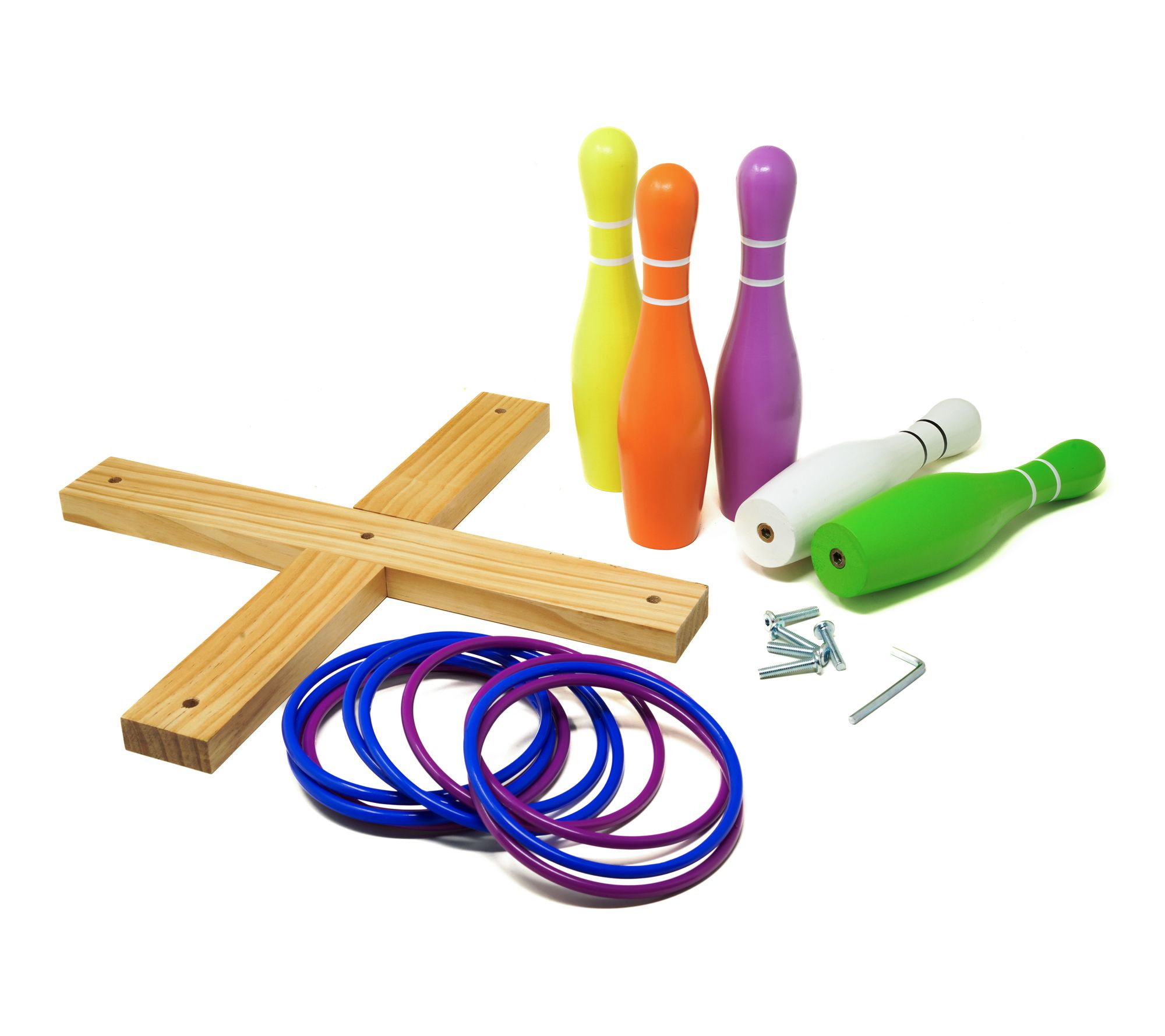 • Bowling balls, pins, and base made of wood; rings made of plastic