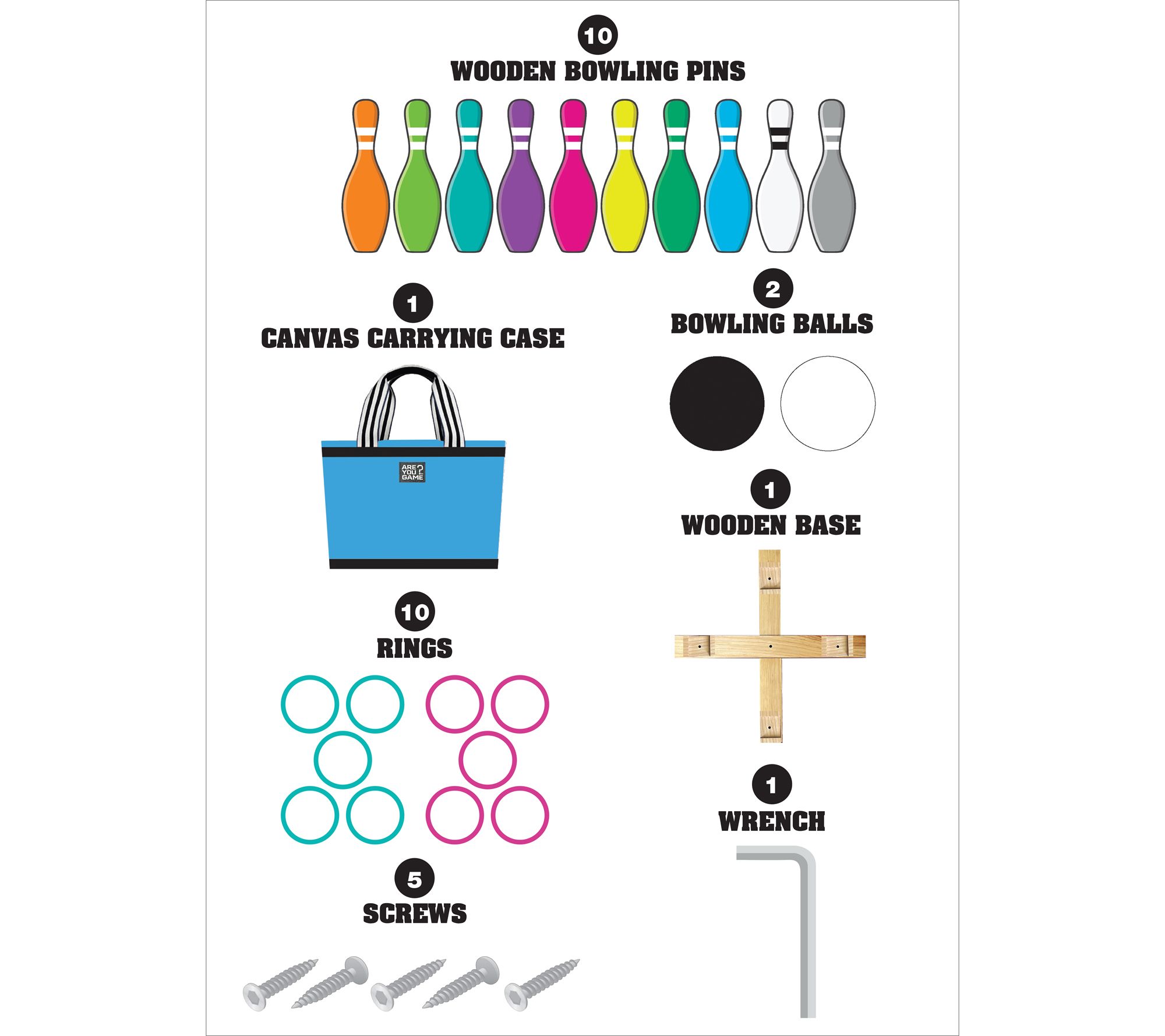 • Includes 10 wooden bowling pins, 1 canvas carrying case, 2 bowling balls, 10 rings, 1 wooden base, 5 screws, and 1 wrench
