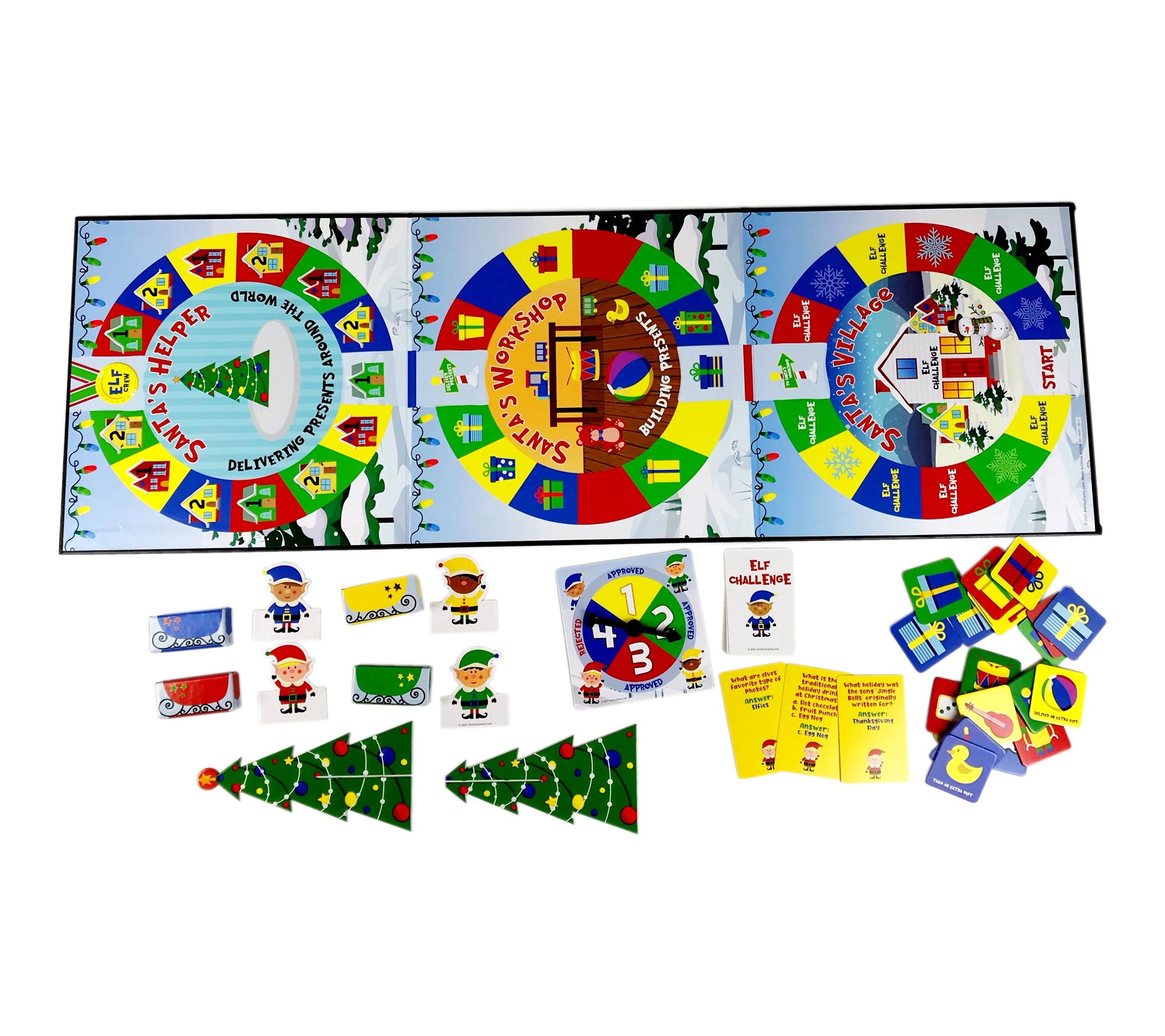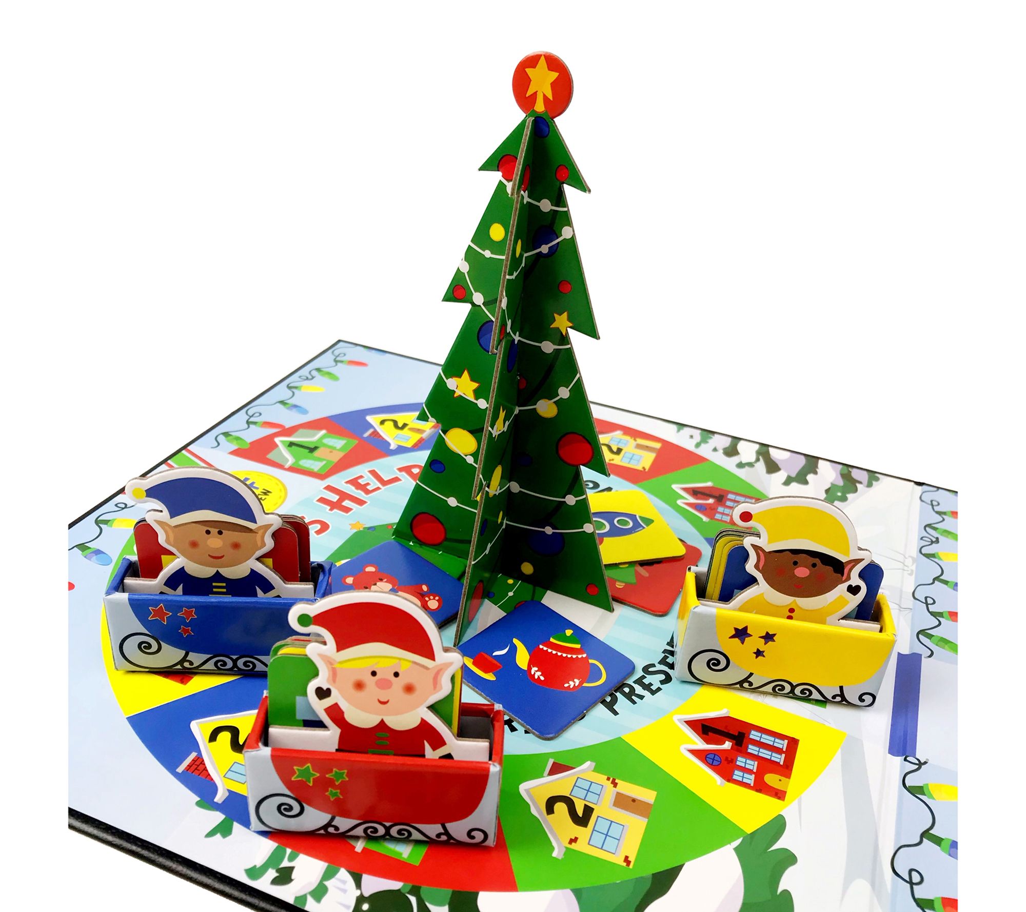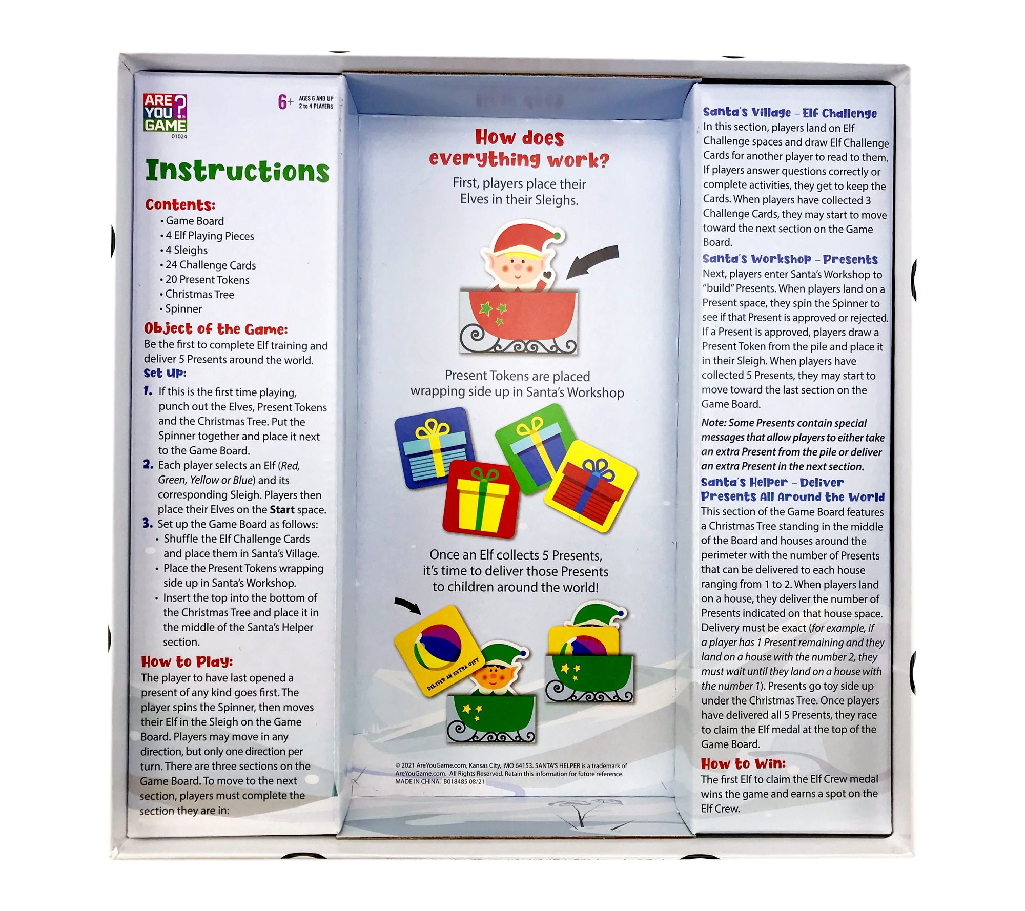 • Includes game board, four elf playing pieces, four sleighs, 24 challenge cards, 20 present tokens, Christmas tree, spinner, and instructions