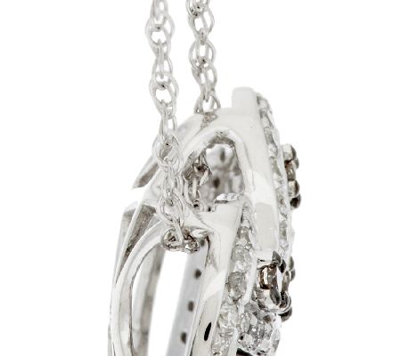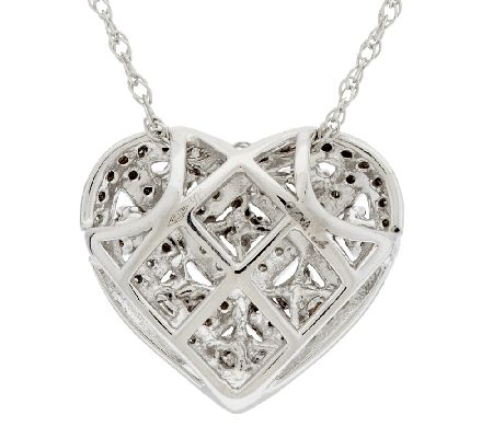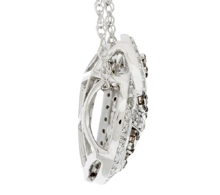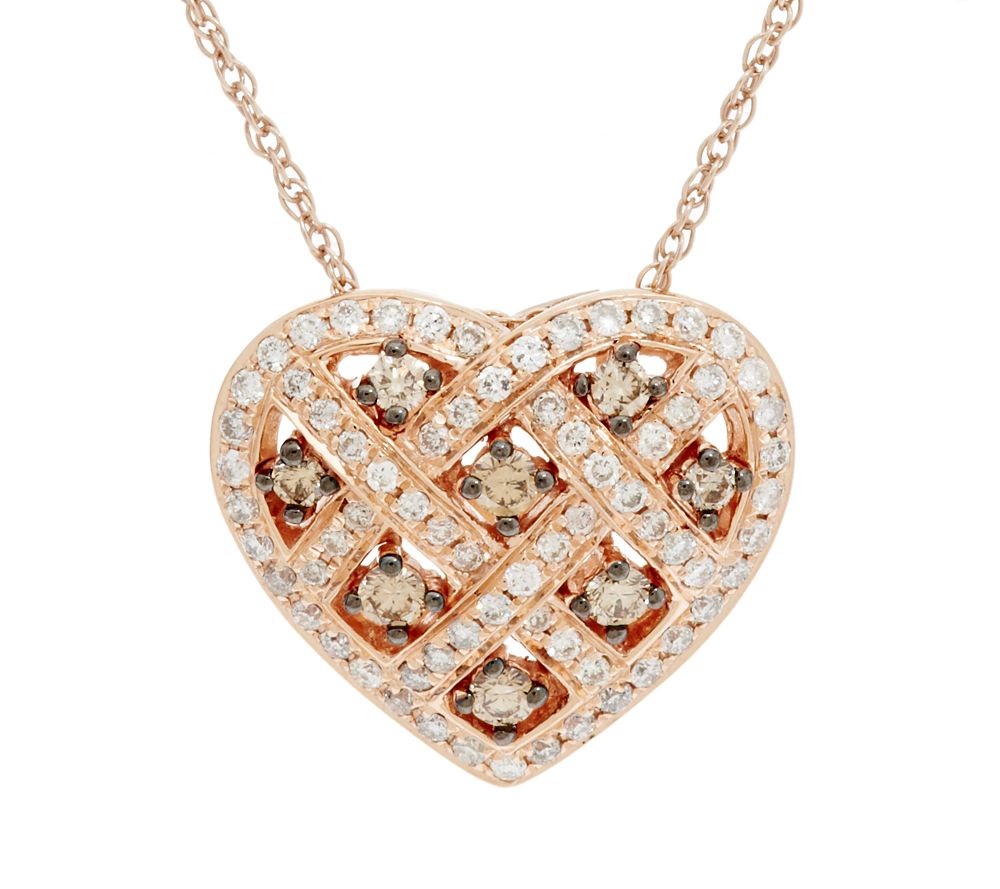 Heart-shaped pendant with a woven design; round champagne diamonds prong-set in black rhodium; round white diamonds bead-set in white rhodium; hidden bail