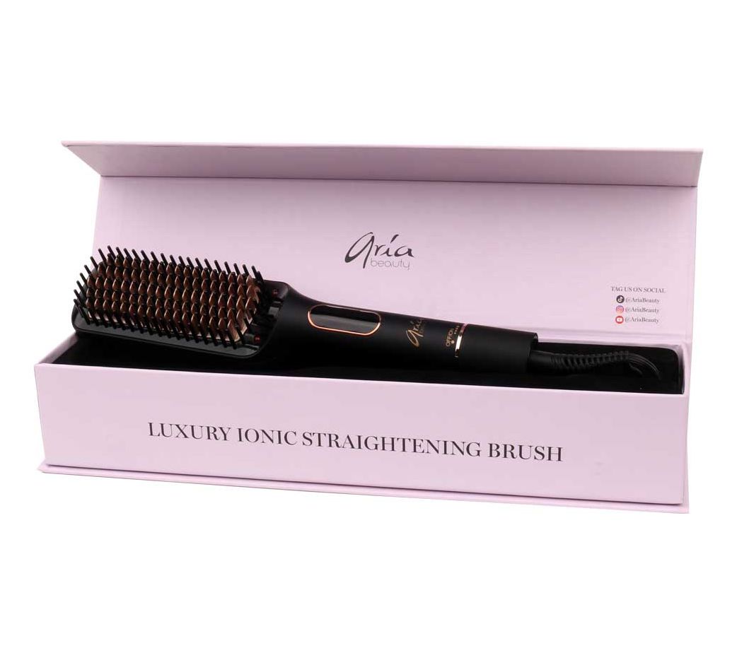 Transform your hair into a luxuriously soft, silky masterpiece with Aria Luxury Ionic Straightening Brush, the ultimate tool for achieving a sleek, professional blowout look in seconds. This hot brush is designed to glide effortlessly through your hair, smoothing and straightening with a single pass, thanks to its ultra-sleek tourmaline and ceramic plates. From Aria.