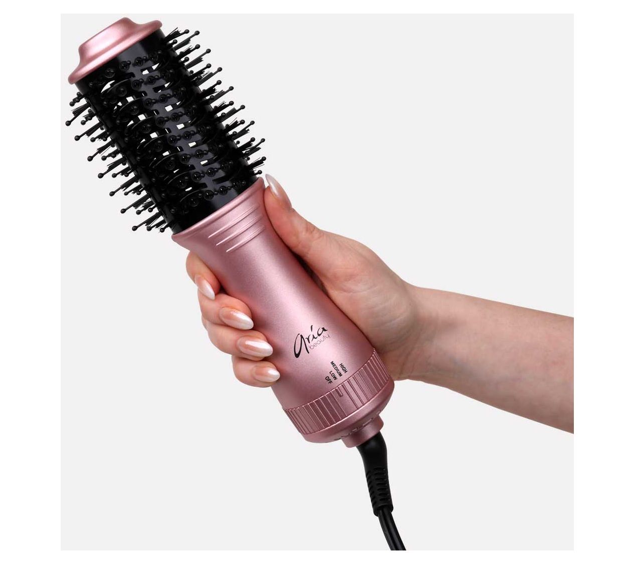 Let the Rose Gold Collection Mini Blowdry Brush powerhouse do the styling work for you. No more juggling your blow-dryer and round brush! Aria Beauty's gentle tourmaline barrel and dual-bristle design expertly smooths and volumizes hair as you dry, creating a polished finish on all hair types. No experience is necessary for salon standard blowouts every time!