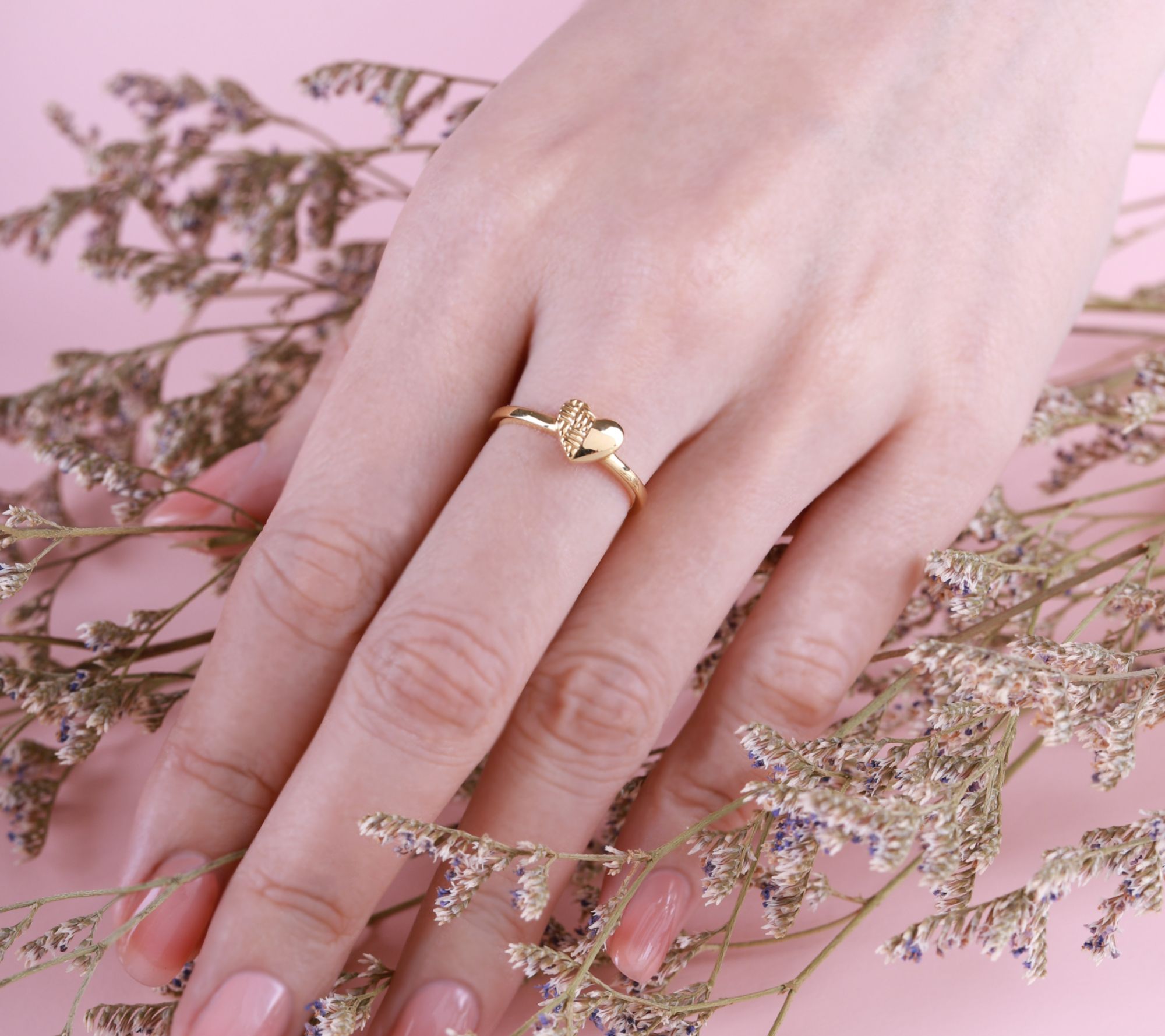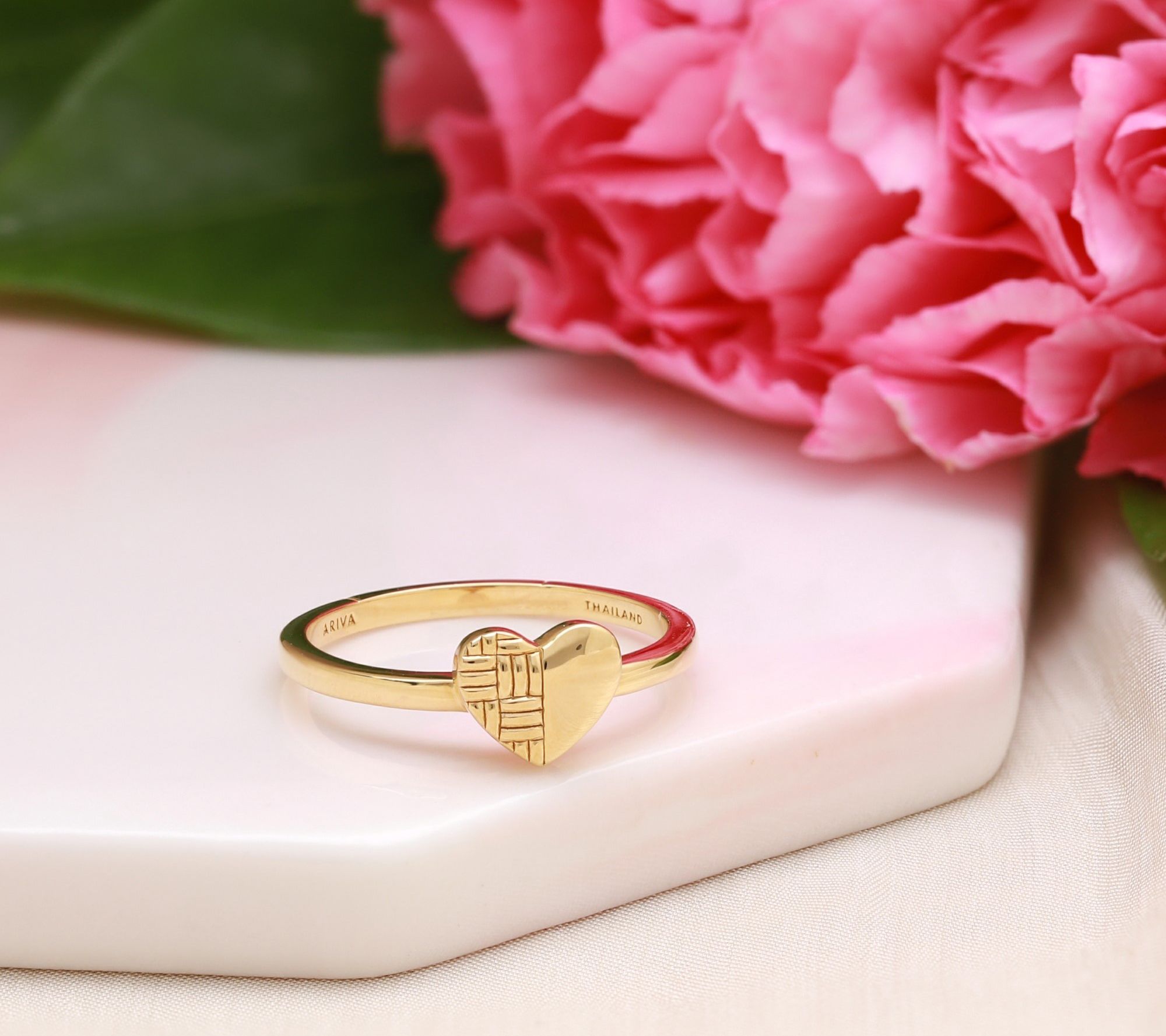 • Heart ring with basket-weave texture on one half and a high-polish finish on the other