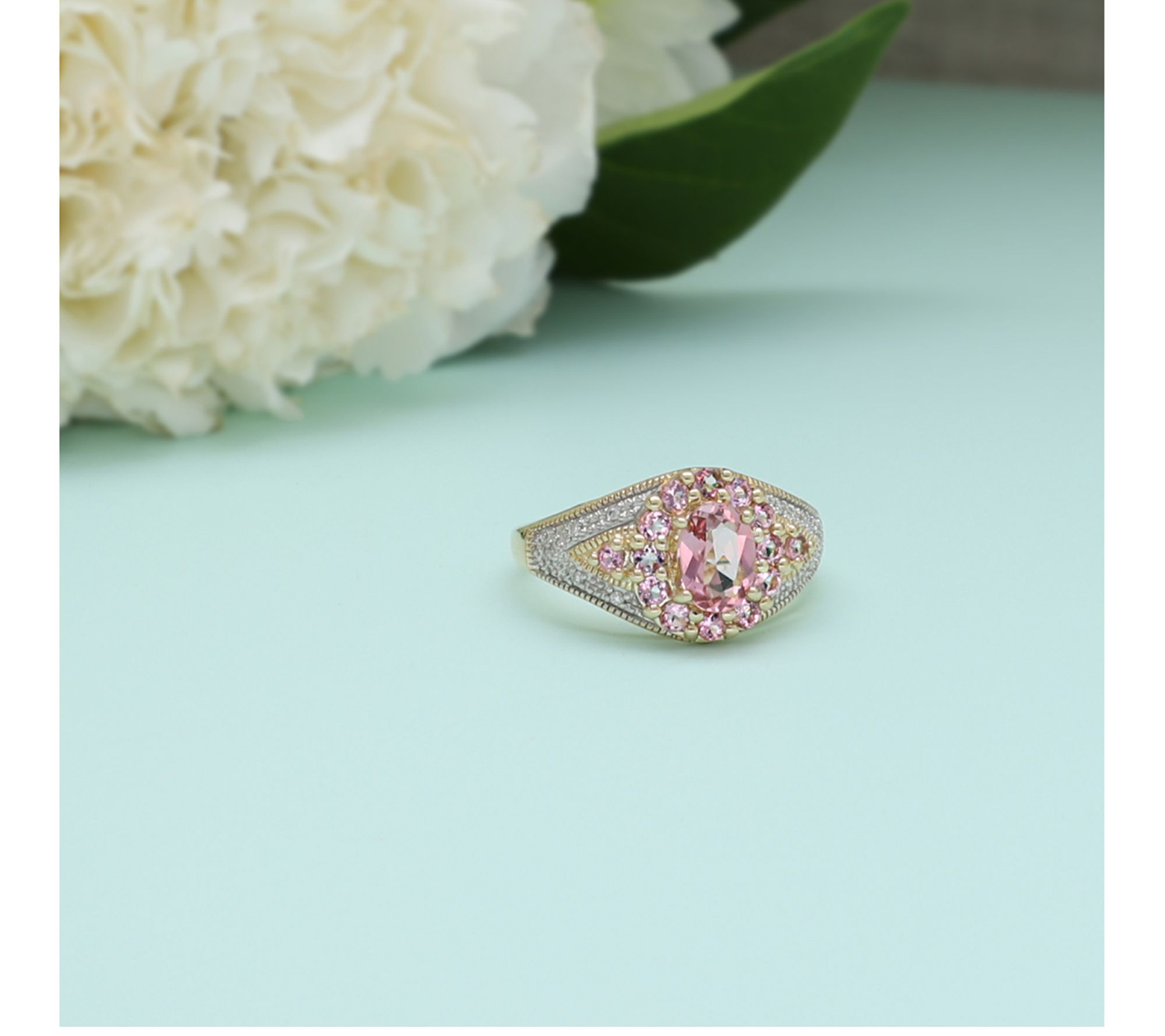 Oval prong-set pink tourmaline in center; surrounded by small, round pink tourmaline frame; pave-set diamonds