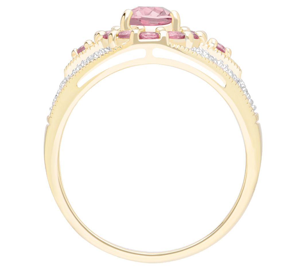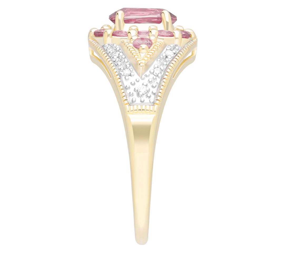 A radiant pink tourmaline centerpiece takes center stage on this radiant ring, surrounded by a frame of smaller pink tourmaline to complete the sweet style. Pave-set diamonds add an elegant touch, making this ring a timeless addition to your jewelry collection. From Ariva.