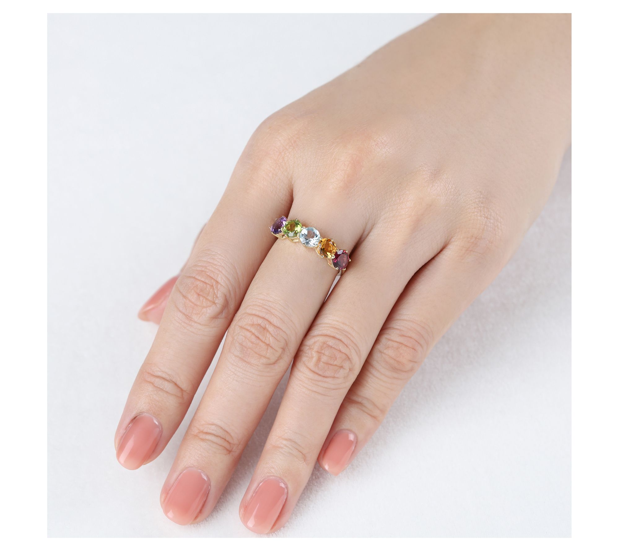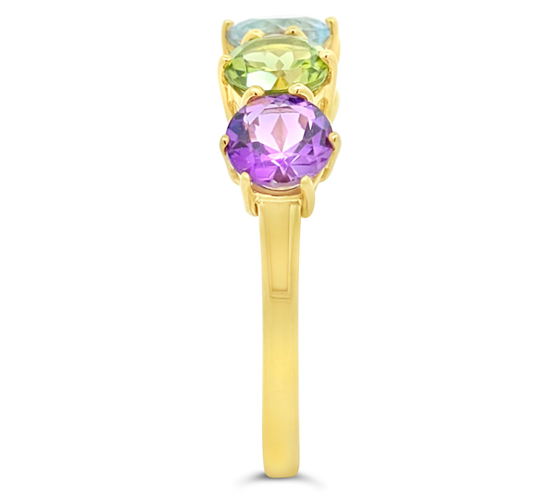 Round prong-set rhodolite, citrine, sky blue topaz, peridot, and amethyst gemstones