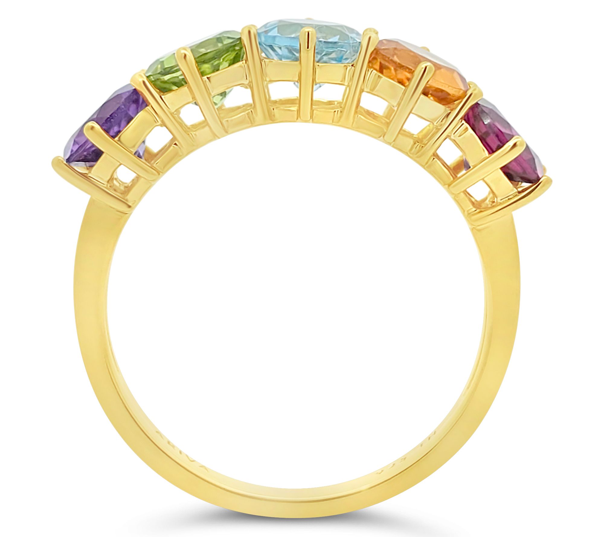 Brighten any occasion with this multi-gemstone band ring. The piece beautifully captures the dazzling hues of rhodolite, citrine, sky blue topaz, peridot, and amethyst. From Ariva.