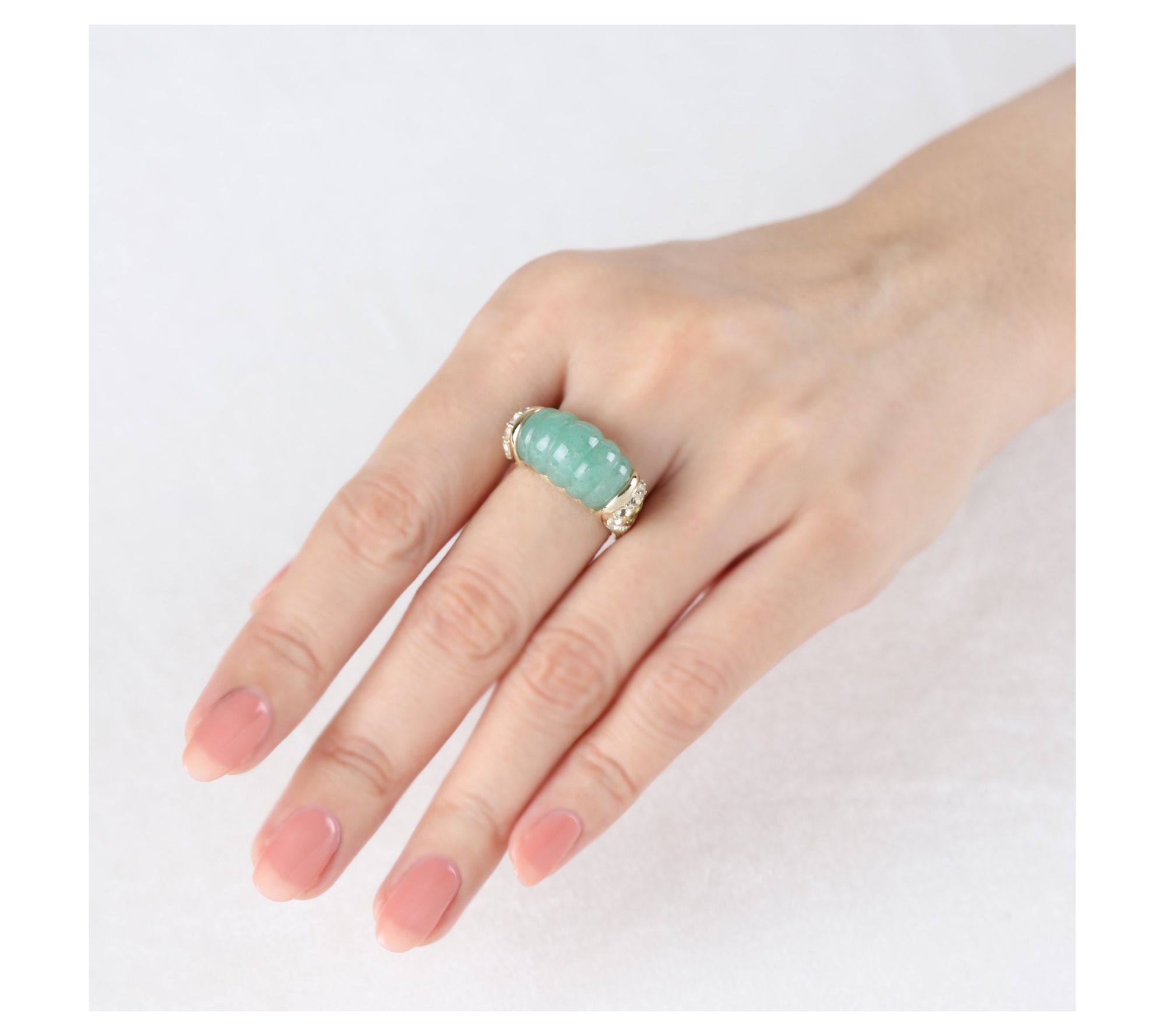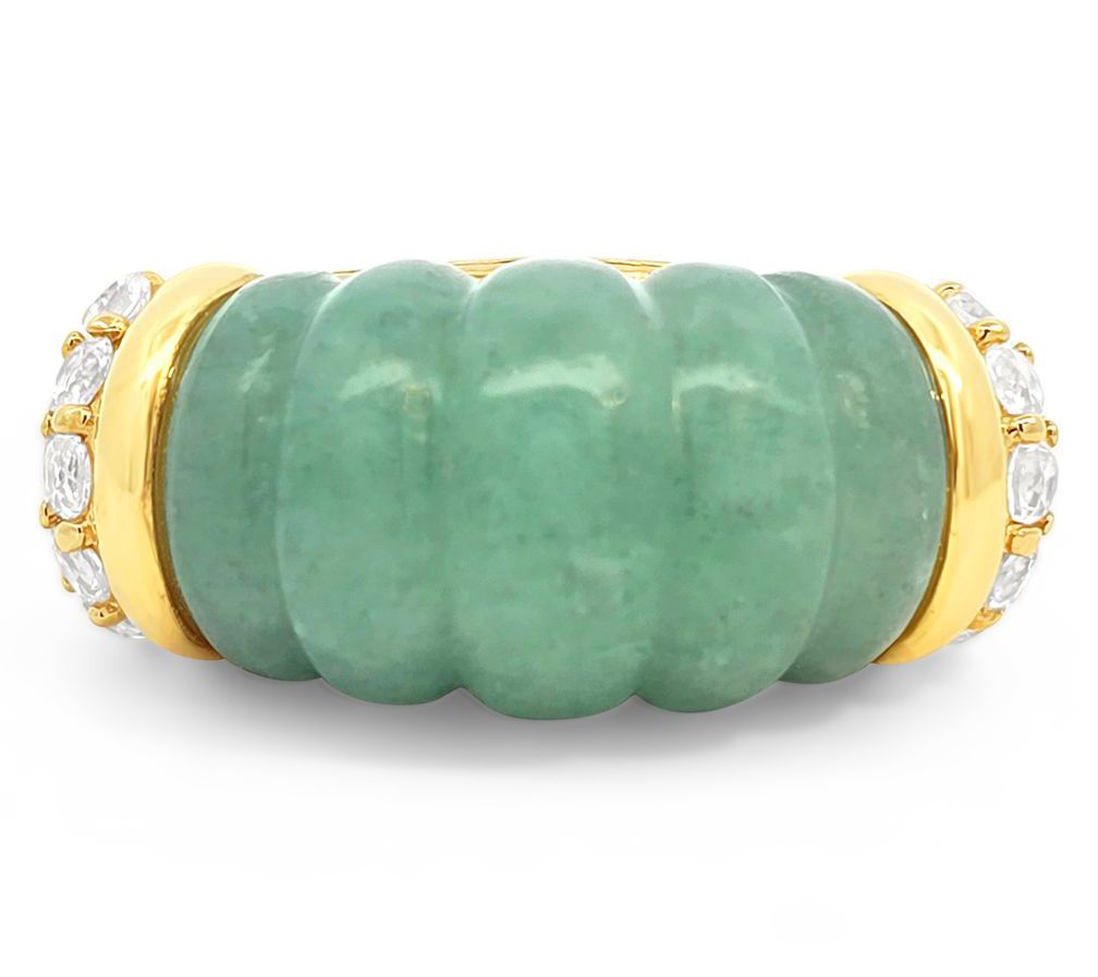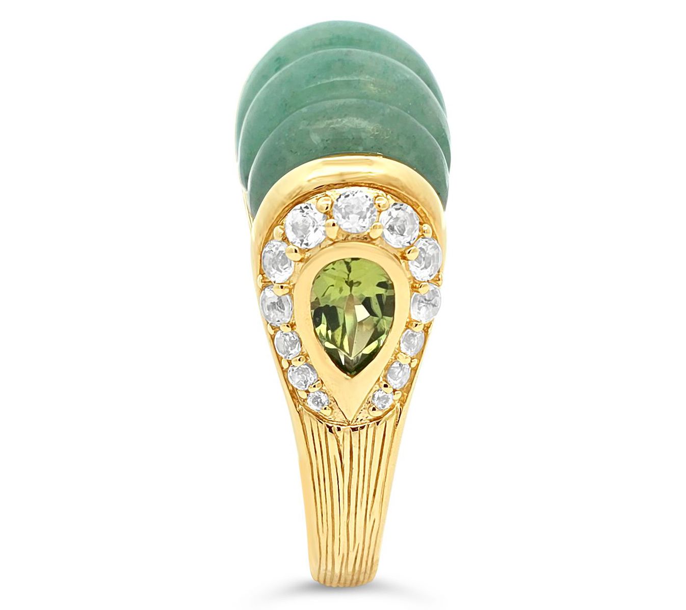 When youâre ready to make a statement, this vibrant piece promises to catch eyes and spark conversations. Picture yourself at a summer garden party, with the ribbed aventurine stone capturing the essence of natureâs beauty, accented by pear-shaped peridot and round white topaz stones. The silk-textured shank offers a unique finish, making it an elegant yet daring choice. From Ariva.