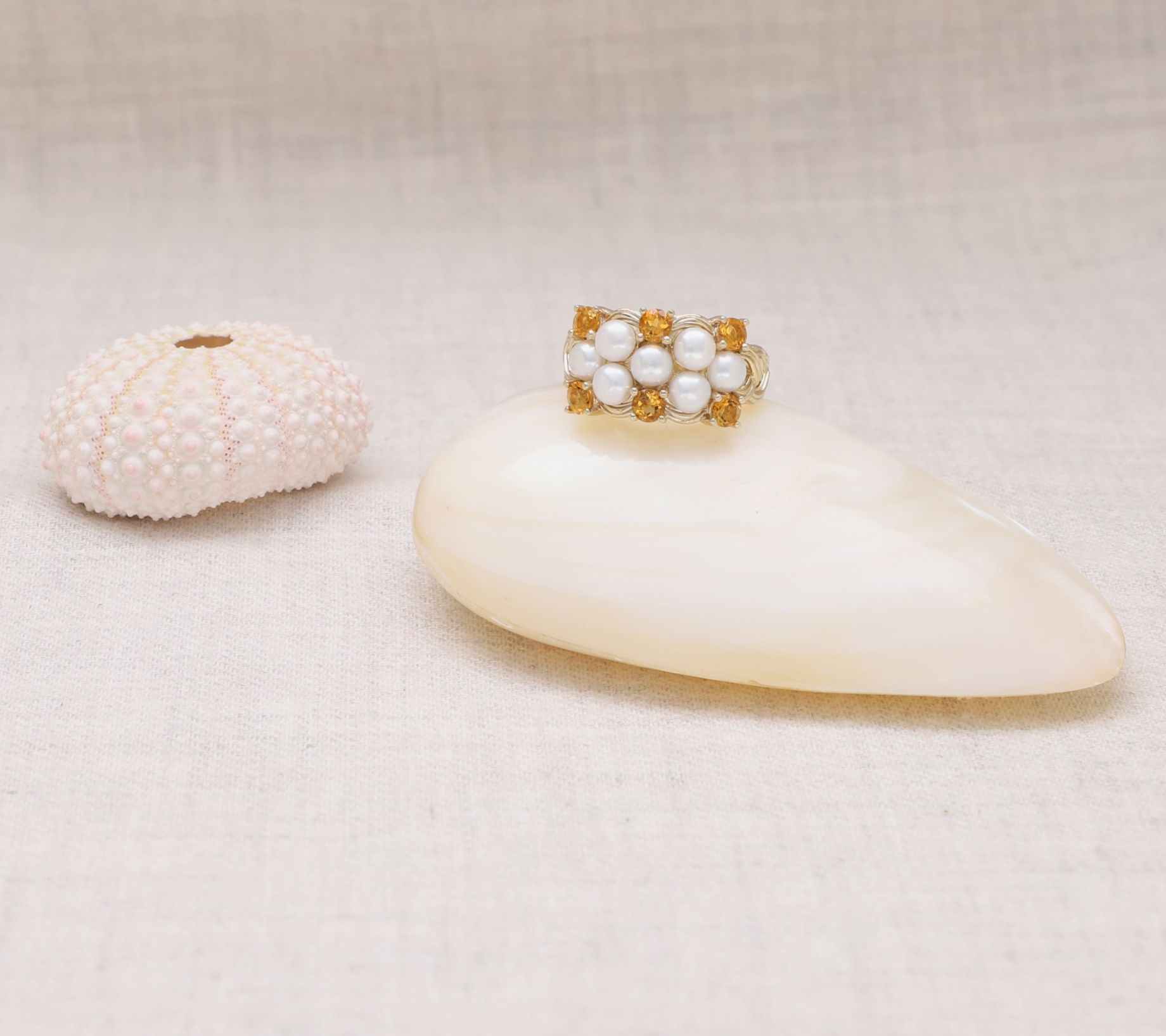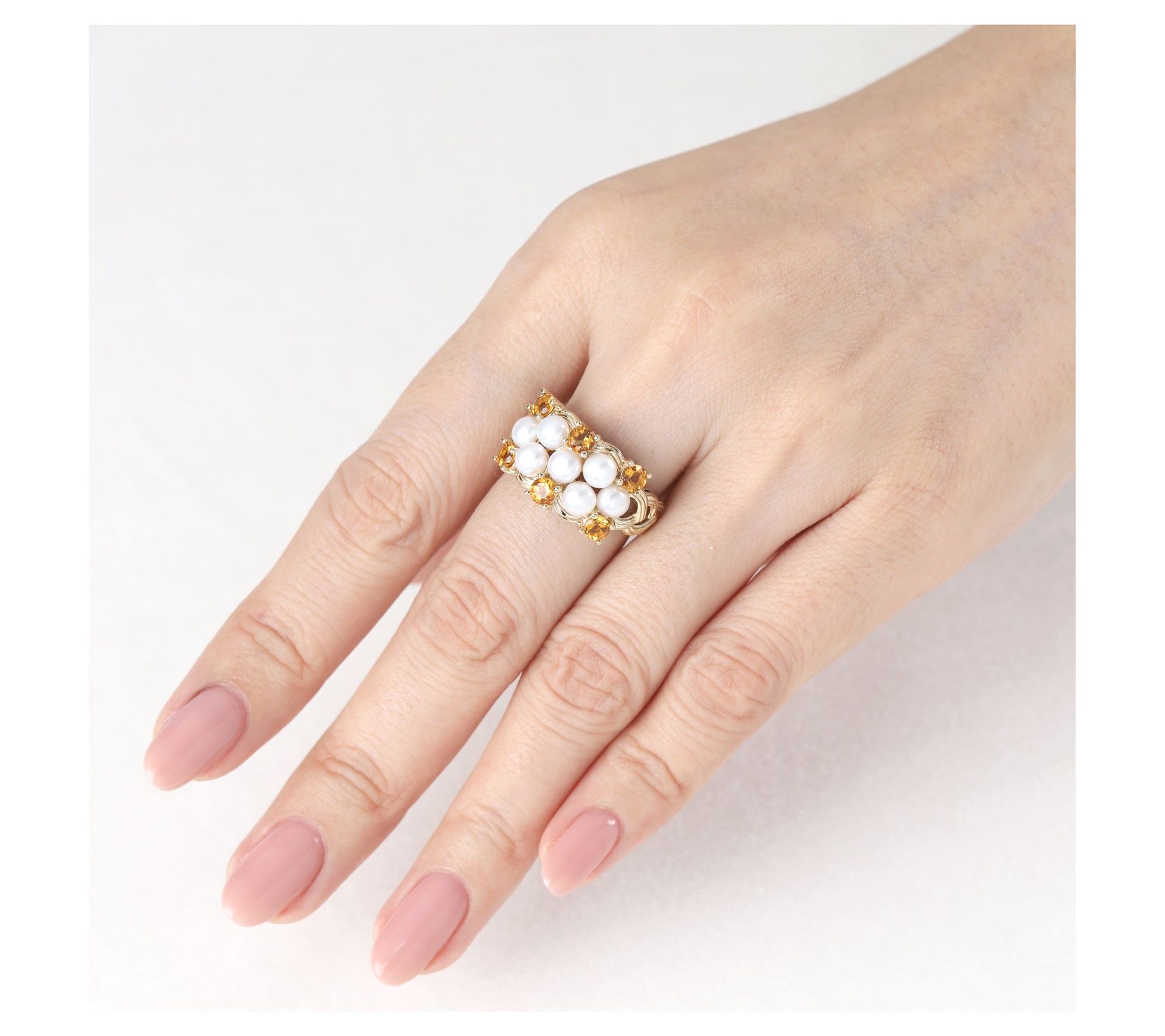 Sip your morning latte or toast at a weekend brunch, and let this gleaming ring with cultured freshwater pearls and vibrant citrine gemstones infuse your look with a hint of sunshine. The silk-textured braid shank wraps your finger in intricate artistry, pairing effortlessly with stacked bands or standing out solo for any occasion. From Ariva.