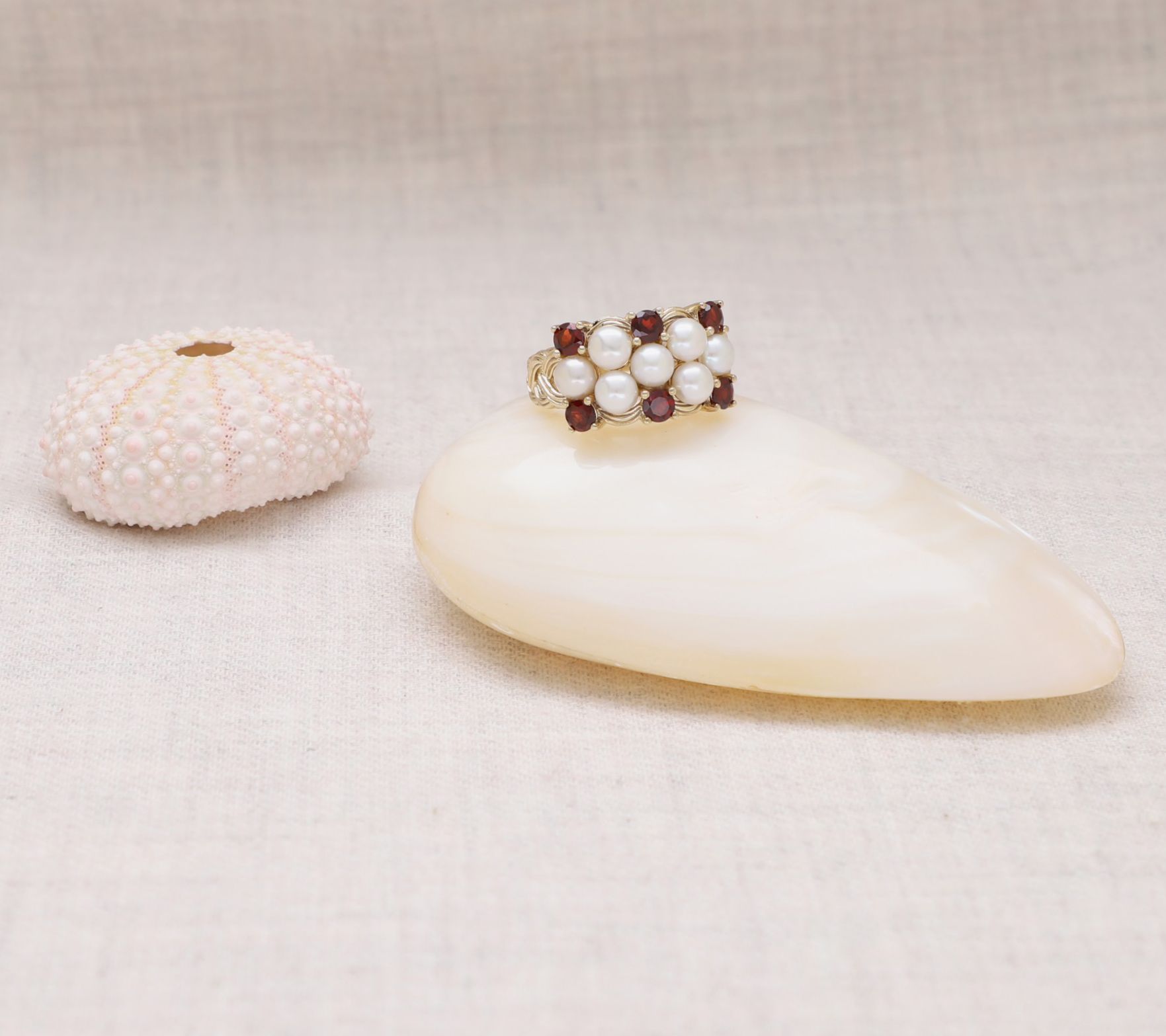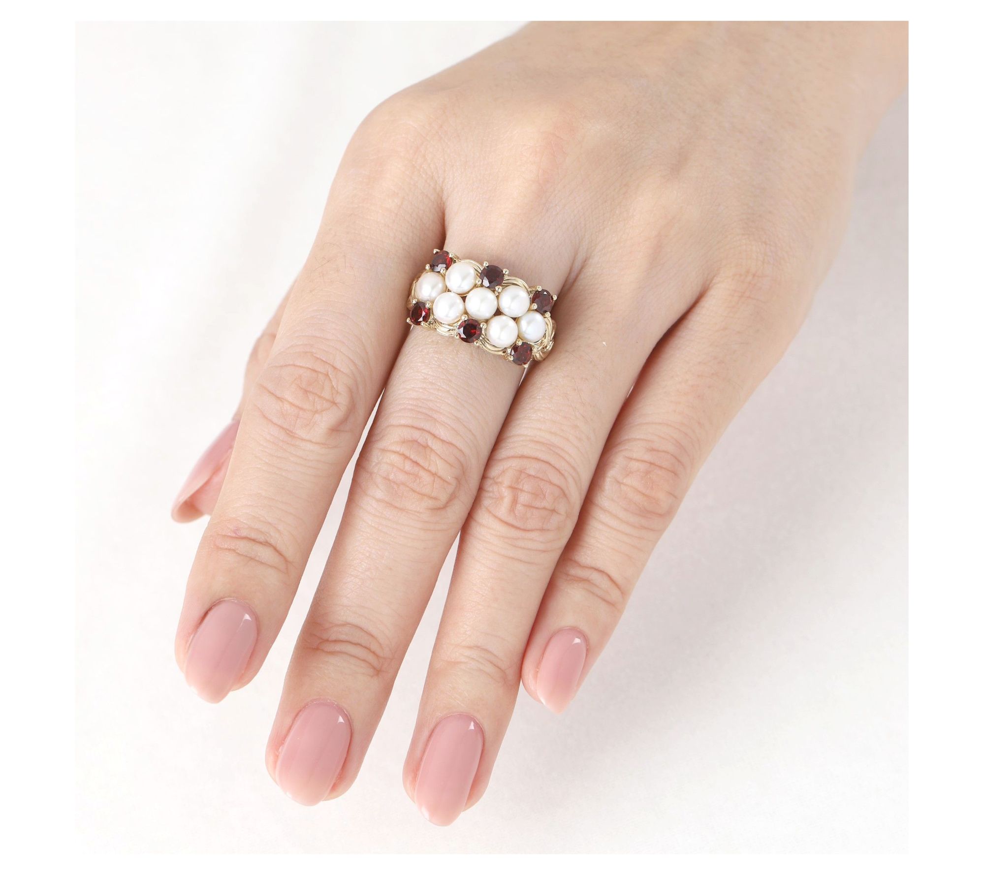 A night out calls for just the right statement, and this ring delivers with glowing cultured freshwater pearls accented by vibrant garnet gemstones. Braided silk-like textures on the shank add rich detail, making it easy to dress up denim or complement a favorite dress. From Ariva.